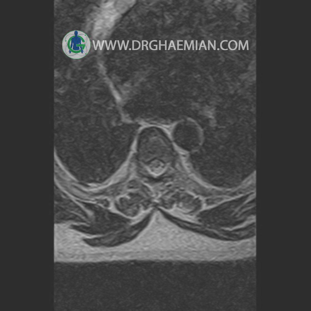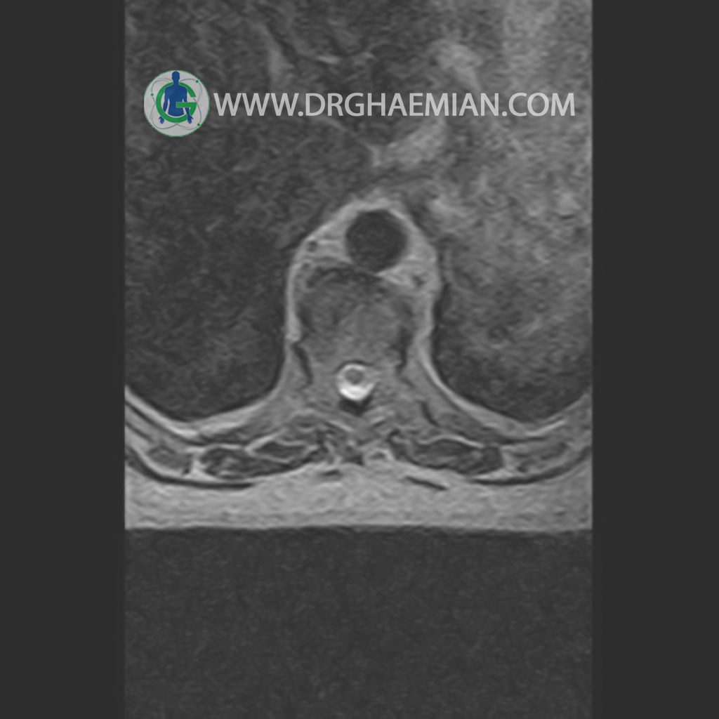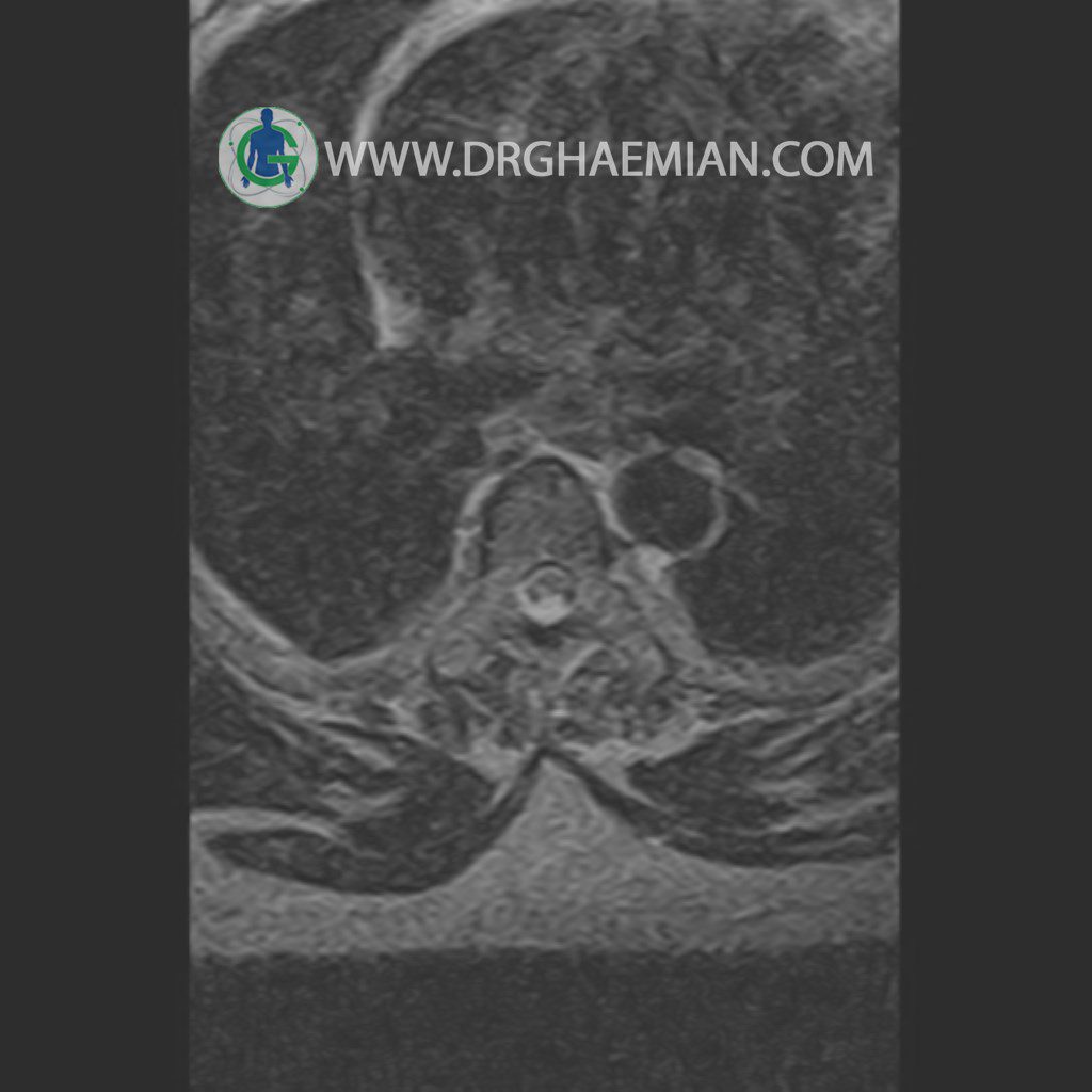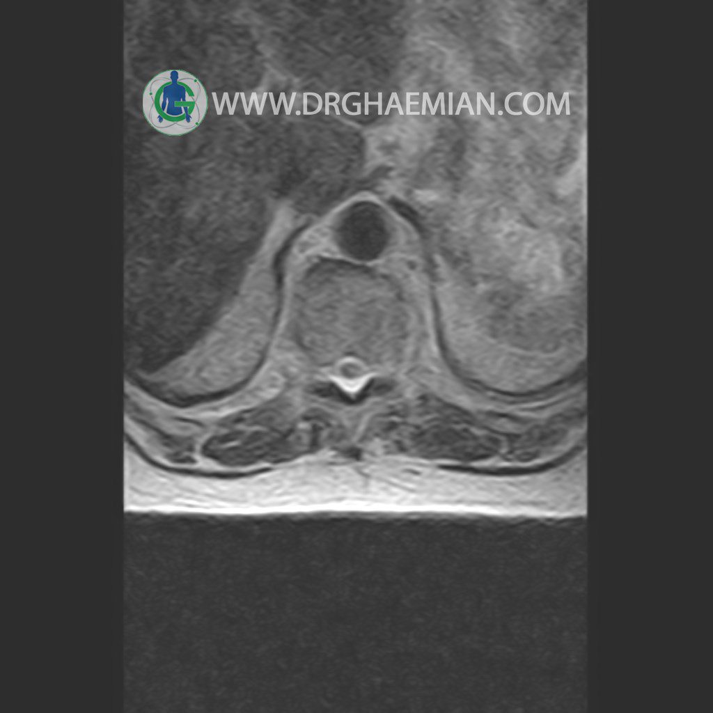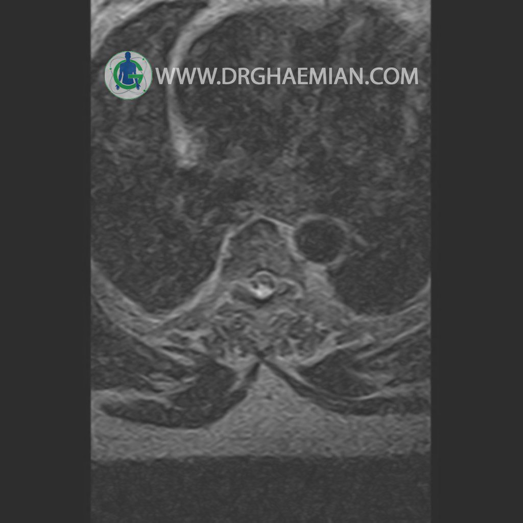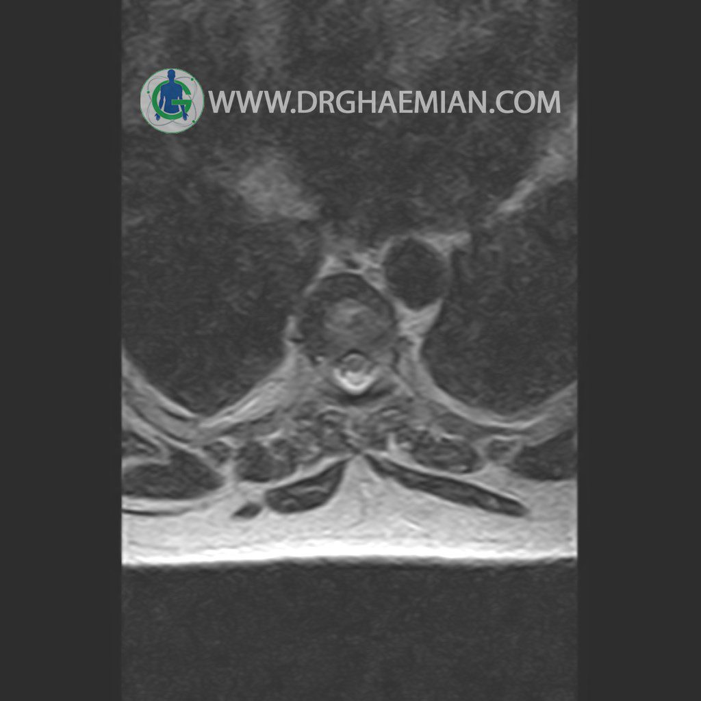 پزشکان اغلب از تصویربرداری ام آر آی برای تشخیص و درمان عارضه های پزشکی که فقط با استفاده از اشعه ایکس یا میدان مغناطیسی و امواج رادیویی قابل مشاهده است، استفاده می کنند. دستگاه ام آر آی تصاویر دقیق از ساختار های داخلی بدن ایجاد می کند. در این کیس مهره انتقالی در مهره L5/S1 به همراه هیپرکیفوز و اسپوندیلوز توراسیک و همانژیوم در مهره T10 و گره اشمرول در مهره L2 دیده می شود. علاوه بر آن تنگی مهره در مهره L3، اسپوندیلوز ، دیهادریته دیسک و بیرون زدگی در مهره ای T11/T12, L1/L2/L3, L4/L5 مشاهد شده.
