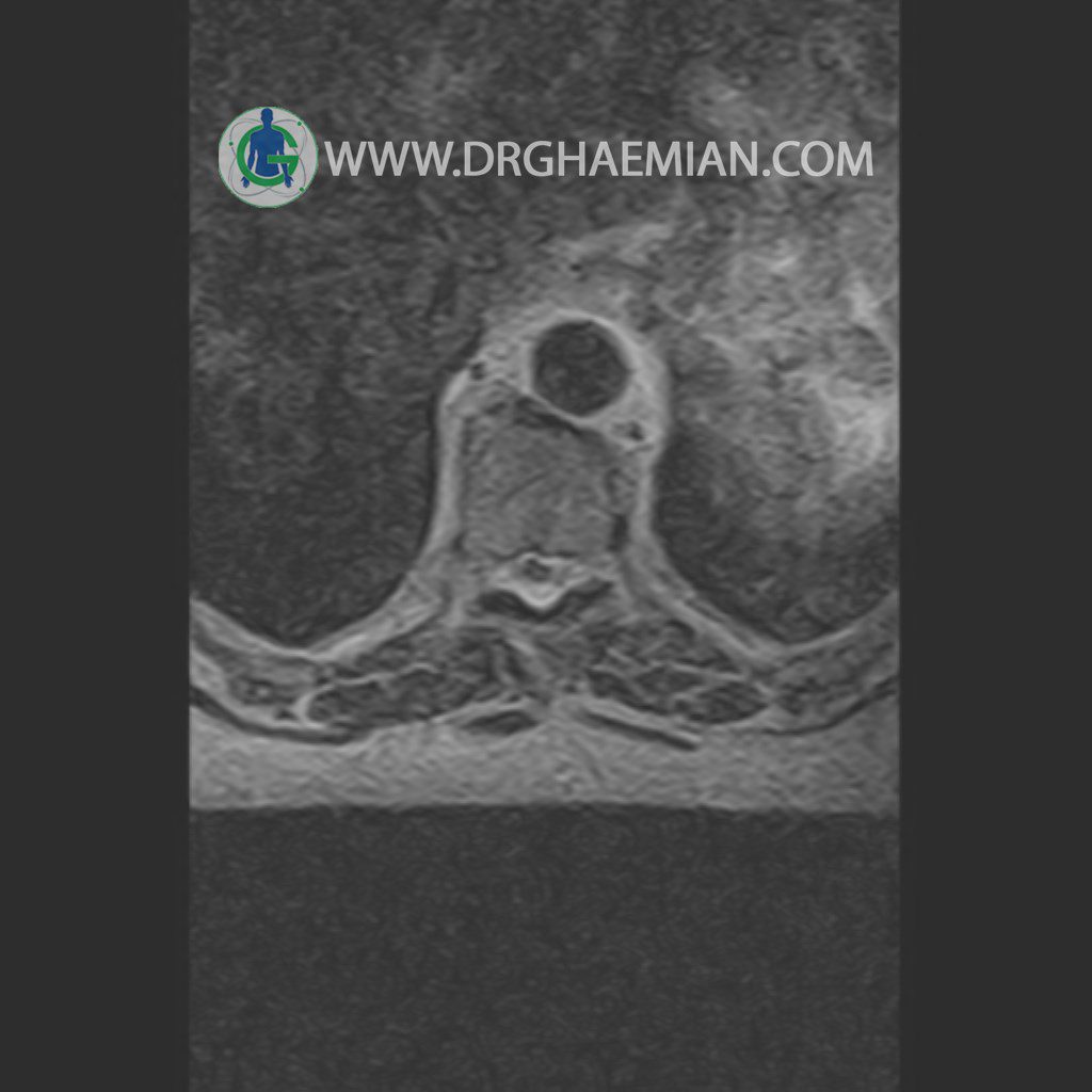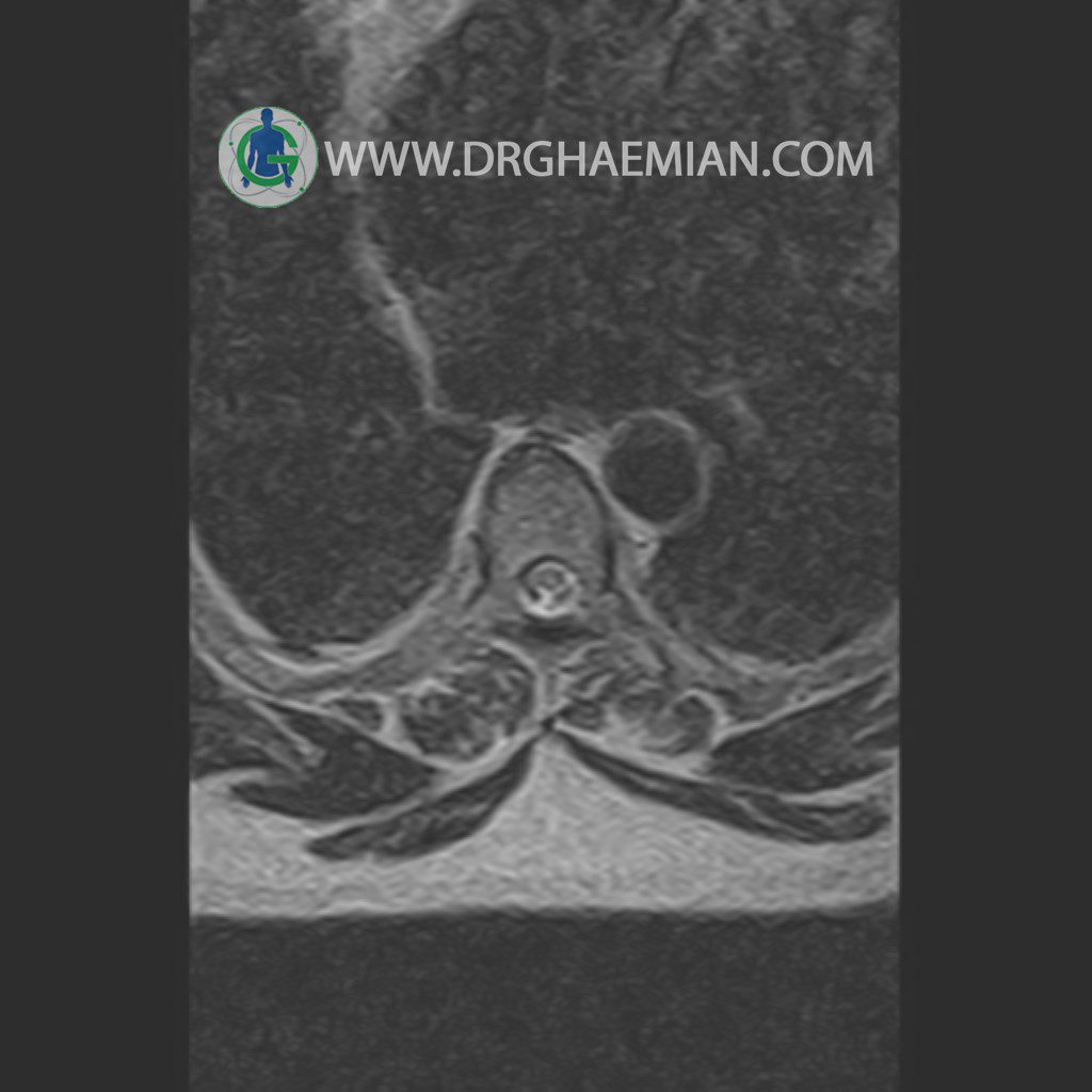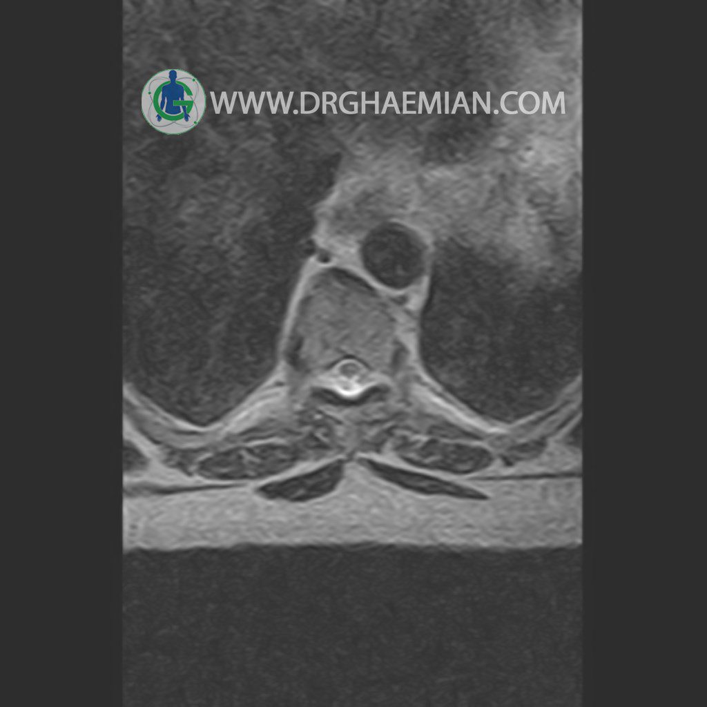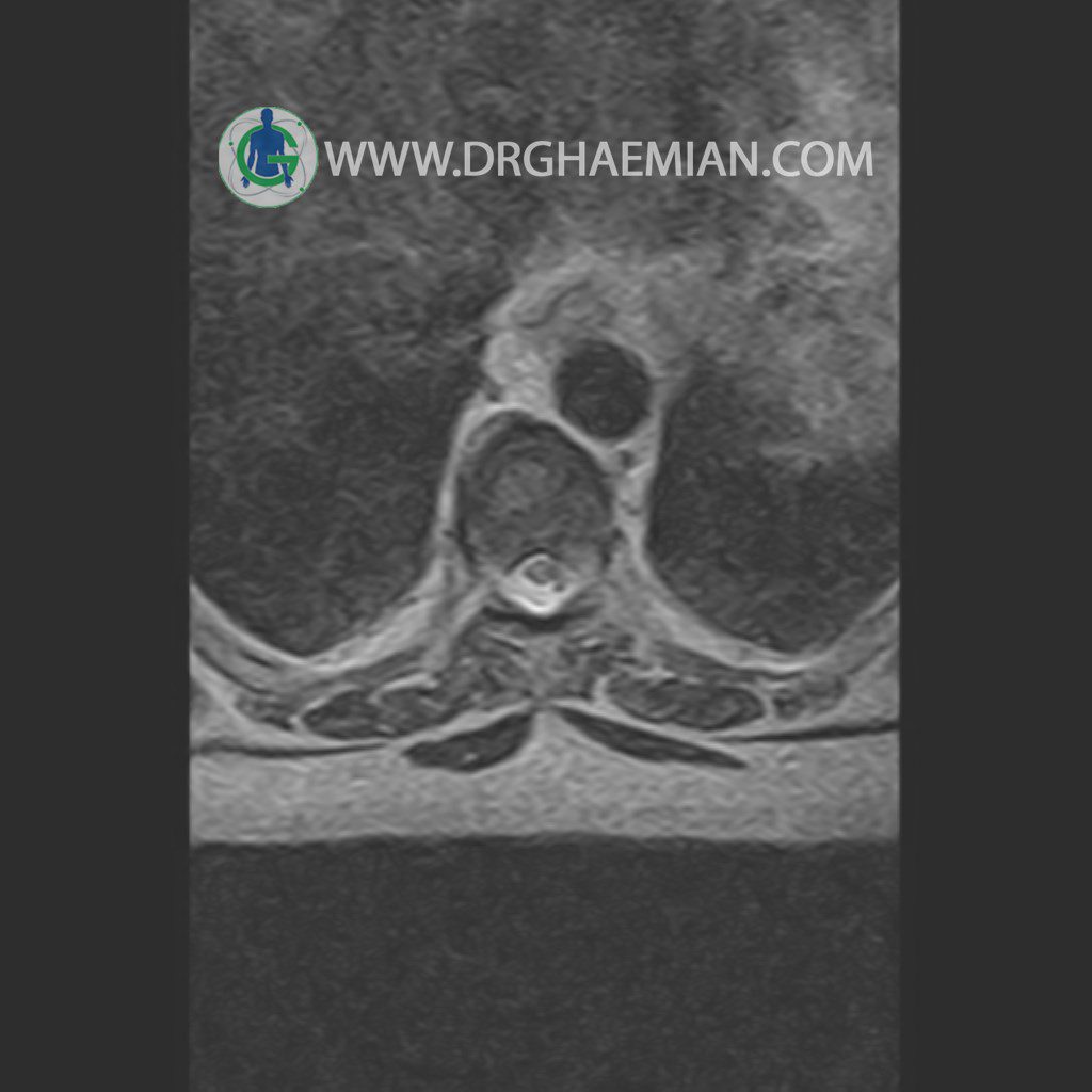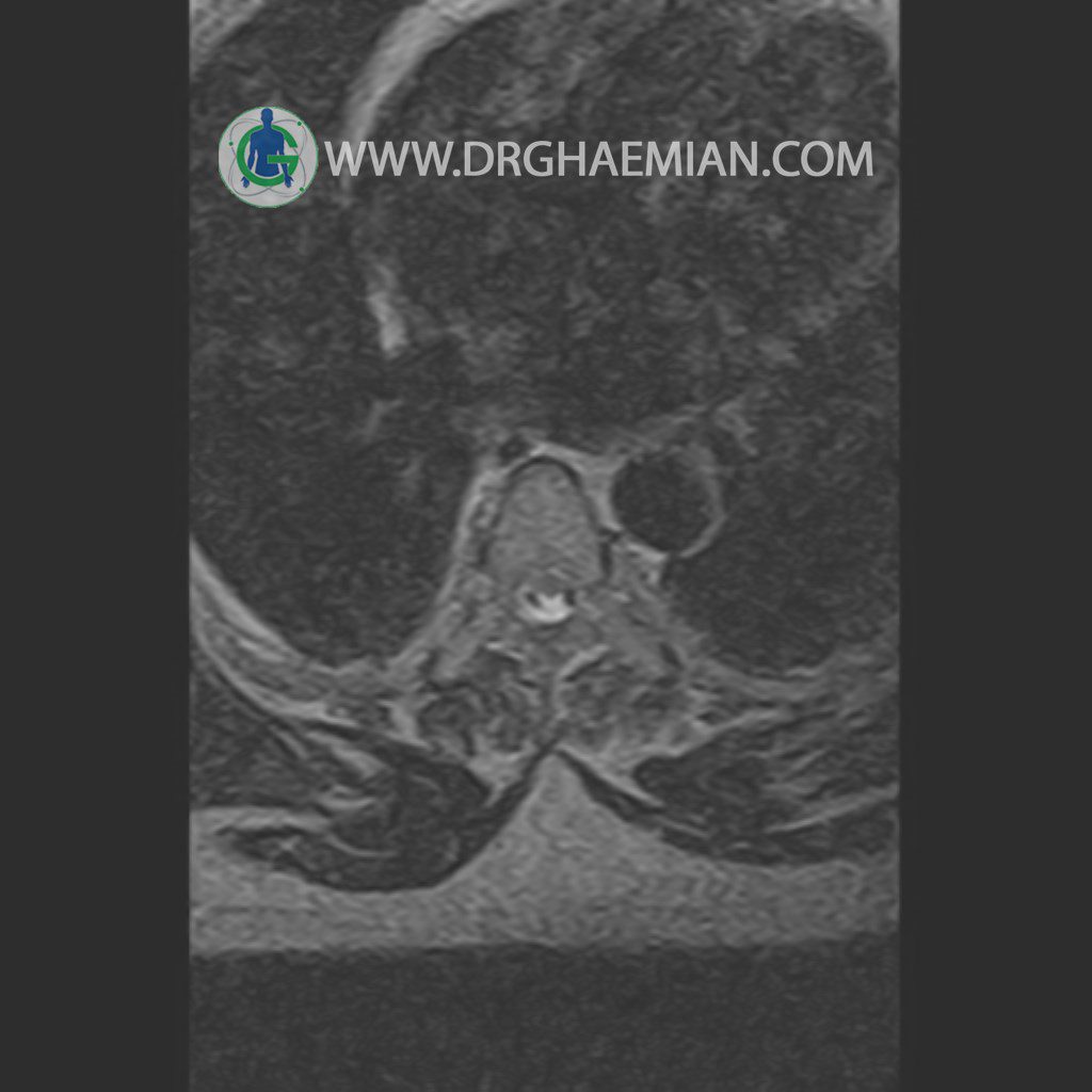 پزشکان اغلب از تصویربرداری ام آر آی برای تشخیص و درمان عارضه های پزشکی که فقط با استفاده از اشعه ایکس یا میدان مغناطیسی و امواج رادیویی قابل مشاهده است، استفاده می کنند. دستگاه ام آر آی تصاویر دقیق از ساختار های داخلی بدن ایجاد می کند. در این کیس مهره انتقالی در مهره L5/S1 به همراه هیپرکیفوز و اسپوندیلوز توراسیک و همانژیوم در مهره T10 و گره اشمرول در مهره L2 دیده می شود. علاوه بر آن تنگی مهره در مهره L3، اسپوندیلوز ، دیهادریته دیسک و بیرون زدگی در مهره ای T11/T12, L1/L2/L3, L4/L5 مشاهد شده.