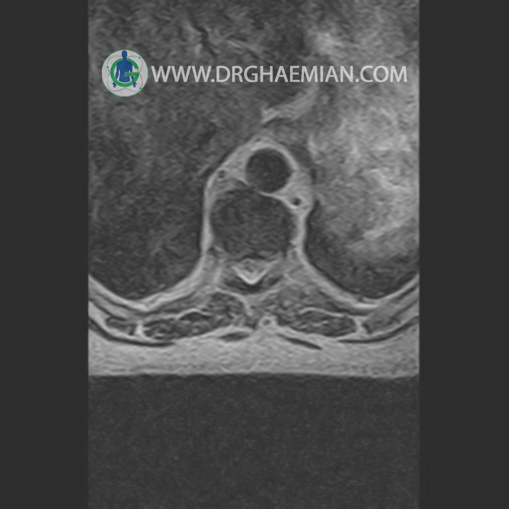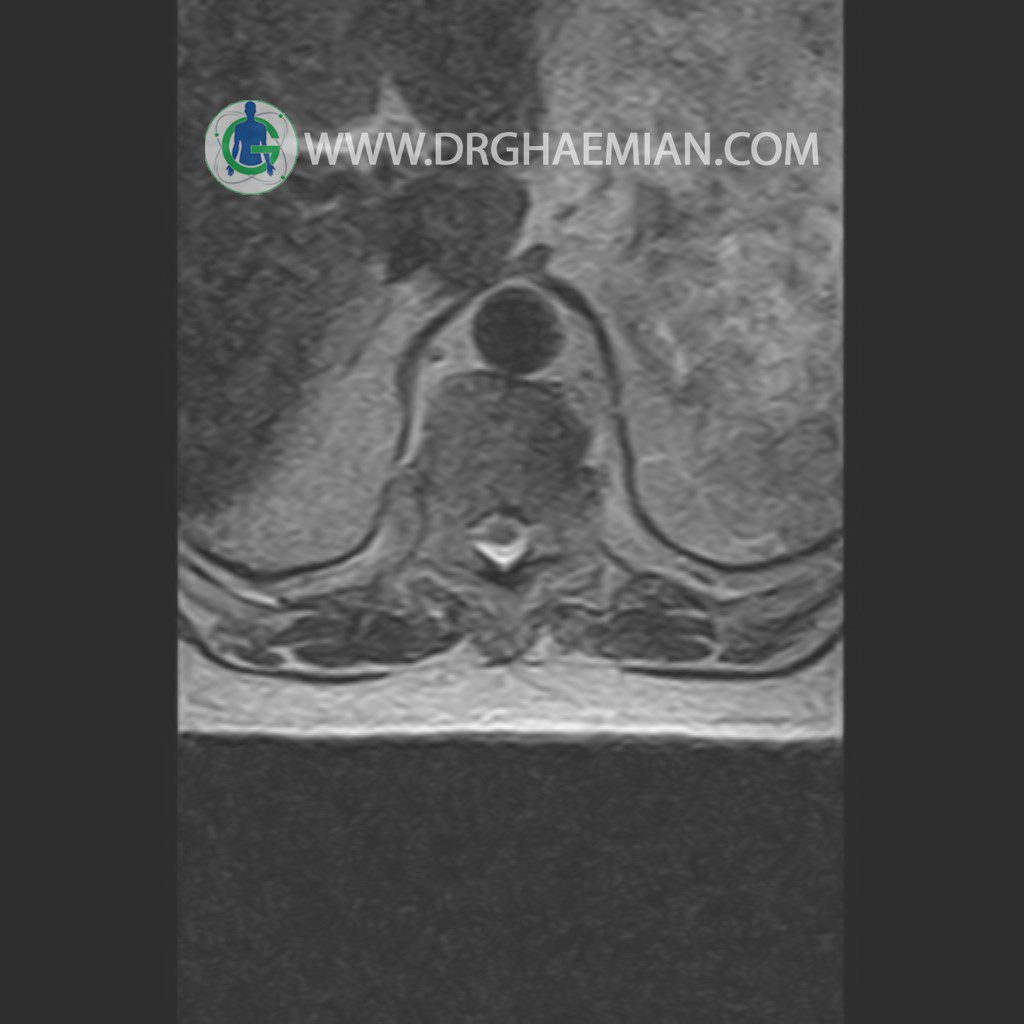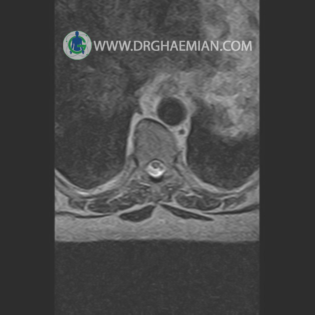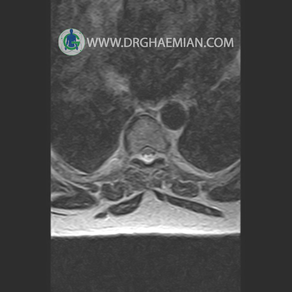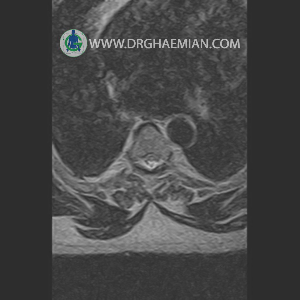 پزشکان اغلب از تصویربرداری ام آر آی برای تشخیص و درمان عارضه های پزشکی که فقط با استفاده از اشعه ایکس یا میدان مغناطیسی و امواج رادیویی قابل مشاهده است، استفاده می کنند. دستگاه ام آر آی تصاویر دقیق از ساختار های داخلی بدن ایجاد می کند. در این کیس مهره انتقالی در مهره L5/S1 به همراه هیپرکیفوز و اسپوندیلوز توراسیک و همانژیوم در مهره T10 و گره اشمرول در مهره L2 دیده می شود. علاوه بر آن تنگی مهره در مهره L3، اسپوندیلوز ، دیهادریته دیسک و بیرون زدگی در مهره ای T11/T12, L1/L2/L3, L4/L5 مشاهد شده.
