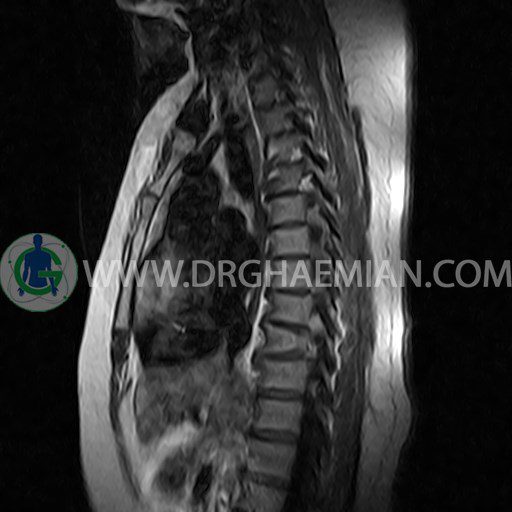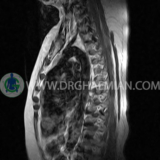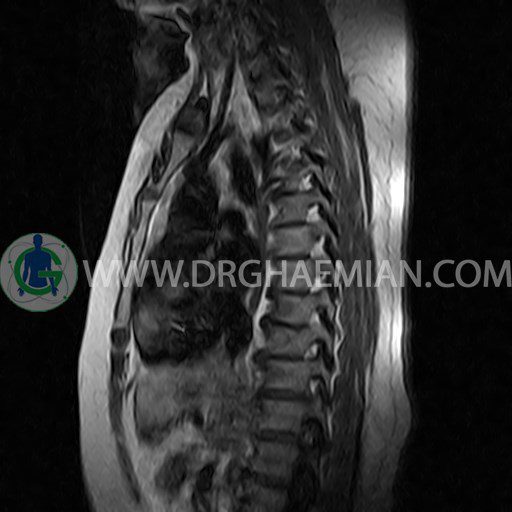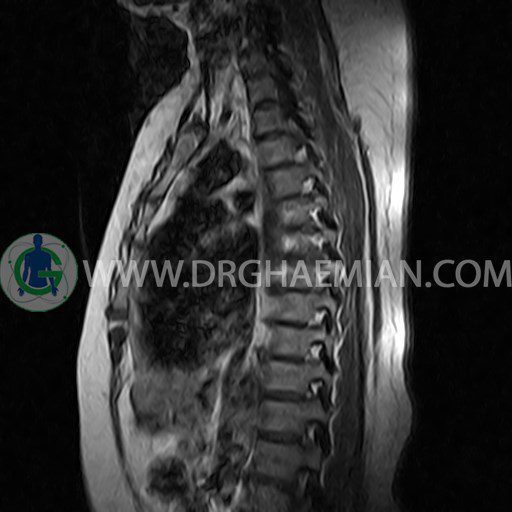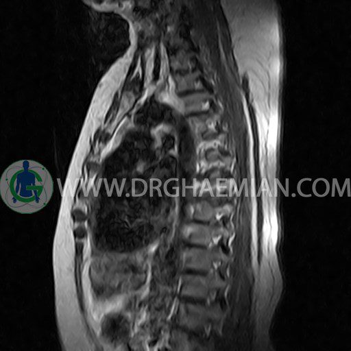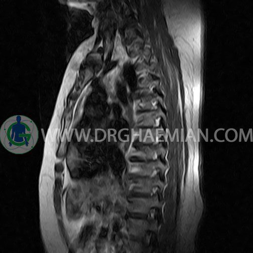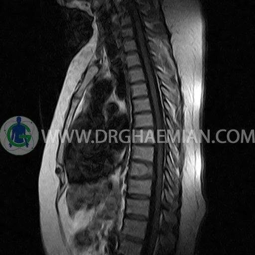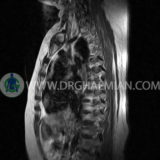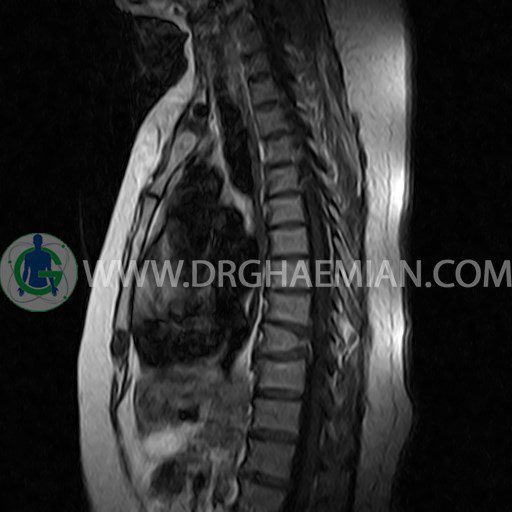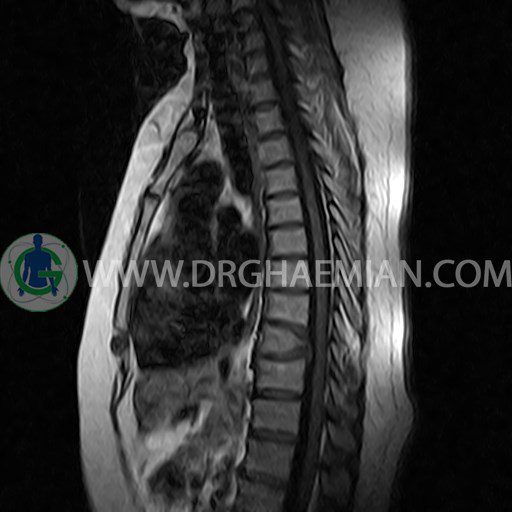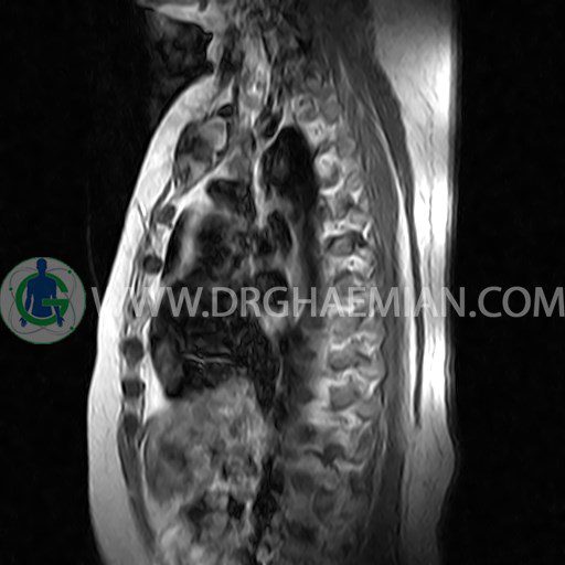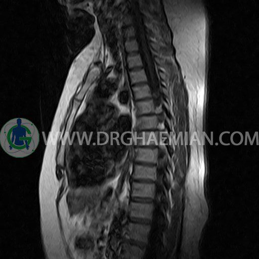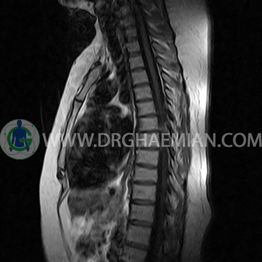 پزشکان اغلب از تصویربرداری ام آر آی برای تشخیص و درمان عارضه های پزشکی که فقط با استفاده از اشعه ایکس یا میدان مغناطیسی و امواج رادیویی قابل مشاهده است، استفاده می کنند. دستگاه ام آر آی تصاویر دقیق از ساختار های داخلی بدن ایجاد می کند. در این کیس مهره پروانه ای ناقص توراسیک در مهره T9؛ اسکولیوز، اسپوندیلوز، دهیدراته و بیرون زندگی مهره های میان توراسیک؛ اسپوندیلوز، دیهیدراته، بیرون زدگی به همراه فشردگی در مهره های T9/T10؛ اسپوندیلوز، باریک شدن فضای دیسک، دیهیدراته و بیرون زدگی در مهره های T12/L1/L2/L3/L4؛ دیهیدرانه، بیرون زدگی و تنگی کانال در دیسک L4.L5 و کیست کورتیکال کوچکی در کلیه راست مشاهده می شود.