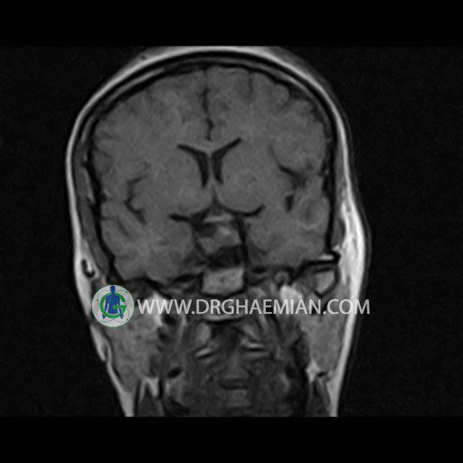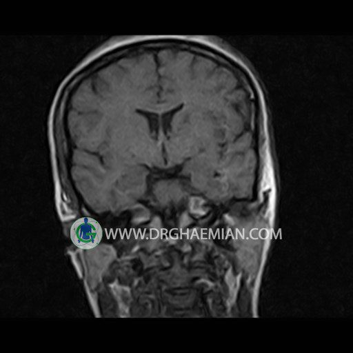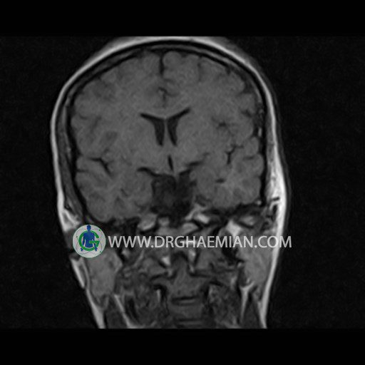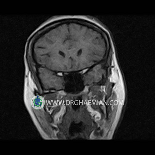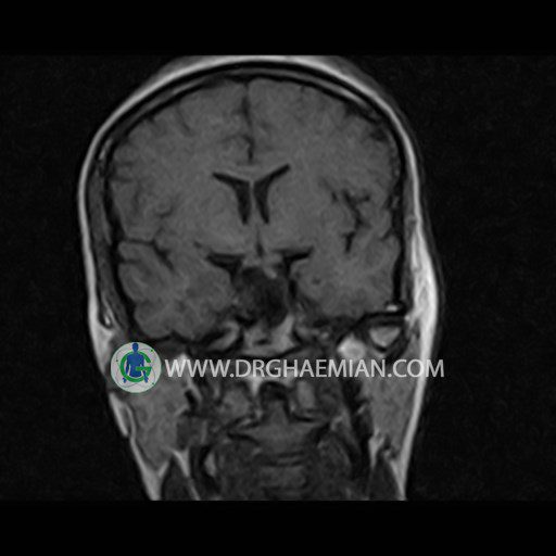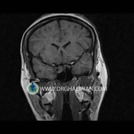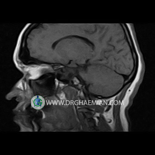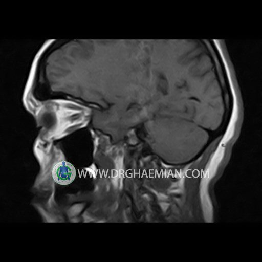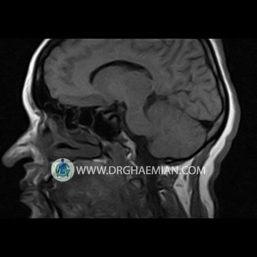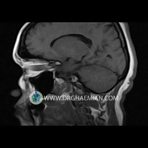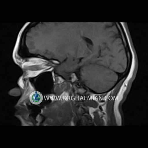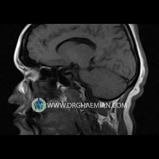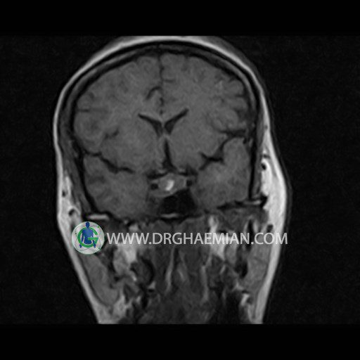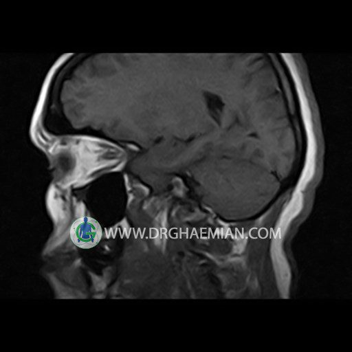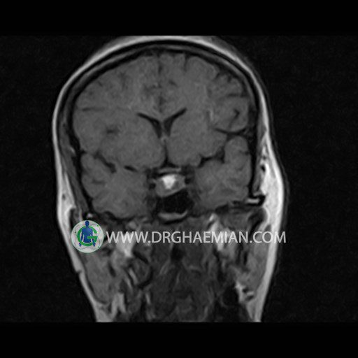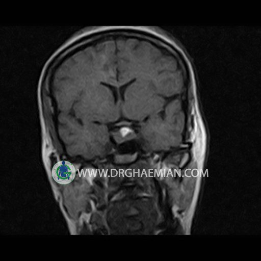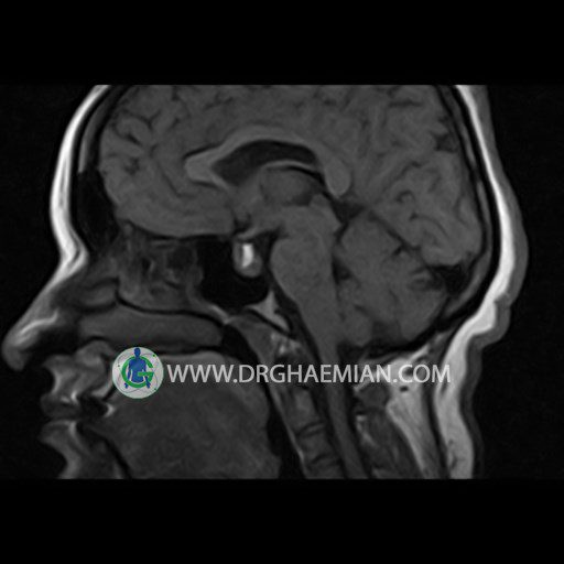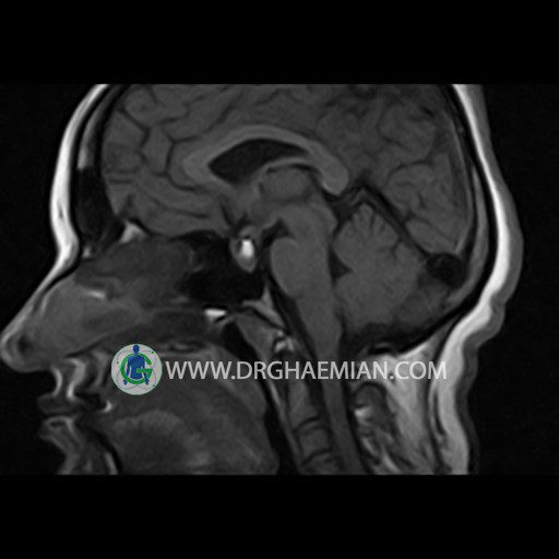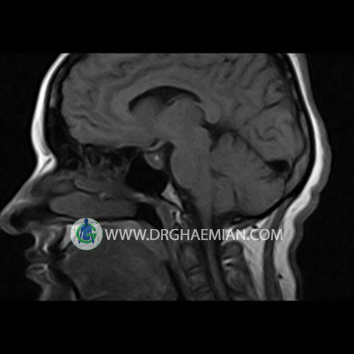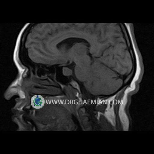 – A well – defined mass like lesion ( 8 x 9 mm ) in central portion of pituitary gland ( intermediate T1 , high T2) suggestive for pituitary microadenoma with cystic degeneration & hemorrhage
