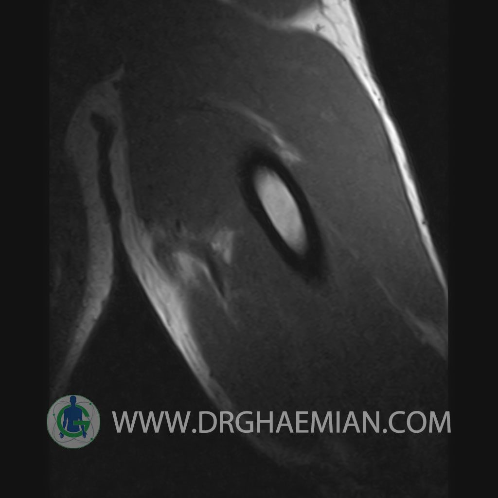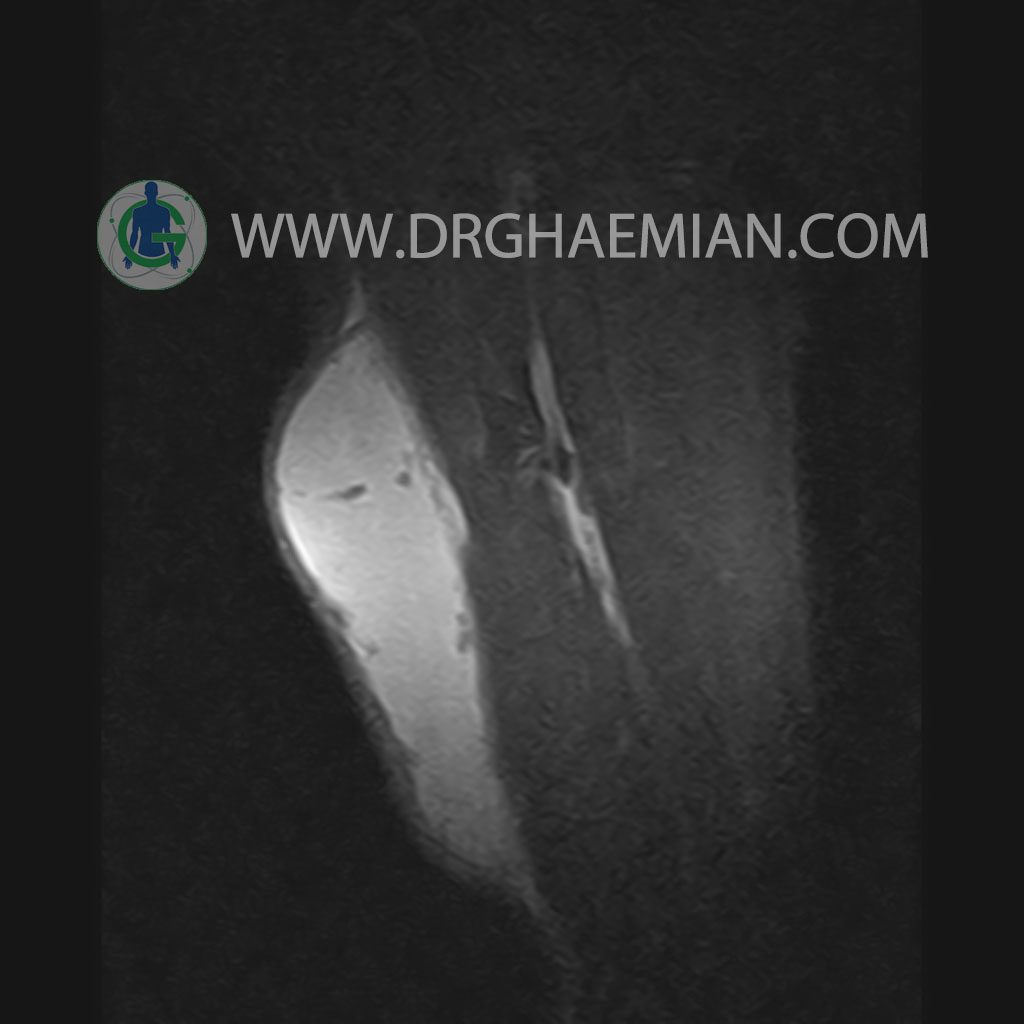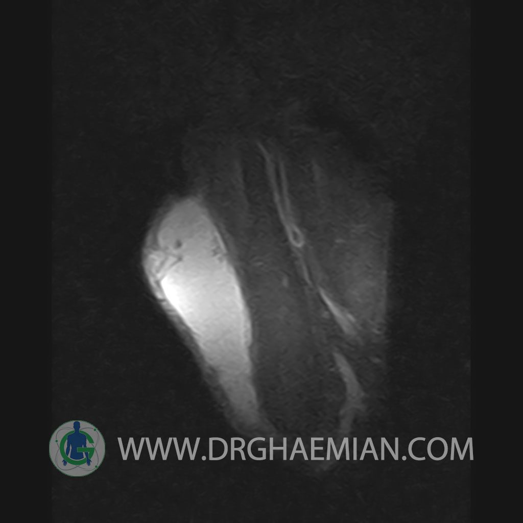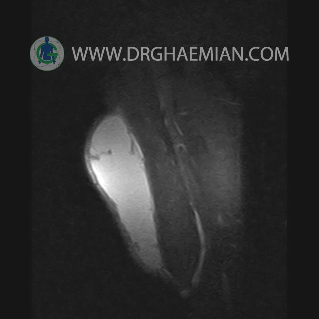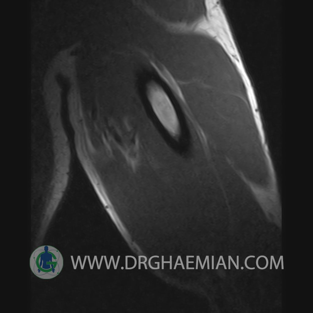 – A well defined cystic lesion with thick wall & peripheral nodularity 50x150x45 mm in facia of biceps muscle with post contrast enhancement in wall nodularity suggestive for