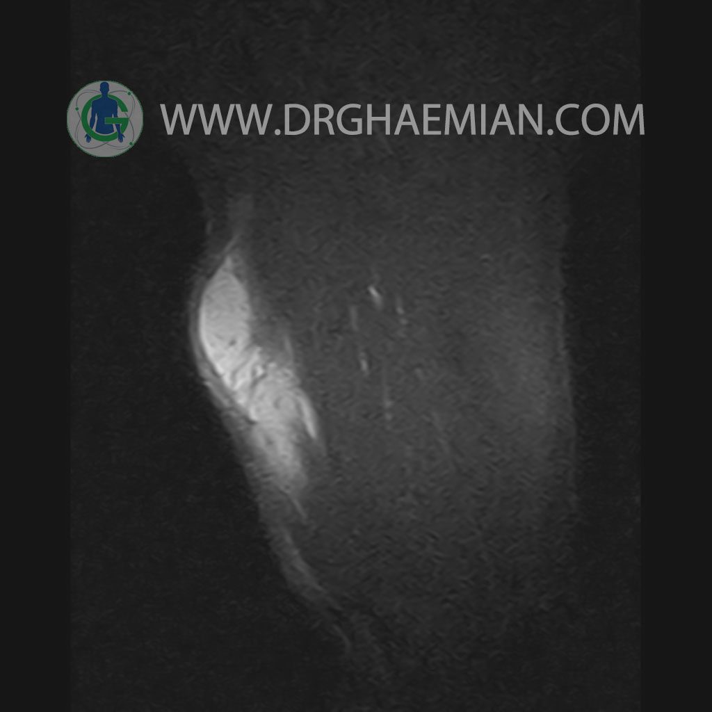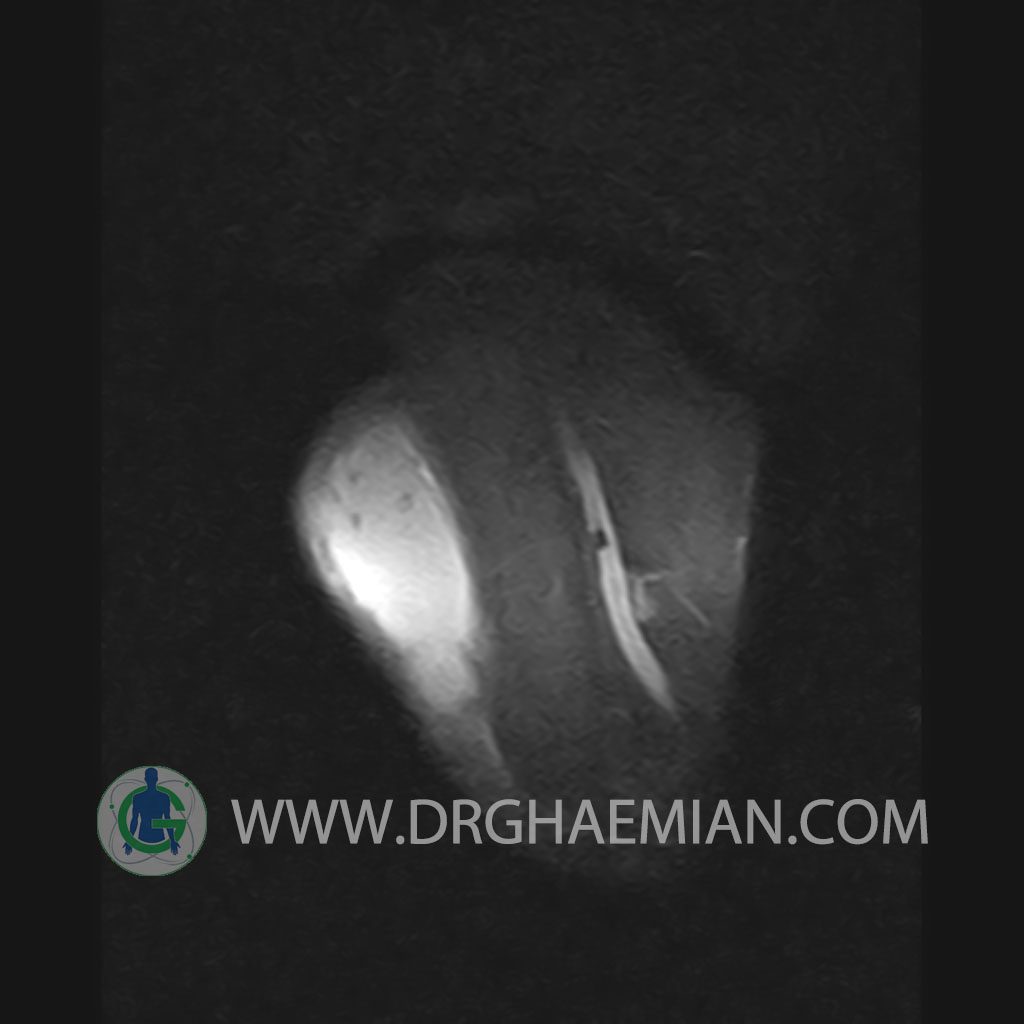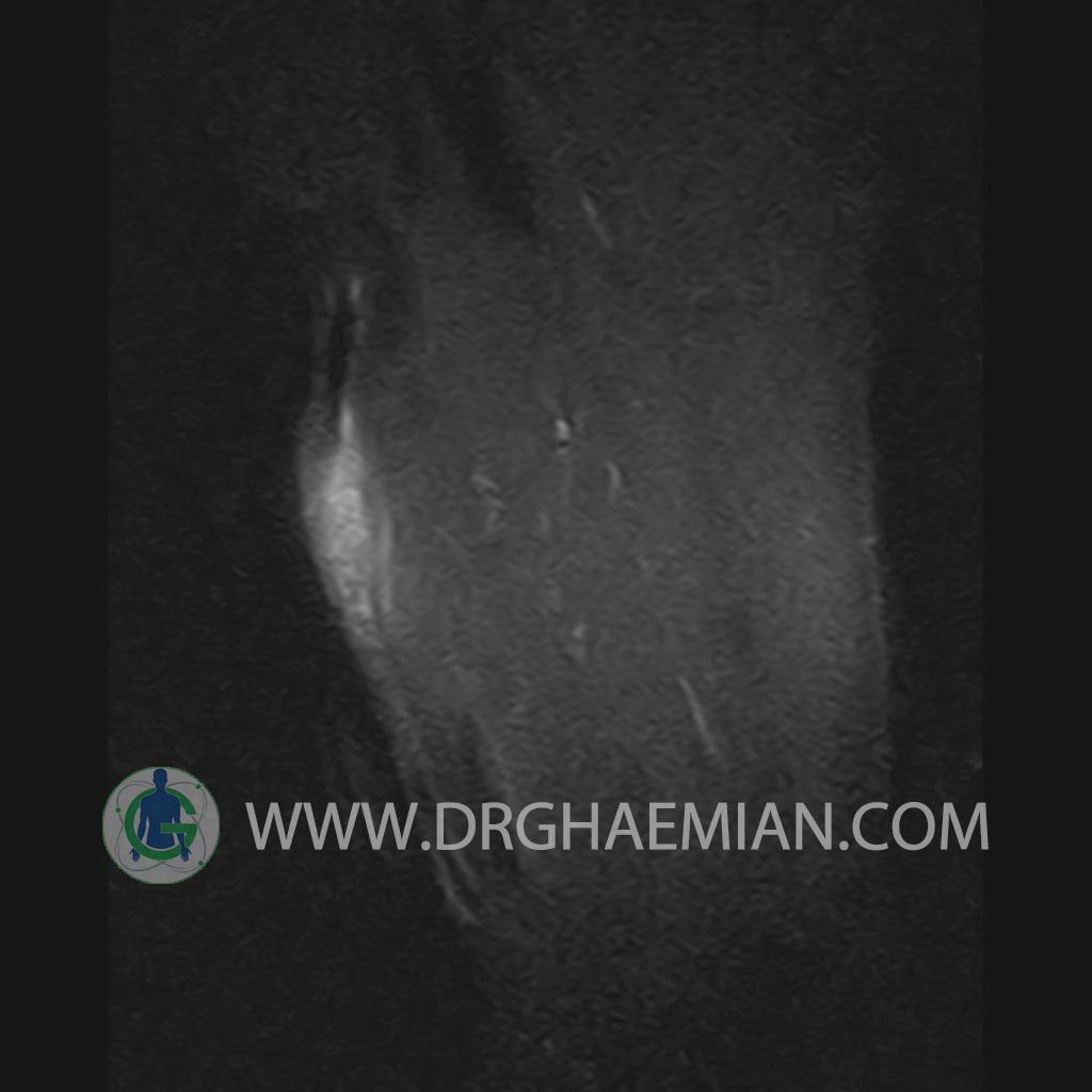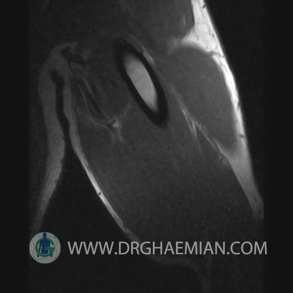 – A well defined cystic lesion with thick wall & peripheral nodularity 50x150x45 mm in facia of biceps muscle with post contrast enhancement in wall nodularity suggestive for