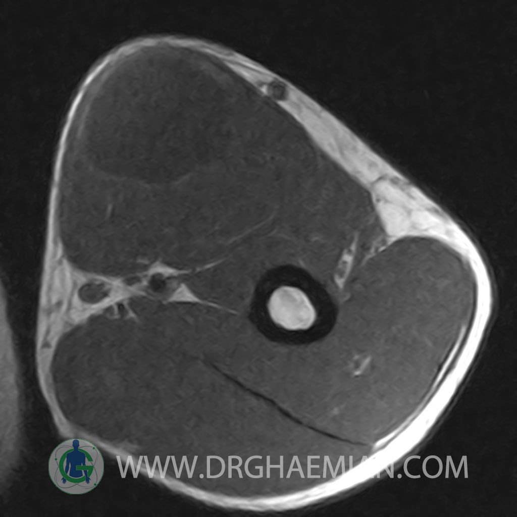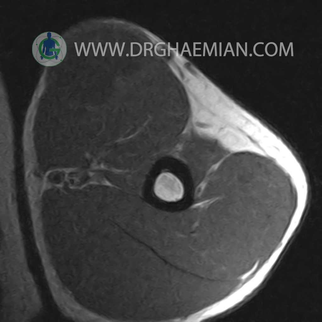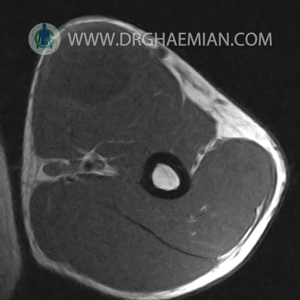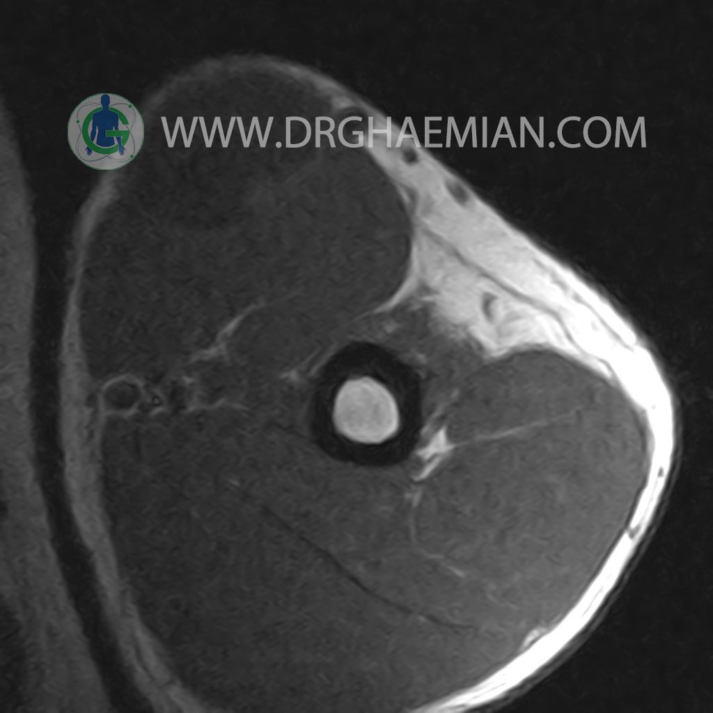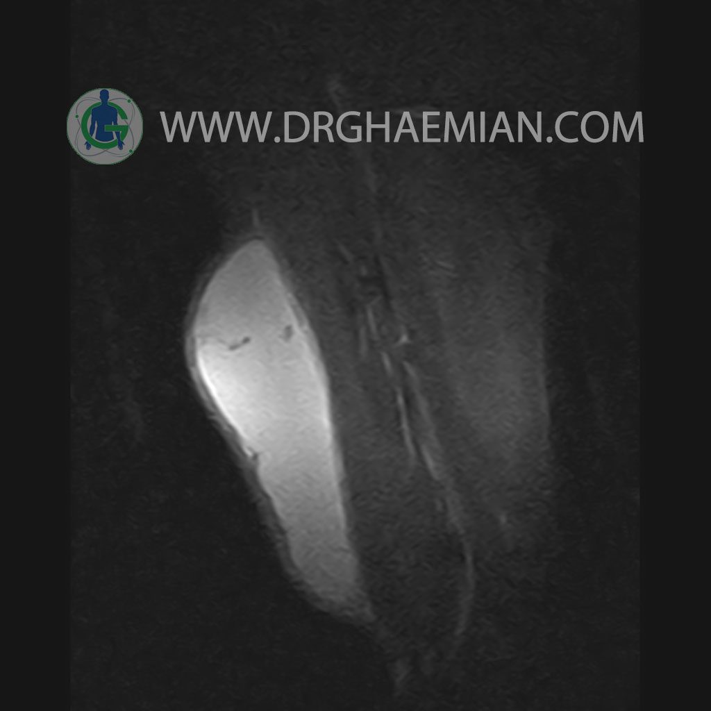 – A well defined cystic lesion with thick wall & peripheral nodularity 50x150x45 mm in facia of biceps muscle with post contrast enhancement in wall nodularity suggestive for