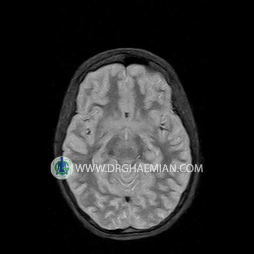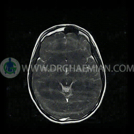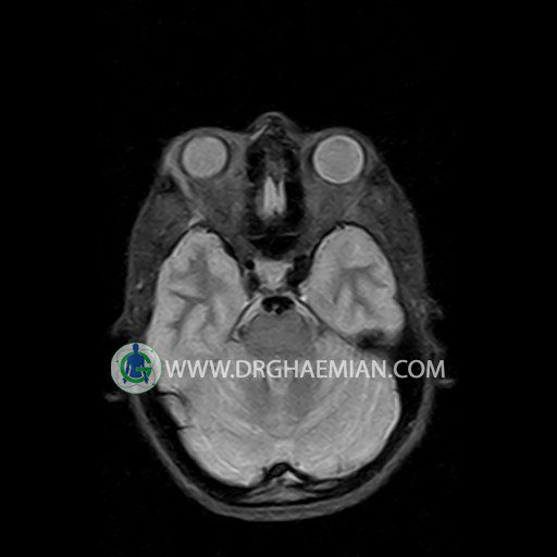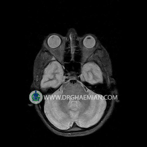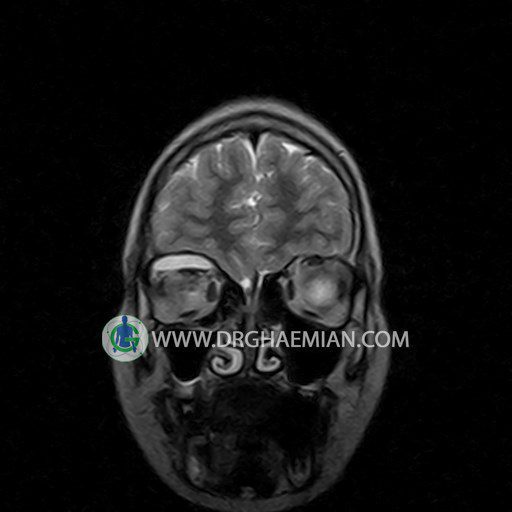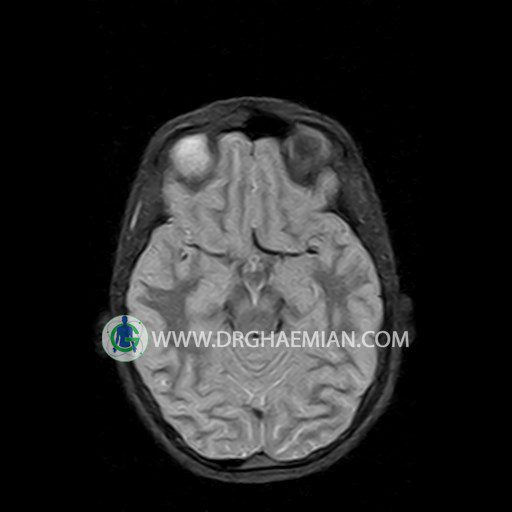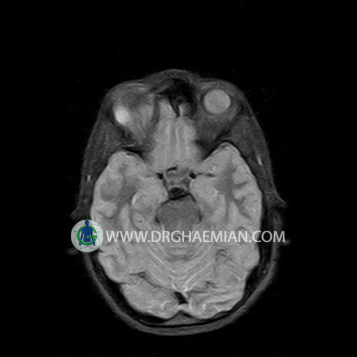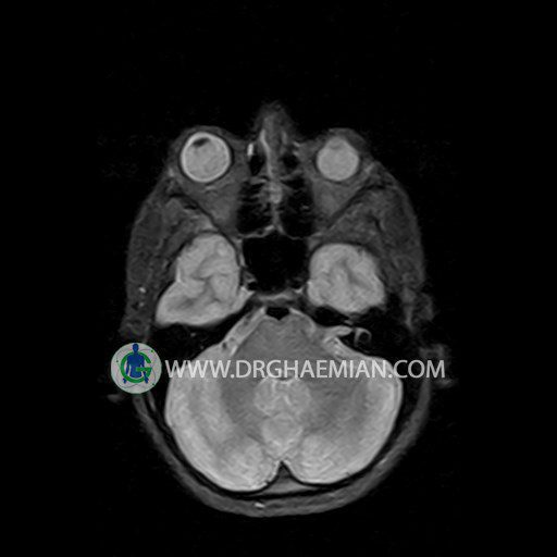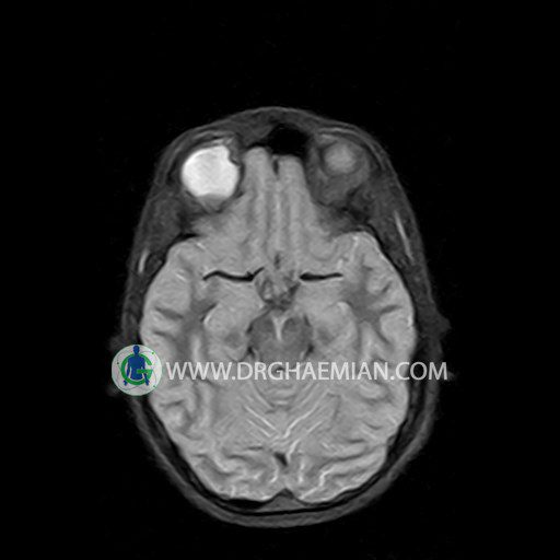 – A well – defined fluid collection ( 6 x 25 x 27 mm – high T2 ,PD – intermediate T1 ) in superior of right orbital cavity with interior displacement of superior rectus & right propteosis suggestive for old hematoma