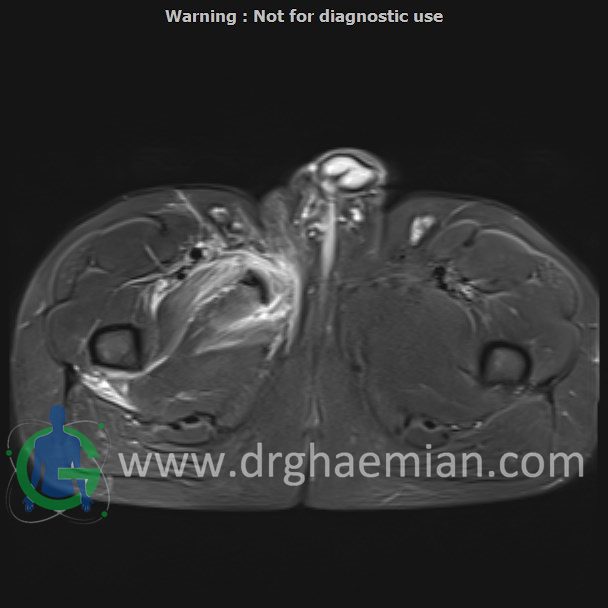 heterogeneous signal change in proximal of right adductor magnus with tendon retraction suggestive for full thickness tearing