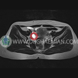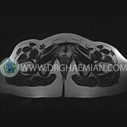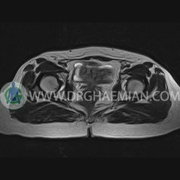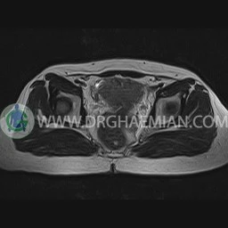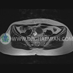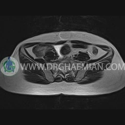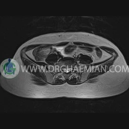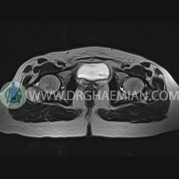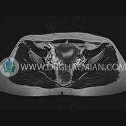 ام ار آی لگن از طریق دستگاهی با آهنرباهایی قوی و امواج رادیویی از ناحیه بین استخوان های ران تصاویری می سازد. در این کیس کیست فولیکولار تخمدان کوچک، میوم به ابعاد mm 50 x 40 x 35 و باریک شدن، دیهیدراته، بیرون زدگی دیسک L4/L5، دیهیدراته و بیرون زدگی دیسک L5/S1 دیده می شود.