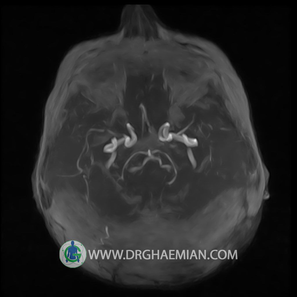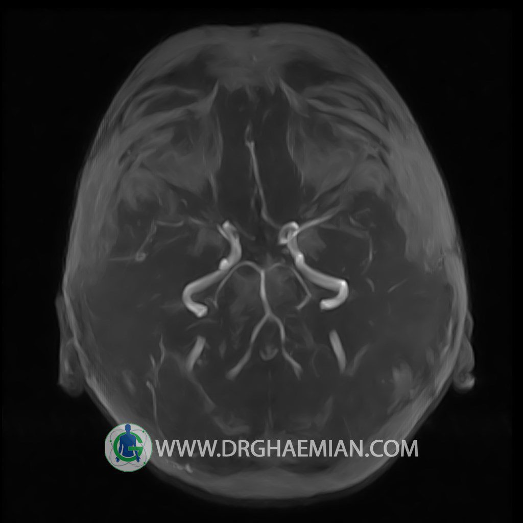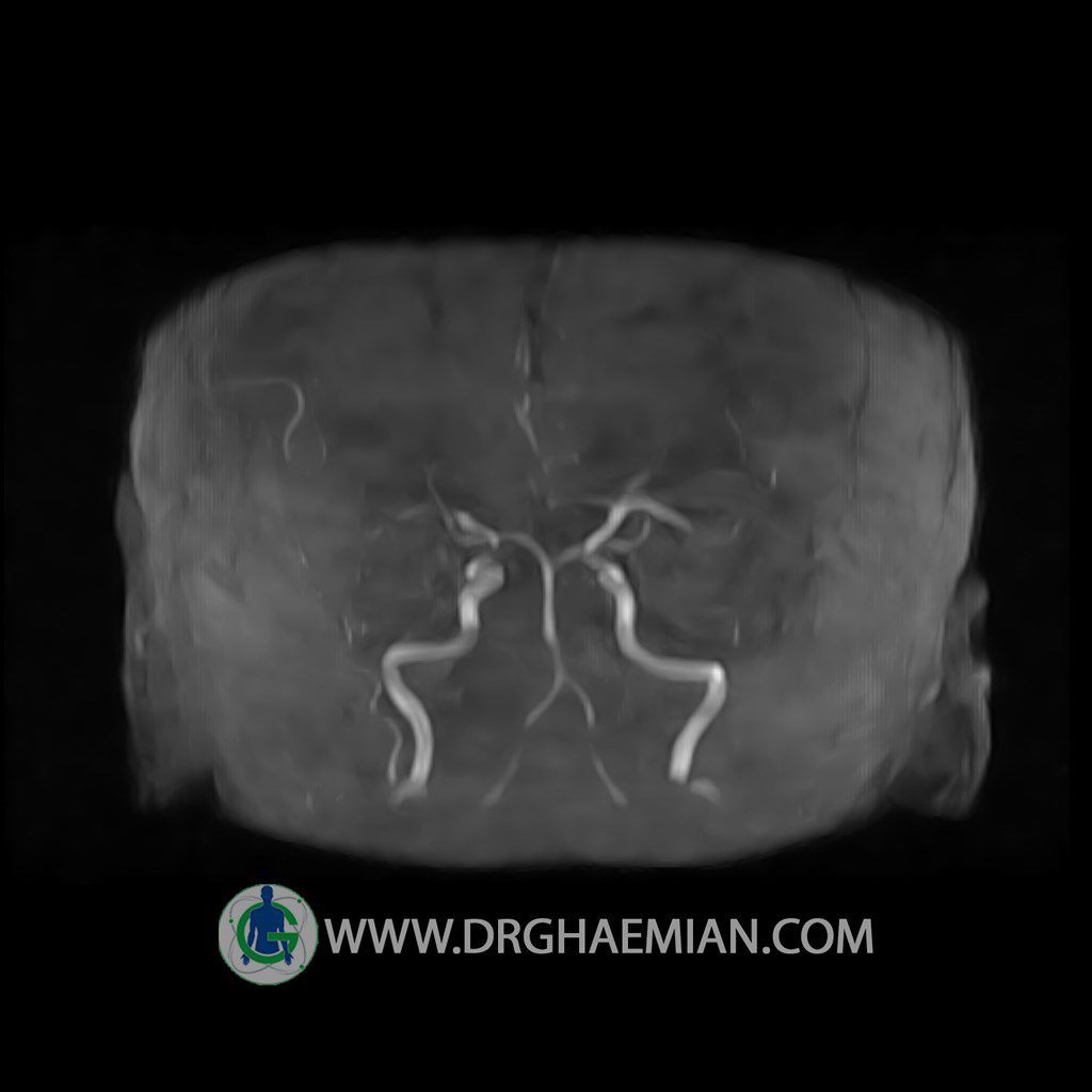 ام آر آنژیوگرافی با استفاده از آهنربایی قوی، امواج رادیویی و کامپیوتری هوشمند عروق خونی را ارزیابی کرده و به یافتن موارد غیرعادی کمک میکند. این تصویربرداری از تششعات استفاده نمی کند و ممکن است از کنتراست (ماده حاجب) استفاده شود. در این کیس وازواسپاسم مغز و هیپوپلازی مادرزادی مشاهده می شود.