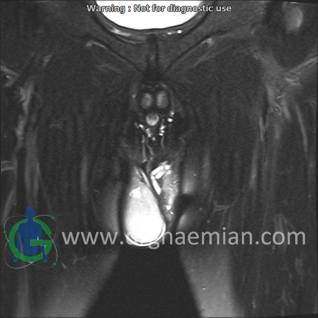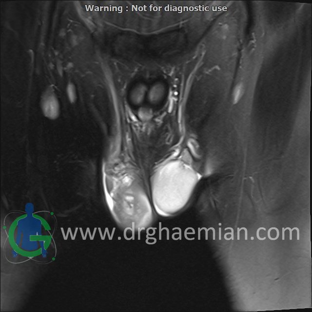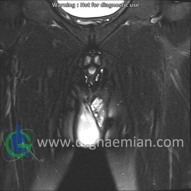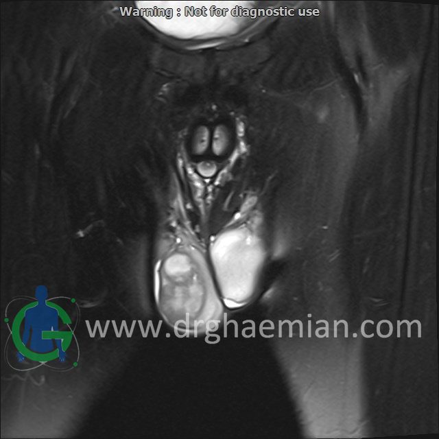 ام آر آی لگن یک روش تصویربرداری است که از طریق دستگاهی با آهنرباهای قوی و امواج رادیویی از ناحیه بین استخوان های ران تصاویری می سازد.در این کیس کیست به ابعاد 22*35 در بیضه راست و … دیده میشود