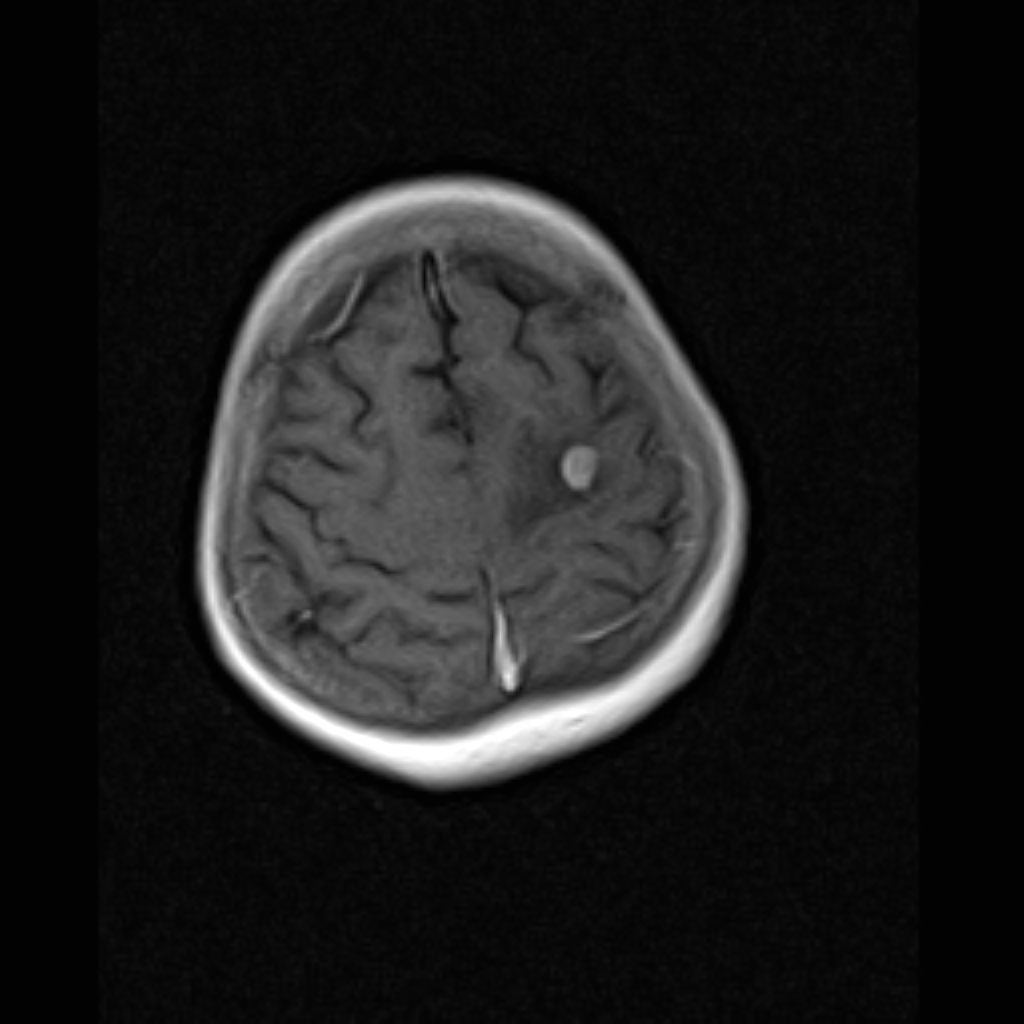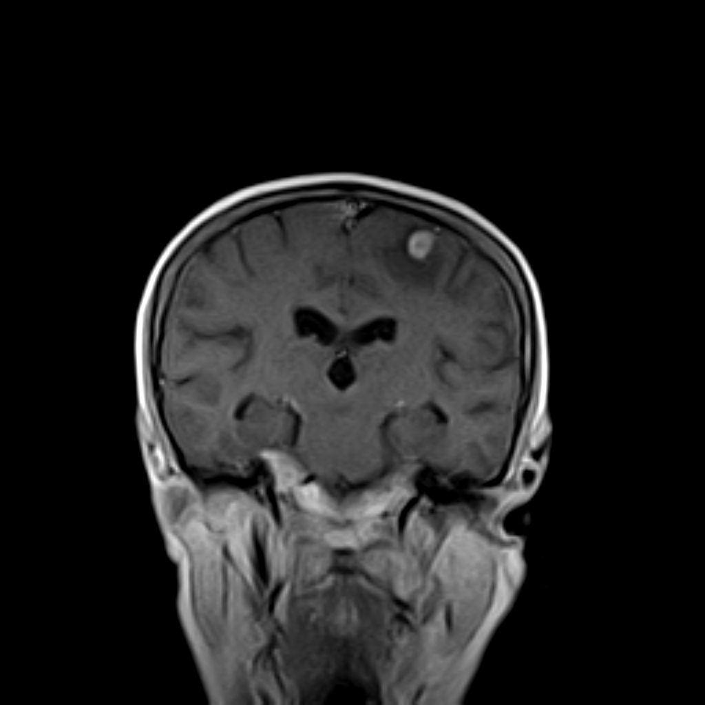 – Multiple , intra – axial mass lesion in left frontal lobe ( 11 mm ), right temporal
