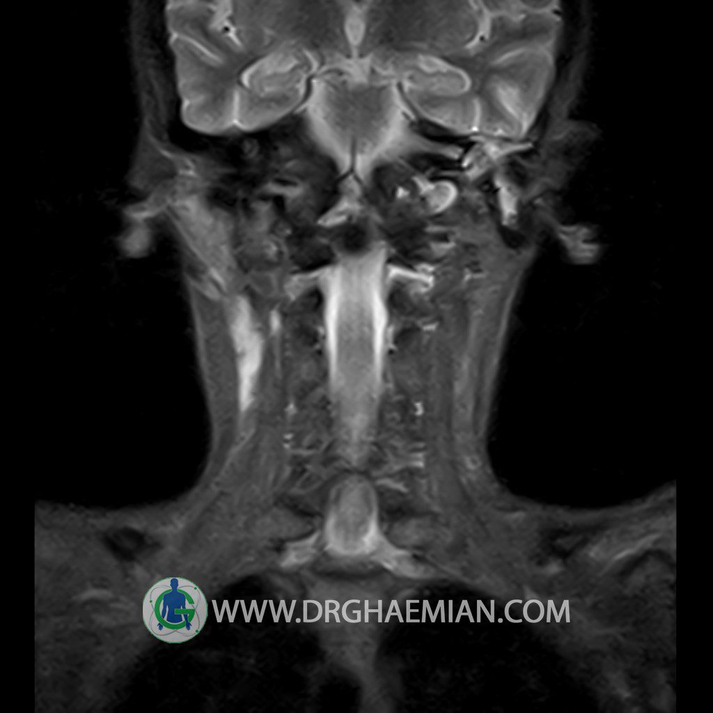 پزشکان اغلب از تصویربرداری ام آر آی برای تشخیص و درمان عارضه های پزشکی که فقط با استفاده از اشعه ایکس یا میدان مغناطیسی و امواج رادیویی قابل مشاهده است، استفاده می کنند. دستگاه ام آر آی تصاویر دقیق از ساختار های داخلی بدن ایجاد می کند. در این کیس هایپرلوردوز گردن، اسپاندولیز مهره های C5/C6، بدشکلی صورت و تفییرات پس از جراحی، غلیظ شدن مخاط سینوسی در سینوس های اتموئیدو ماگزیلاری جلوی و راست و التهاب در غذه پاروتید چپ دیده می شود.
