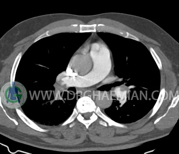 سی تی آنژیوگرافی ترکیبی از سی تی اسکن و تزریق ماده حاجب است. این روش قابلیت ایجاد تصاویری از عروق خونی داخل بدن را دارد. در این کیس ترومبوآمبولی شریان ریوی و نقص در پرشدگی متعدد دیده می شود.