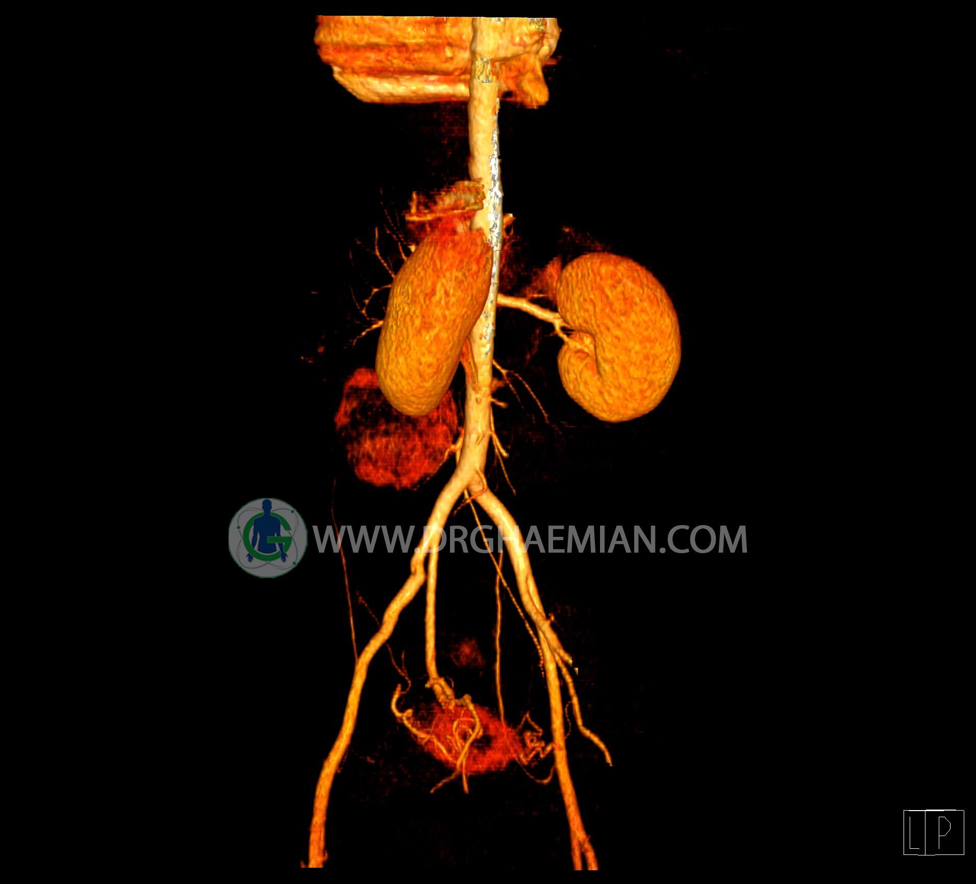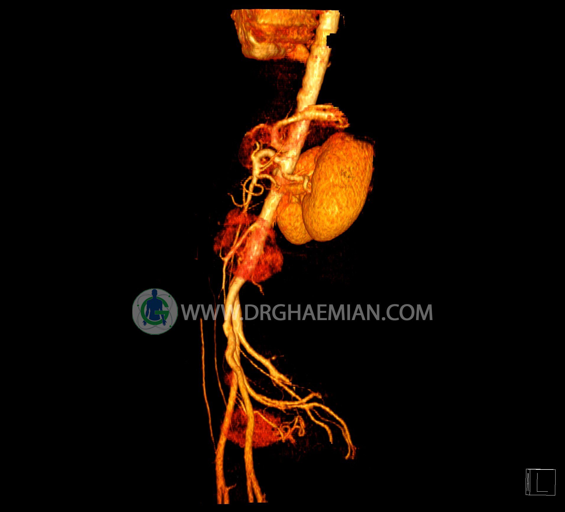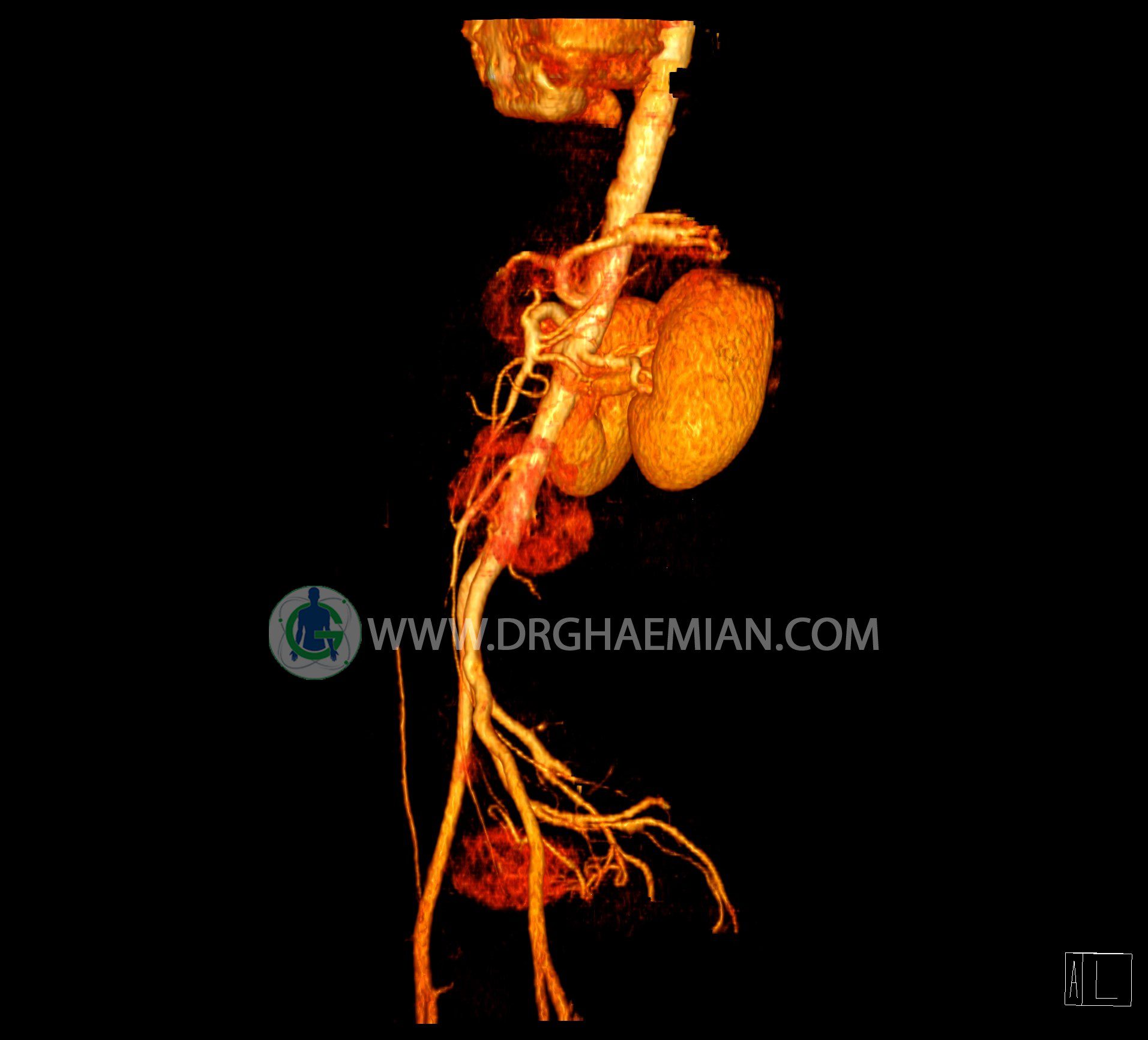 سی تی آنژیوگرافی (CTA) از تزریق ماده حاجب (کنتراست) به داخل عروق خونی شما و سی تی اسکن برای کمک به تشخیص و ارزیابی بیماری عروق خونی یا عارضه هایی مرتبط مانند آنوریسم ها یا انسداد ها استفاده می شود. در این کیس تومور عصبی لگن با جابجایی دیستال آئورت شکمی، توده در پارا آئورت پایین تر از عروق رنال چپ، انکیسمنت شریان ایلیاک داخلی چپ و کیست کورتیکال در کلیه چپ دیده می شود.