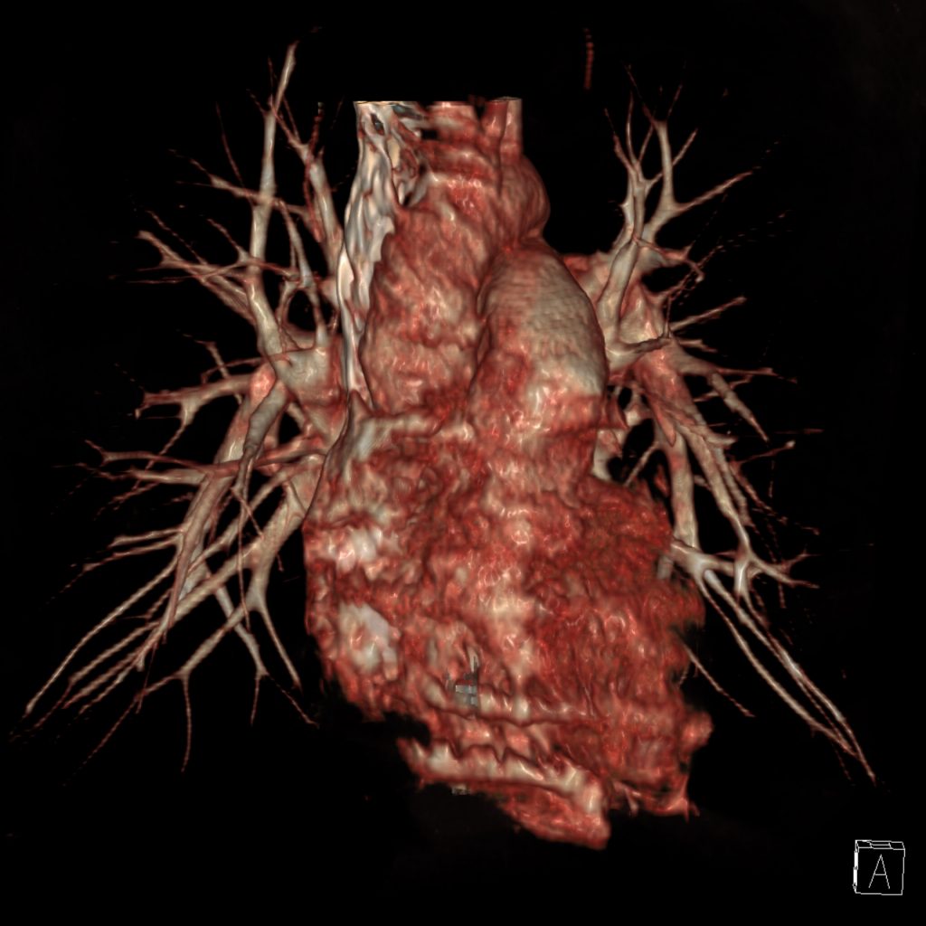 پس از تزریق ماده حاجب تنه اصلی شریان پولمونر، شاخه راست و چپ و شاخههای اینترلوبار، سگمنتال و ساب سگمنتال هر دو ریه حاجب شده است.
