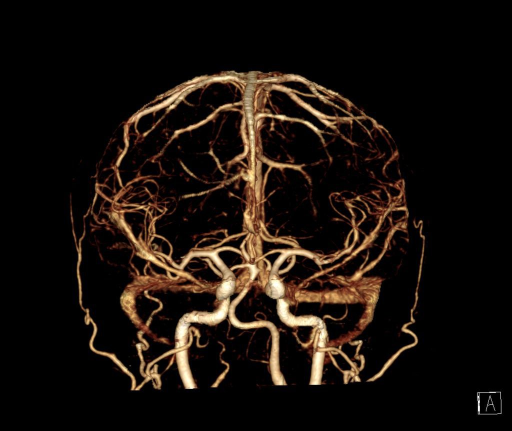 در تصاویر اگزیال و کرونال و ساژیتال تهیه شده از عروق مغز پس از تزریق کنتراست شریانهای ورتبرال، بازیلار، کاروتید داخلی، حلقه ویلیس،PCA ، MCA و ACA دو طرف و نیز ورید ها و سینوس های وریدی اینتراکرانیال حاجب شده اند.