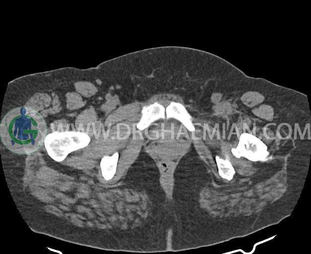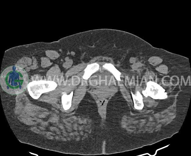 در سی تی اسکن اسپیرال شکم و لگن بدون کنتراست (مولتی دیدکتور 16 با مقاطع ظریف و بازسازی های ساژیتال و کرونال) :