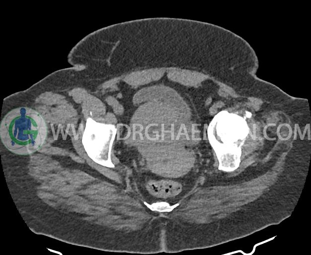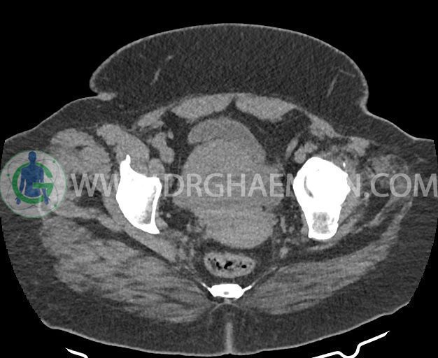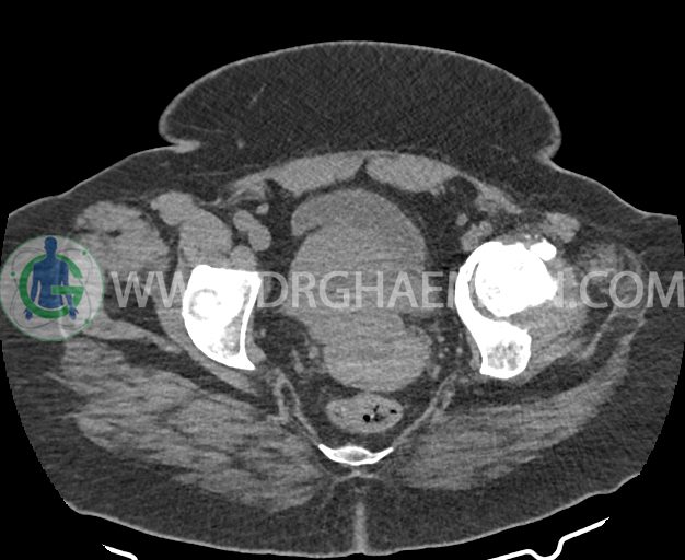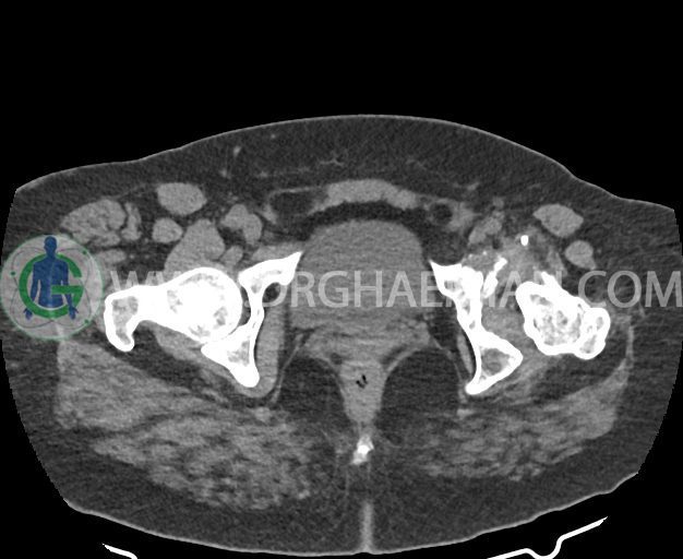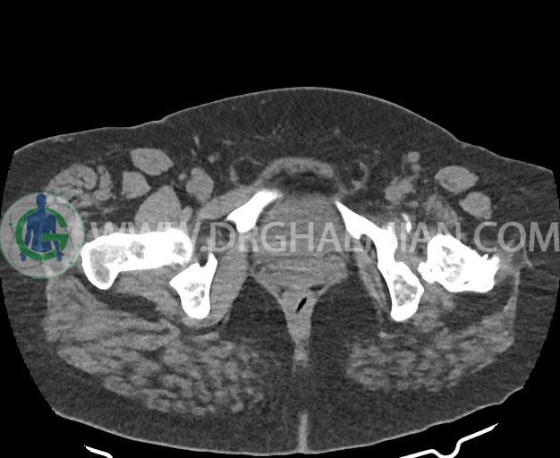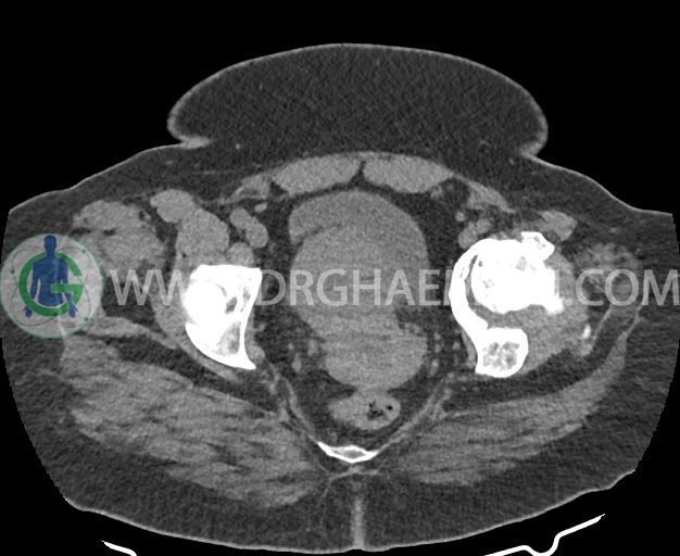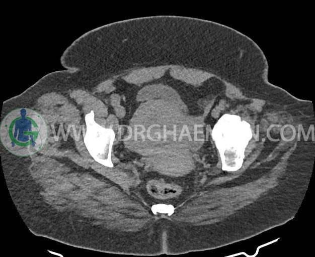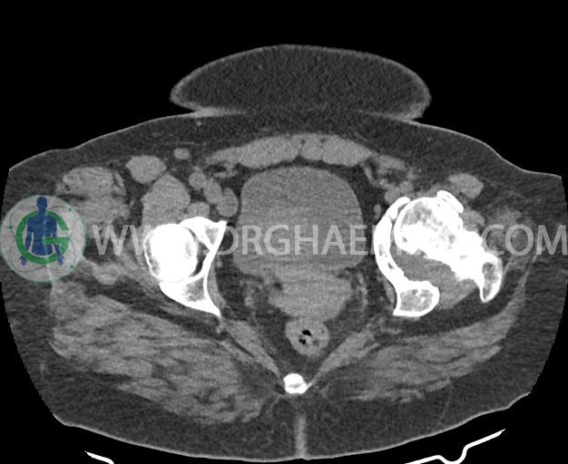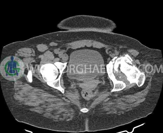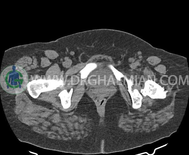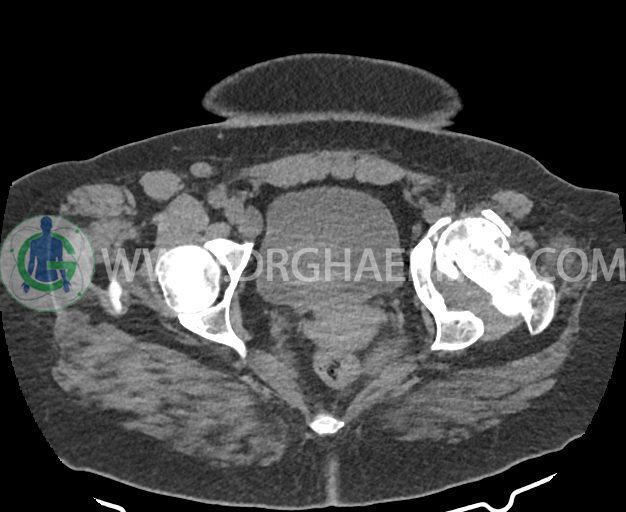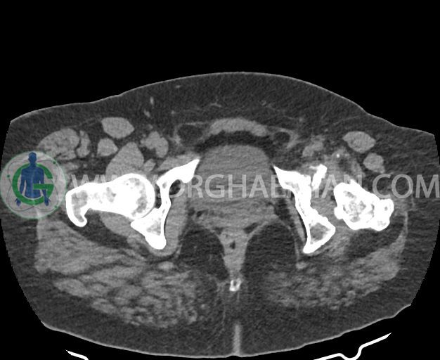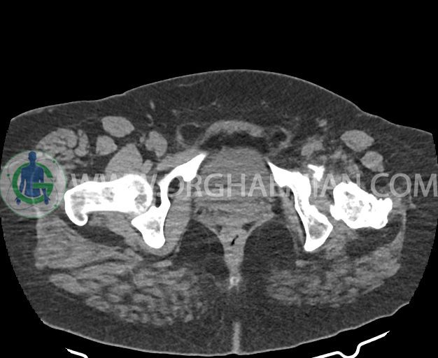 سی تی اسکن شکم و لگن با استفاده از اشعات ایکس تصاویر عرضی از ناحیه شکم و لگن ایجاد میکند. در این کیس استئوآرتریت لگن چپ، چندین سنگ در کلیه راست و اسپوندیلولیز مهره L5 دیده می شود.