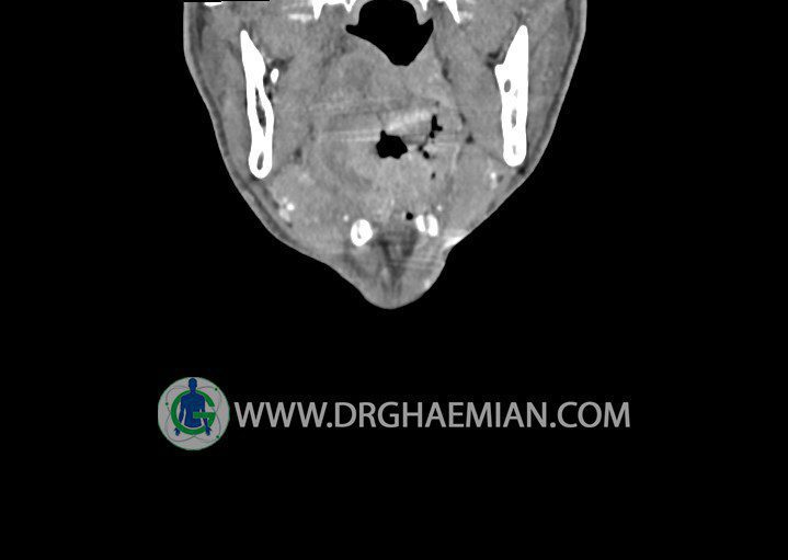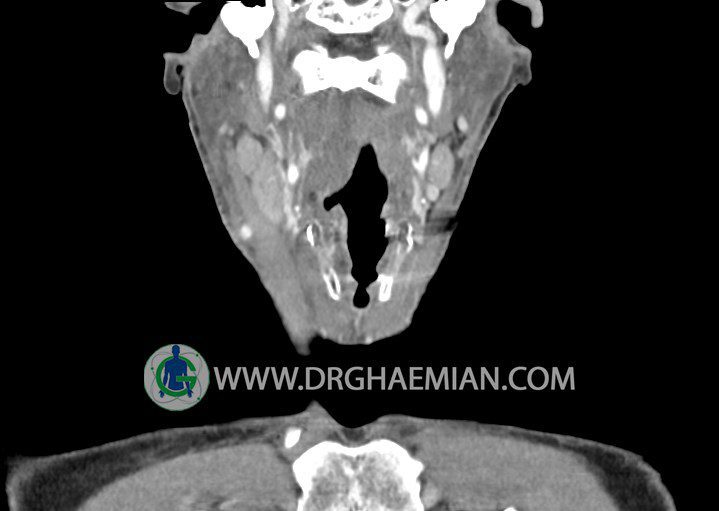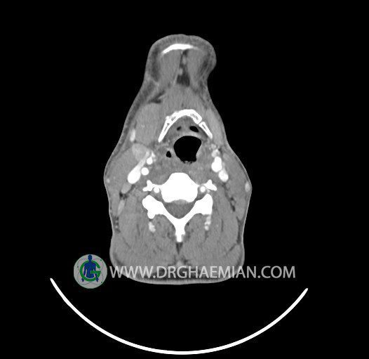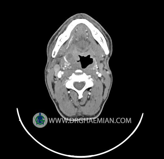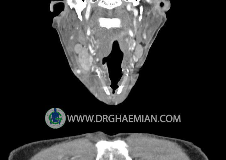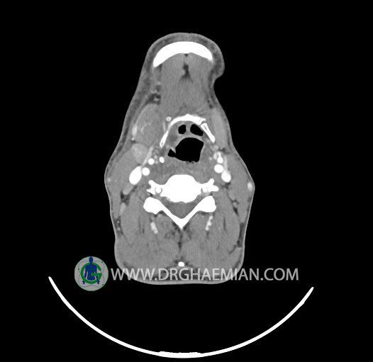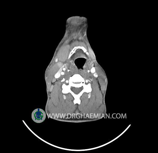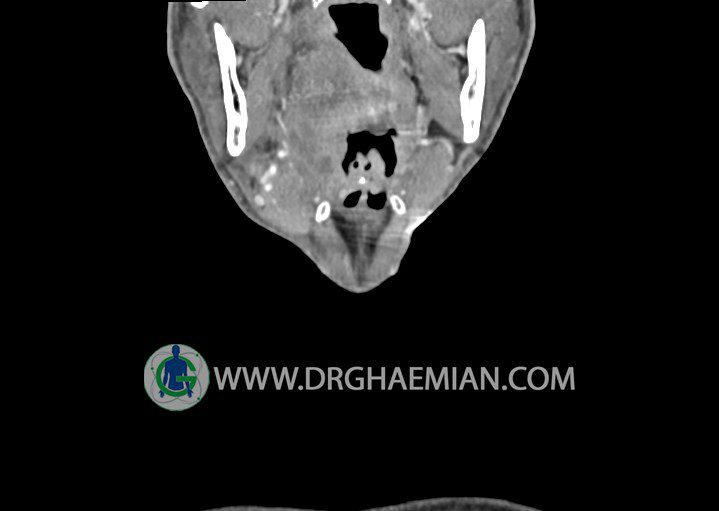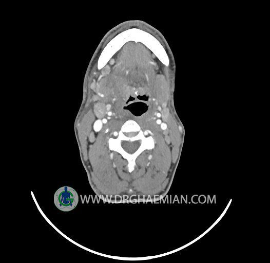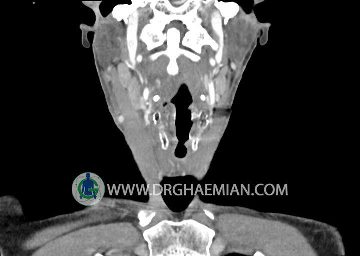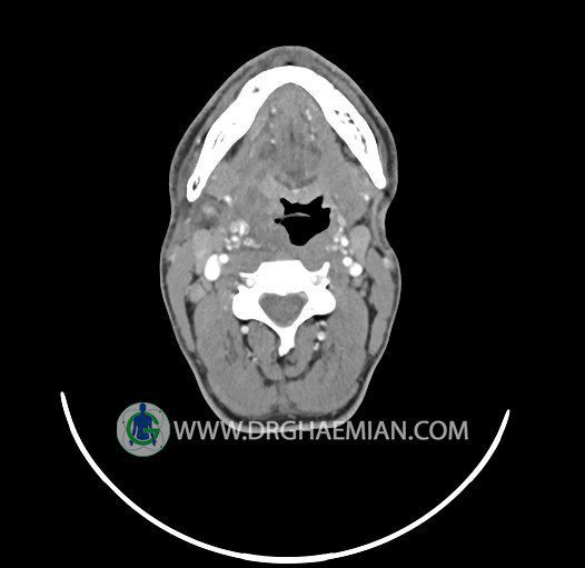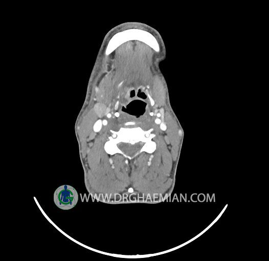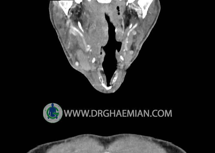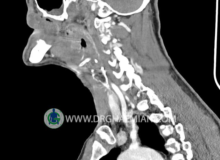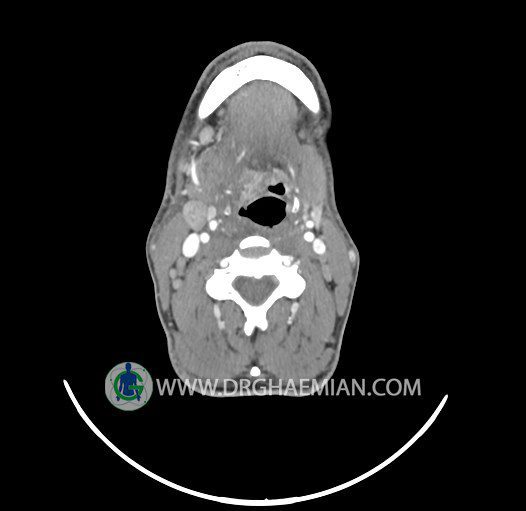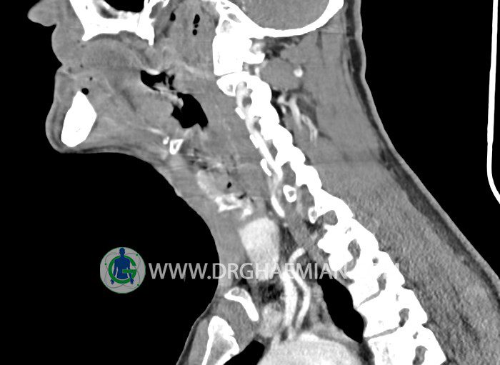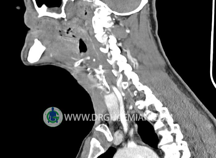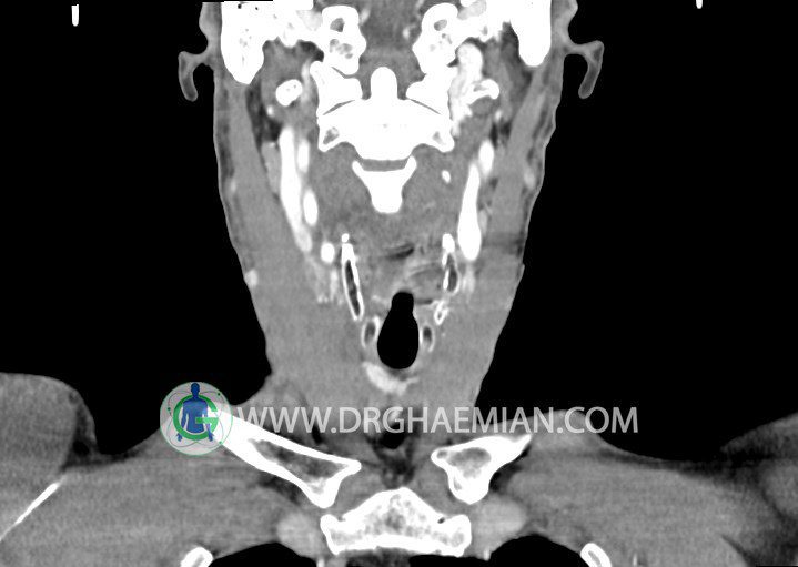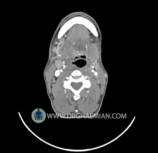 سی تی گردن یک روش تصویربرداری است که با استفاده از تشعات ایکس تصاویری با جزییات از ناحیه خالی گردن ایجاد میکند. در این کیس آبسه پارافارنژیال و لنفادونوپاتی در چندین نود لنفاوی دیده می شود.