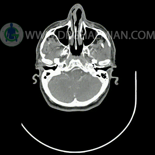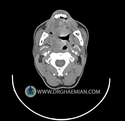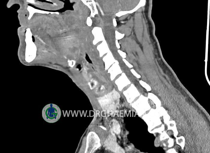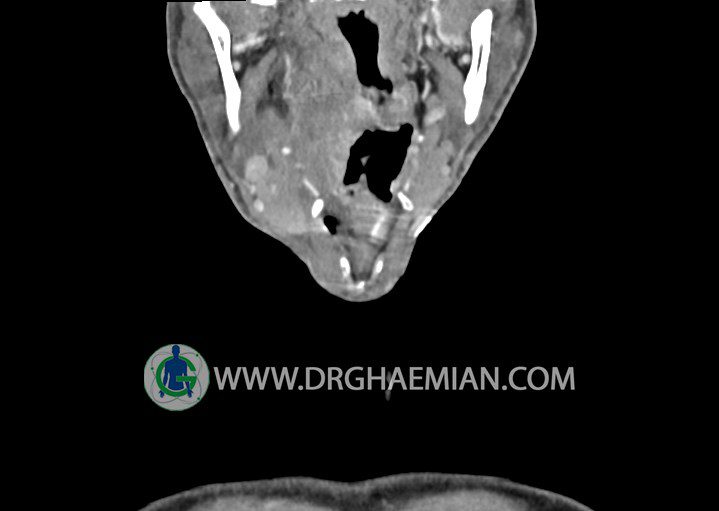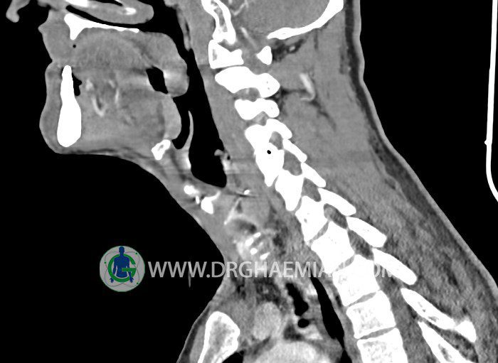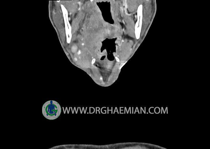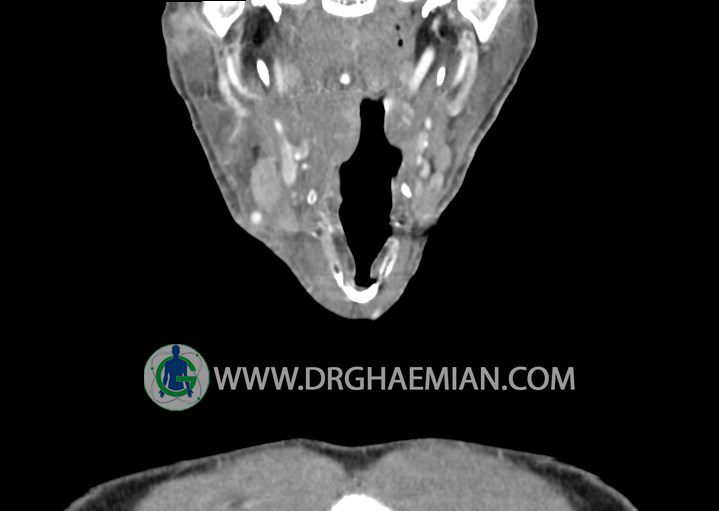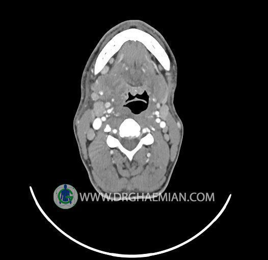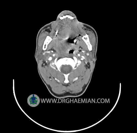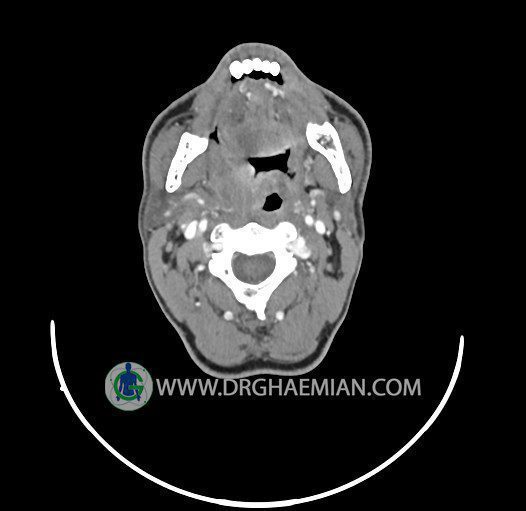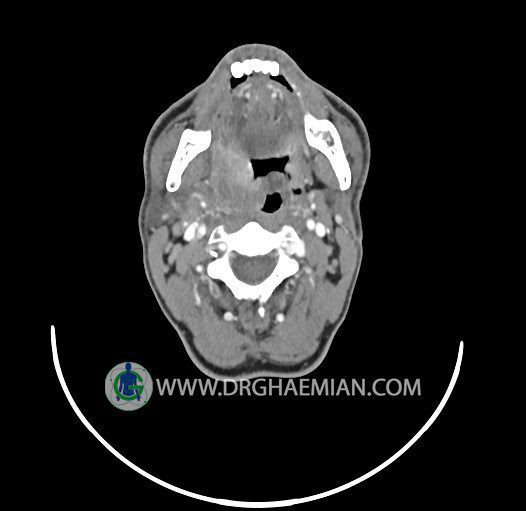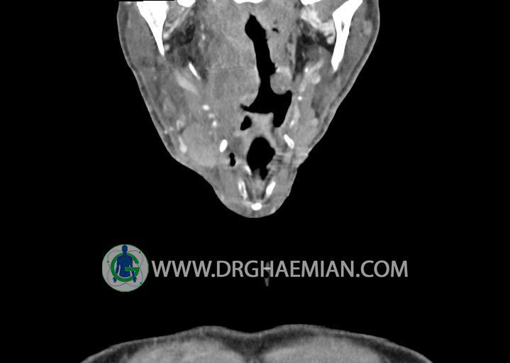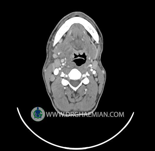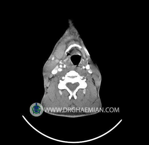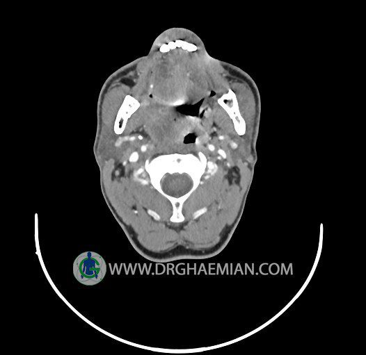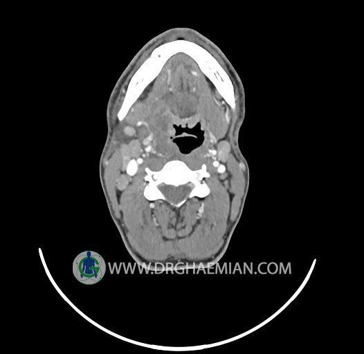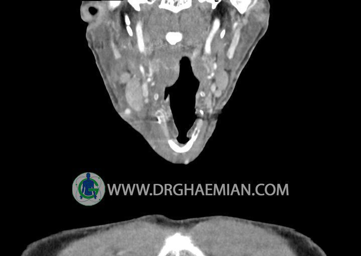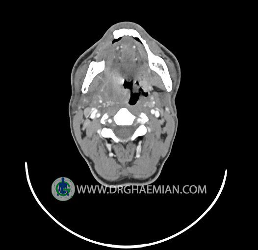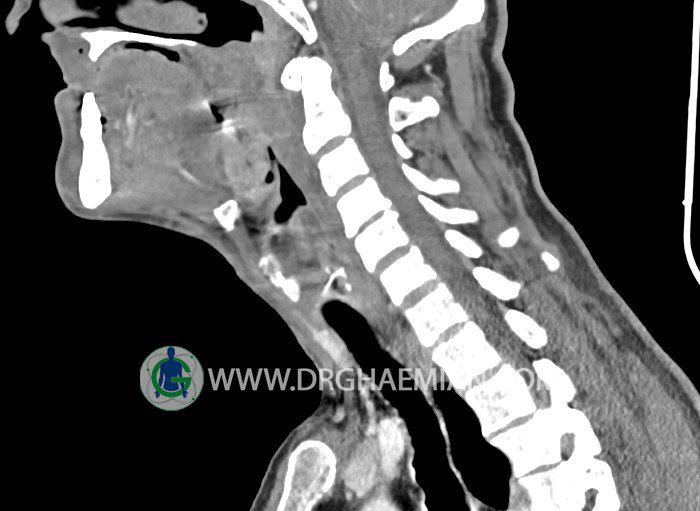 سی تی گردن یک روش تصویربرداری است که با استفاده از تشعات ایکس تصاویری با جزییات از ناحیه خالی گردن ایجاد میکند. در این کیس آبسه پارافارنژیال و لنفادونوپاتی در چندین نود لنفاوی دیده می شود.