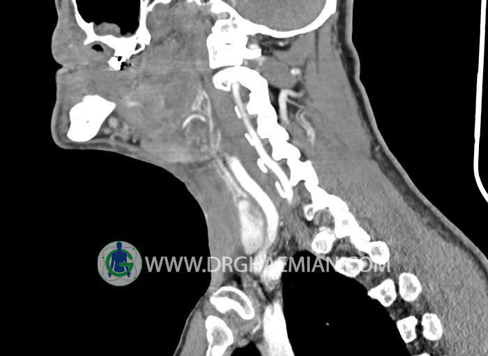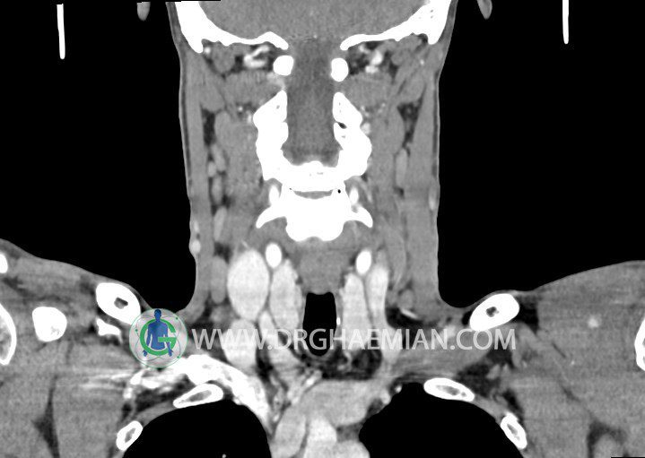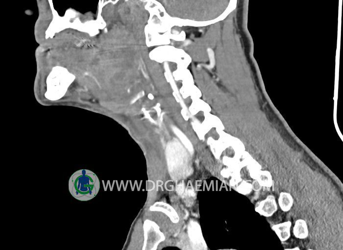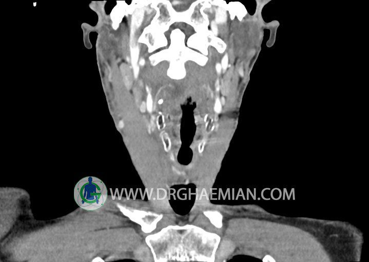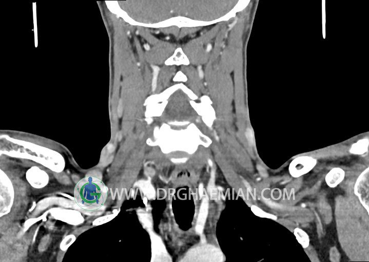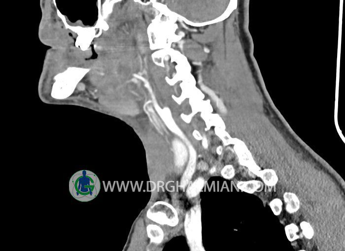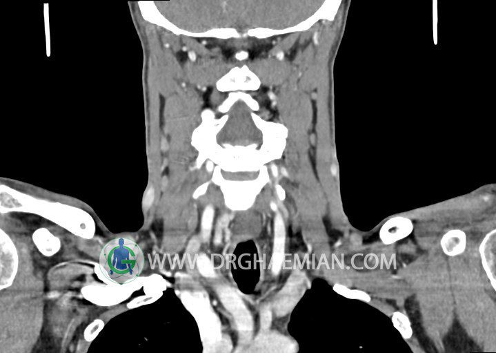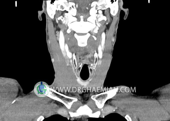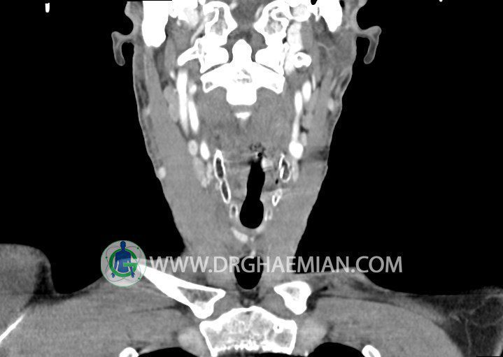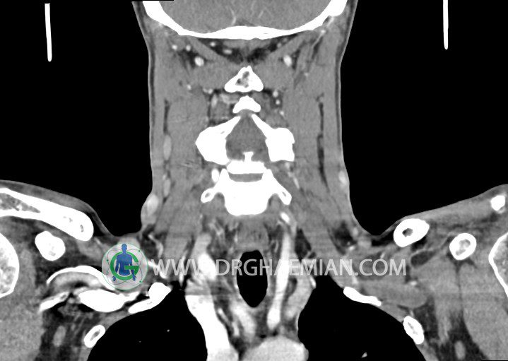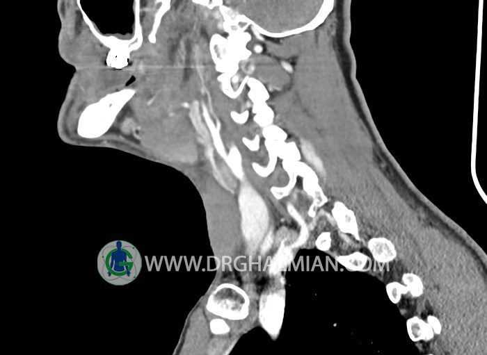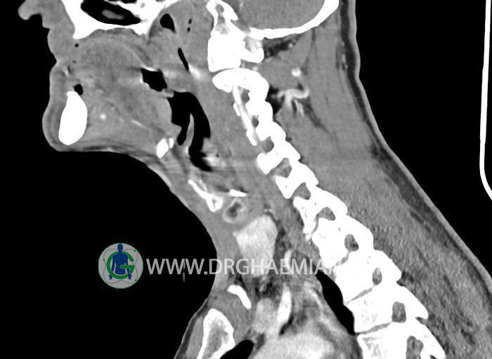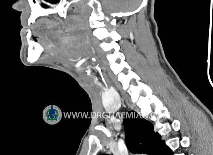 در سي تي اسکن اسپيرال از گردن با تزريق (مولتي ديدکتور 16 با مقاطع ظريف و بازسازي هاي ساژيتال و کرونال):