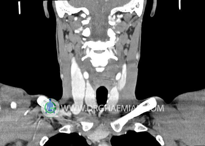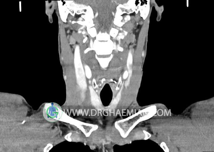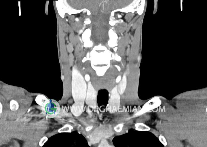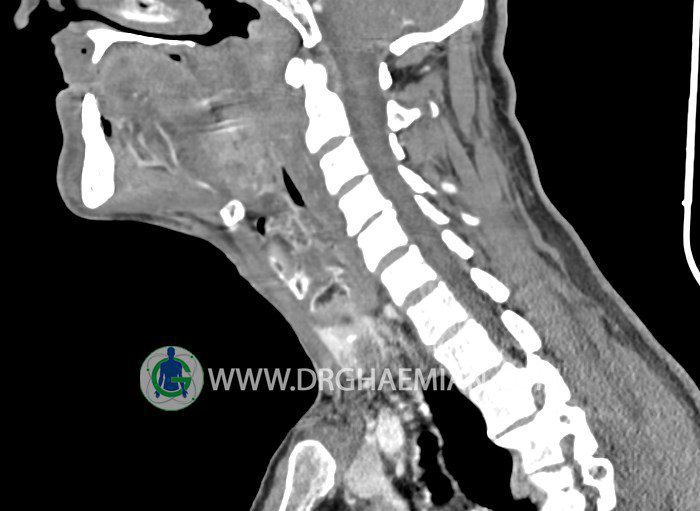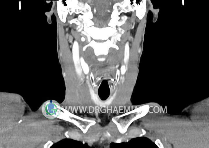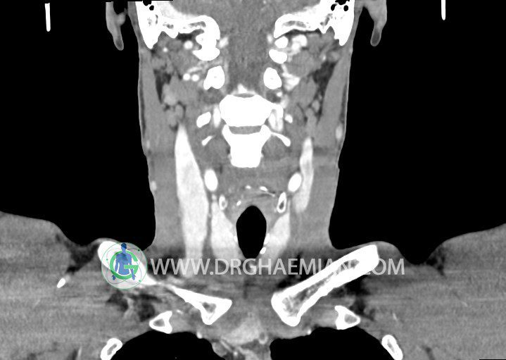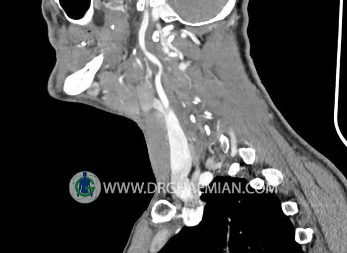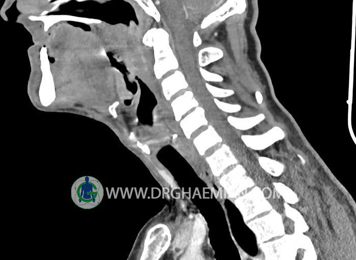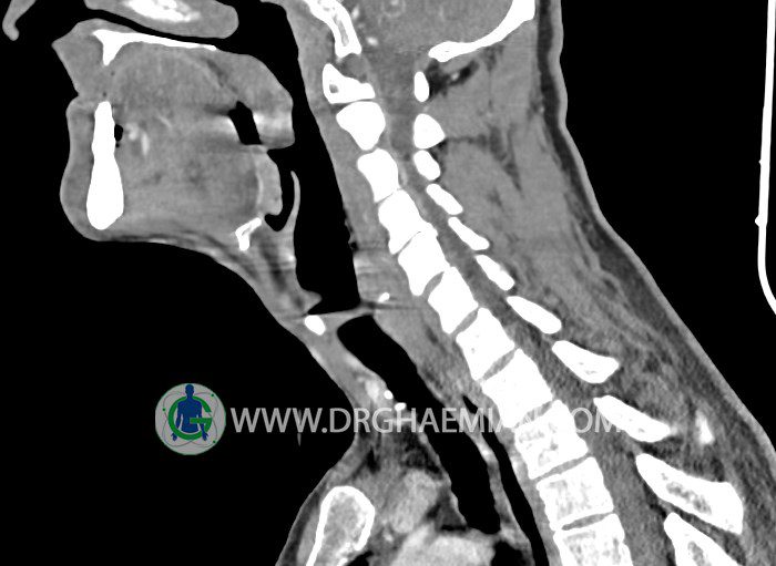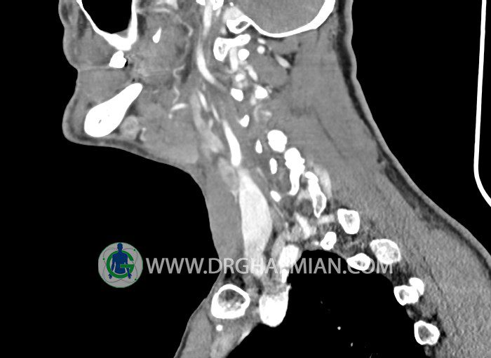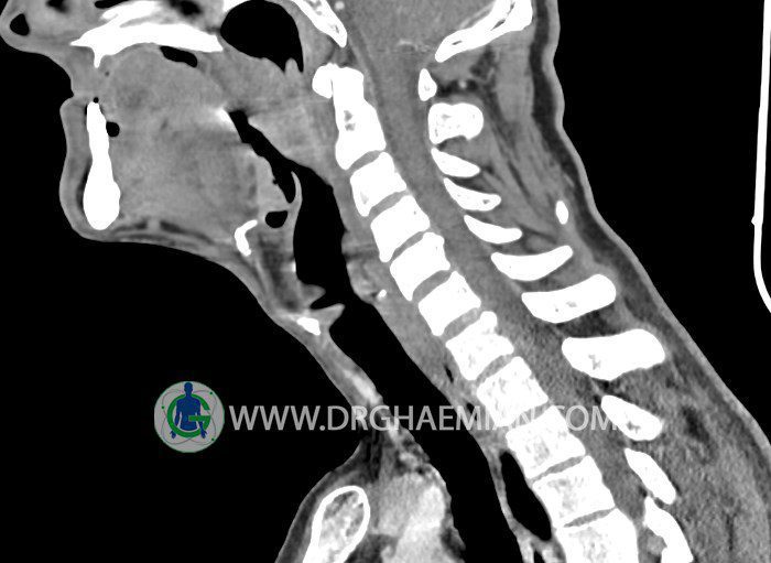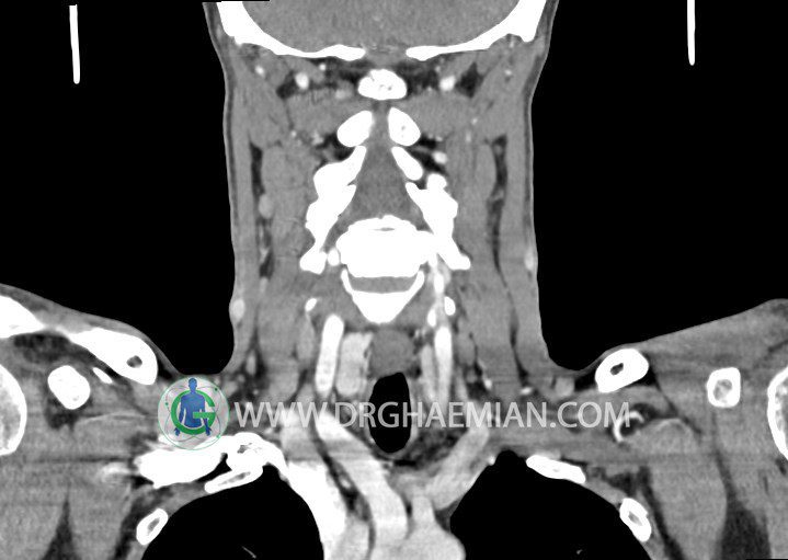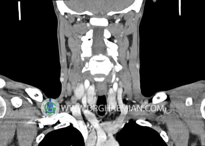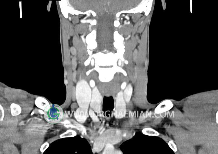 در سي تي اسکن اسپيرال از گردن با تزريق (مولتي ديدکتور 16 با مقاطع ظريف و بازسازي هاي ساژيتال و کرونال):