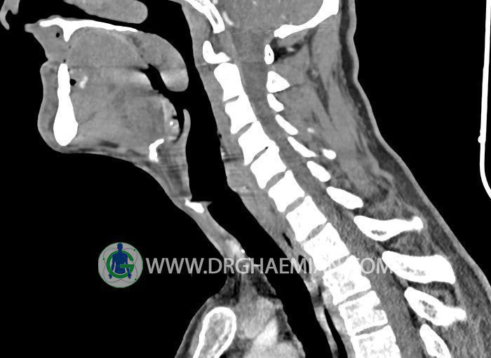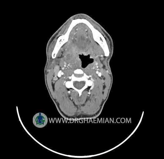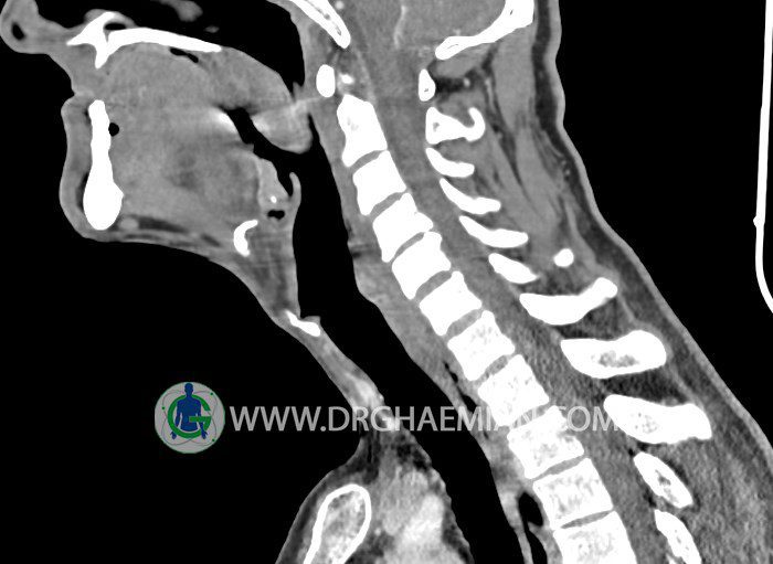 تا هيپوفارنکس مجاور والکولا و سينوس پريفورم راست با اثر فشاري مطرح کننده ابسه پارافارنژيال و