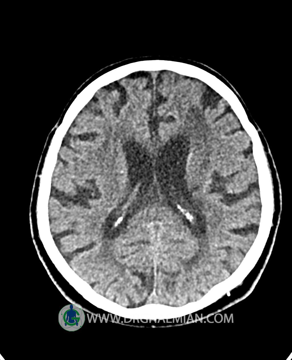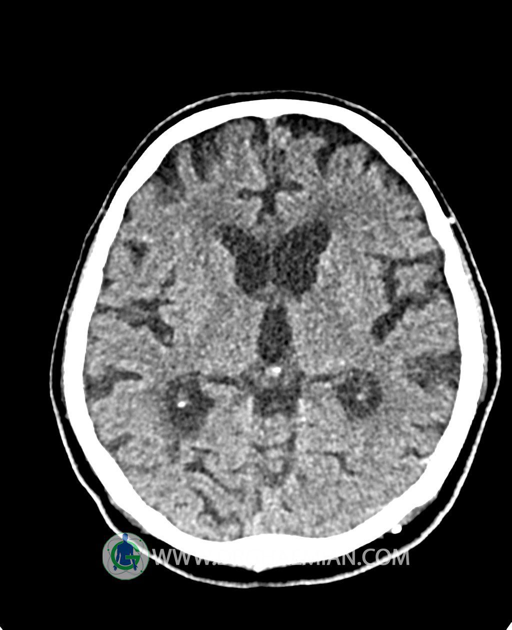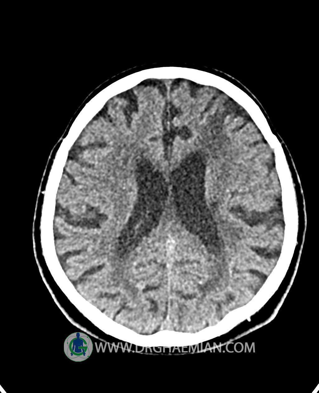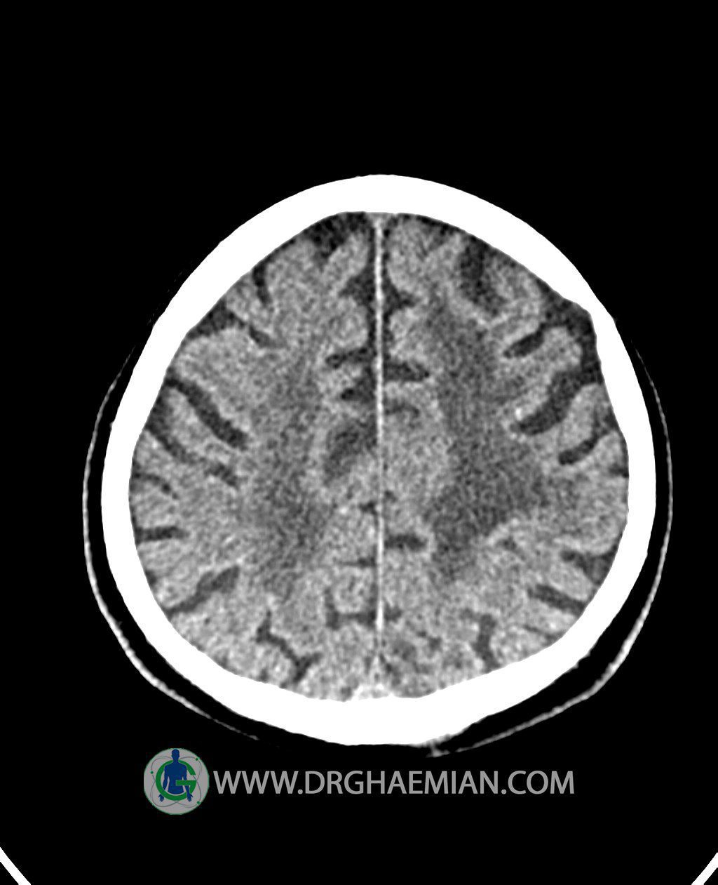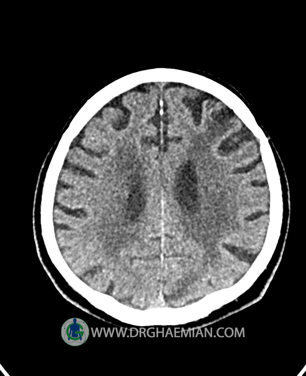 سی تی اسکن مغز با استفاده از اشعات ایکس تصاویری از سر که شامل جمجعه، مغز، حفره های چشمی و سینوس ها است ایجاد می کند. در این کیس آتروفی مغز، تغییرات ایسکمیک و انفارکت مشاهده شده.