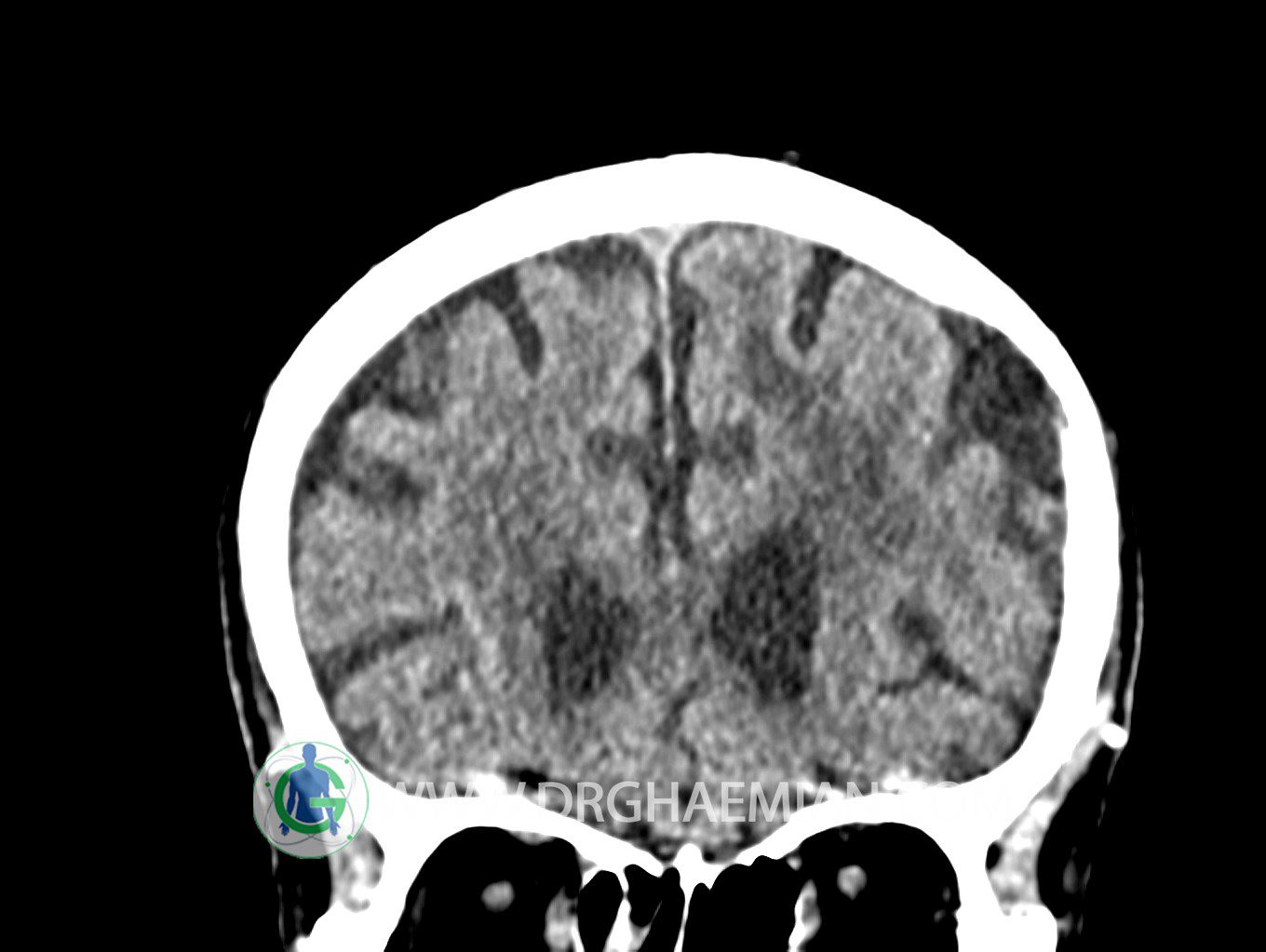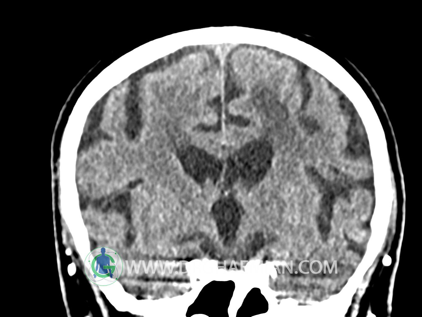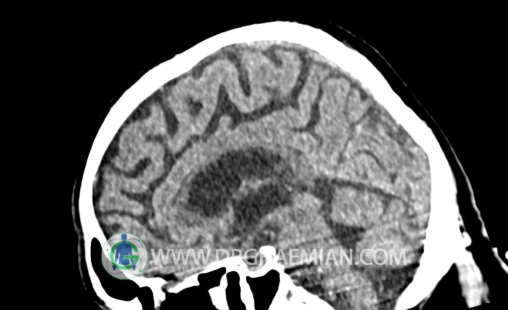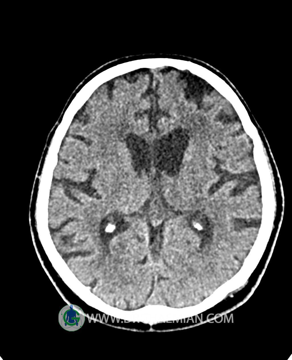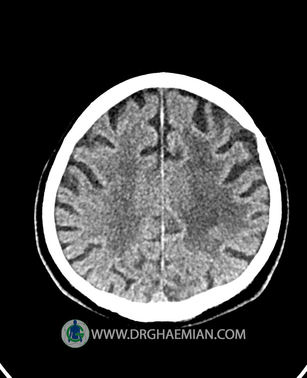 سی تی اسکن مغز با استفاده از اشعات ایکس تصاویری از سر که شامل جمجعه، مغز، حفره های چشمی و سینوس ها است ایجاد می کند. در این کیس آتروفی مغز، تغییرات ایسکمیک و انفارکت مشاهده شده.