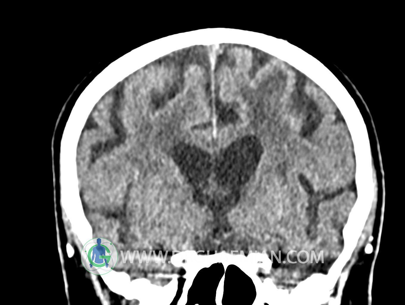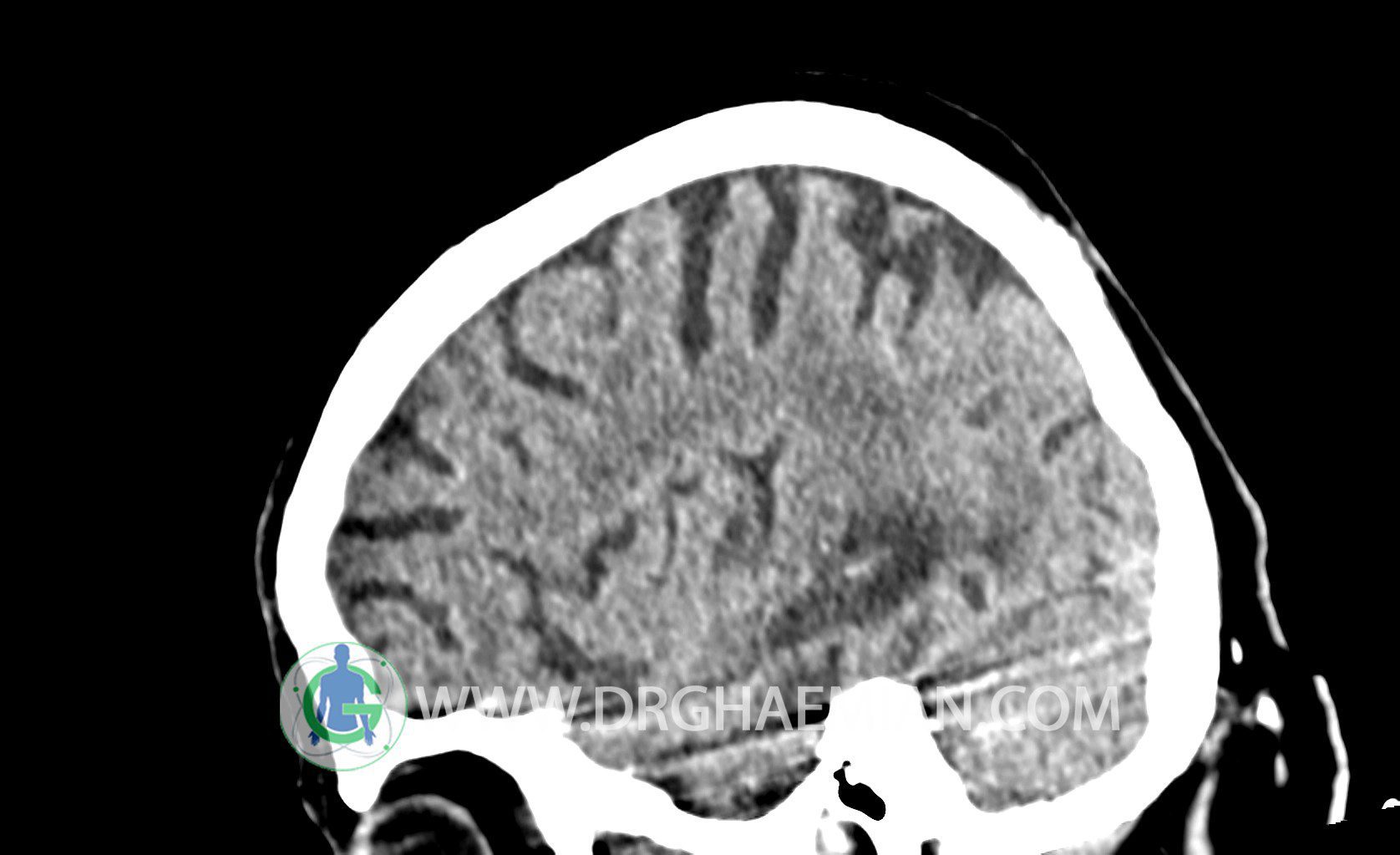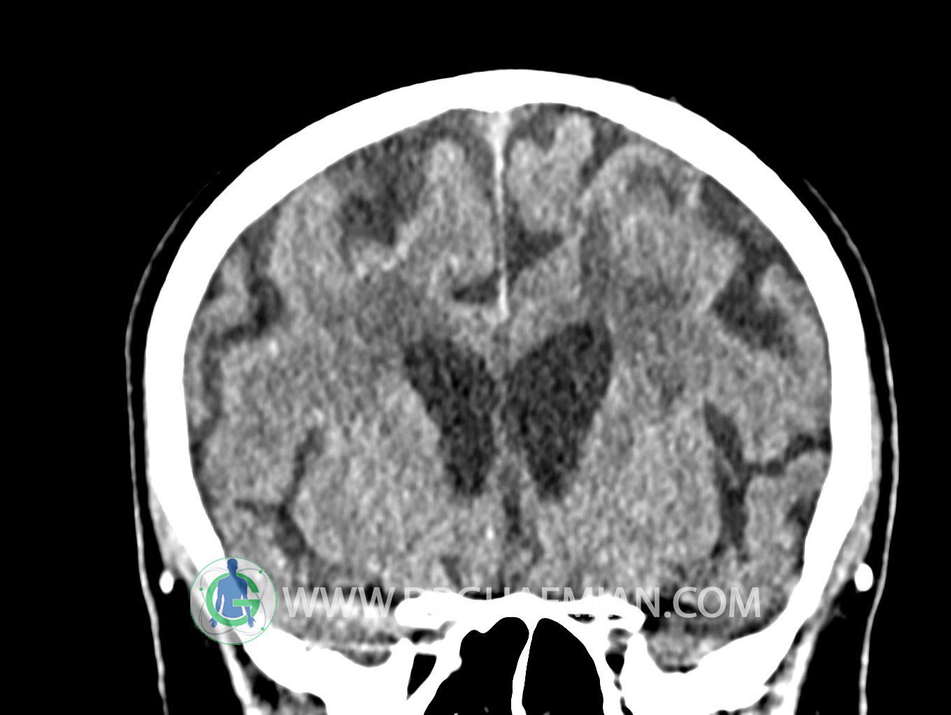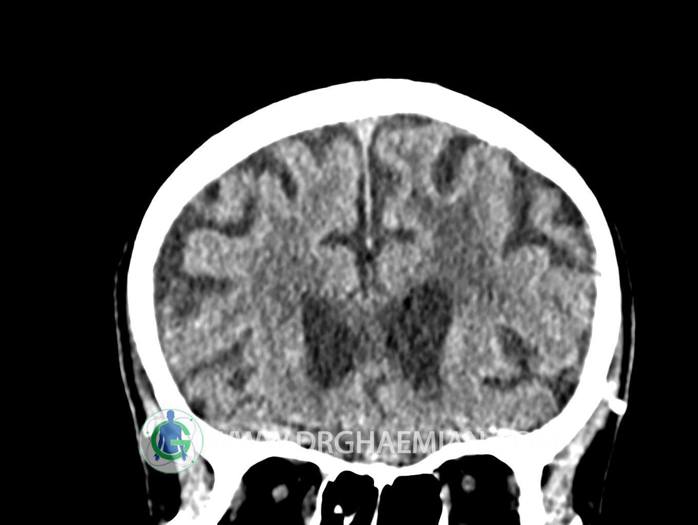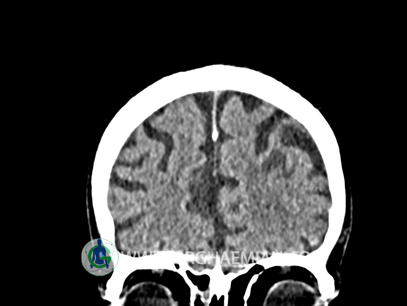 سی تی اسکن مغز با استفاده از اشعات ایکس تصاویری از سر که شامل جمجعه، مغز، حفره های چشمی و سینوس ها است ایجاد می کند. در این کیس آتروفی مغز، تغییرات ایسکمیک و انفارکت مشاهده شده.