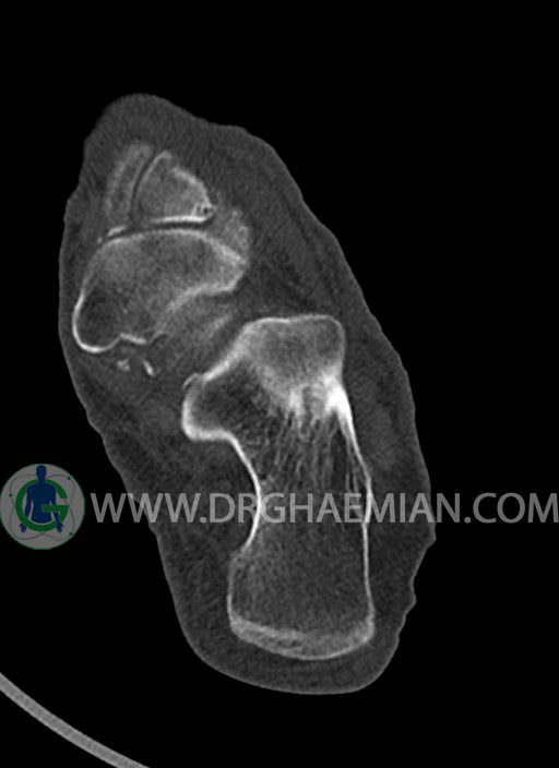 سی تی اسکن مچ پا تصاویری عرضی از مچ پا ایجاد می کند. این روش تصویربرداری از اشعه ایکس برای ایجاد تصاویر استفاده می کند. در این کیس آرتریت مچ پا به همراه سلولیت و تورم نسج نرم در اطراف مچ پا مشاهده می شود.