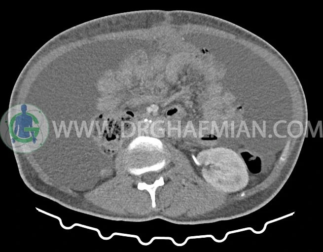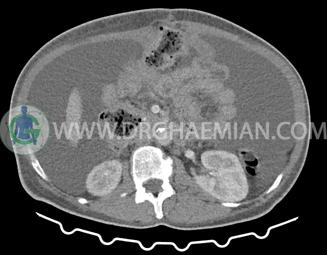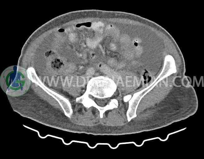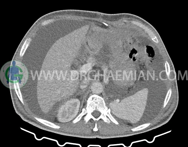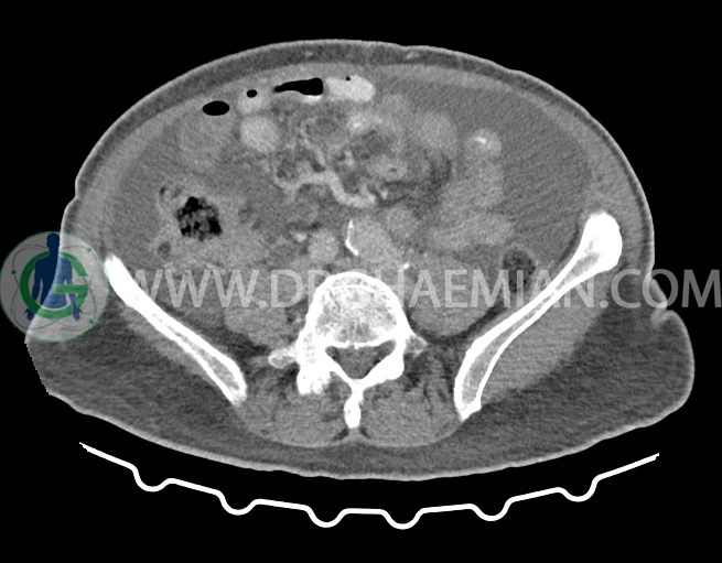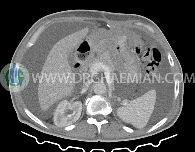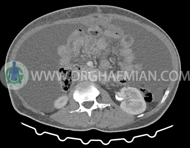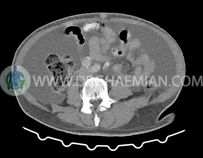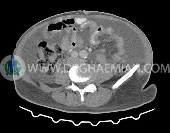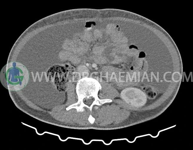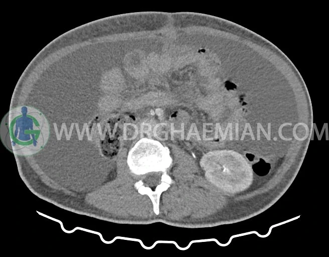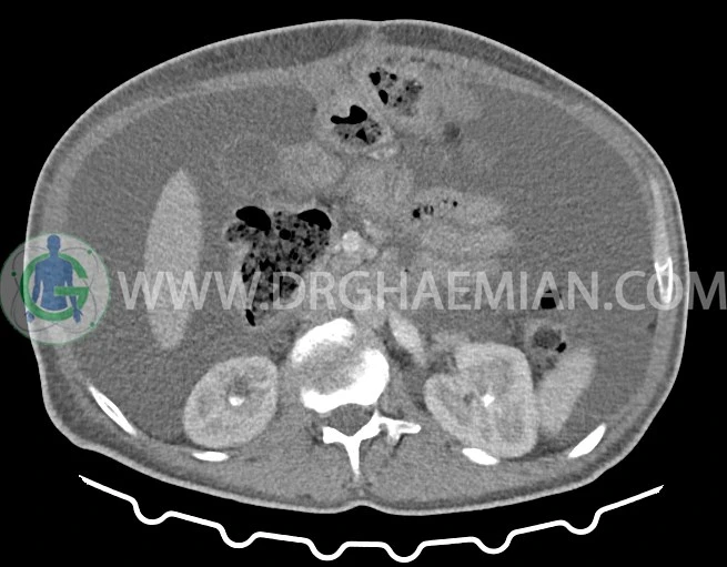 سی تی اسکن لگن از تششعات برای ایجاد تصاویر عرضی مقطعی از نایحه بین استخوان های لگن است. در این کیس آسیت شدید، ادم دیواره شکم، افزایش ضخامت دیواره کاردیا و تنه معده، کلسیفیکاسیون دیواره آئورت، اسکولیوز و بزرگی پروستات دیده می شود.