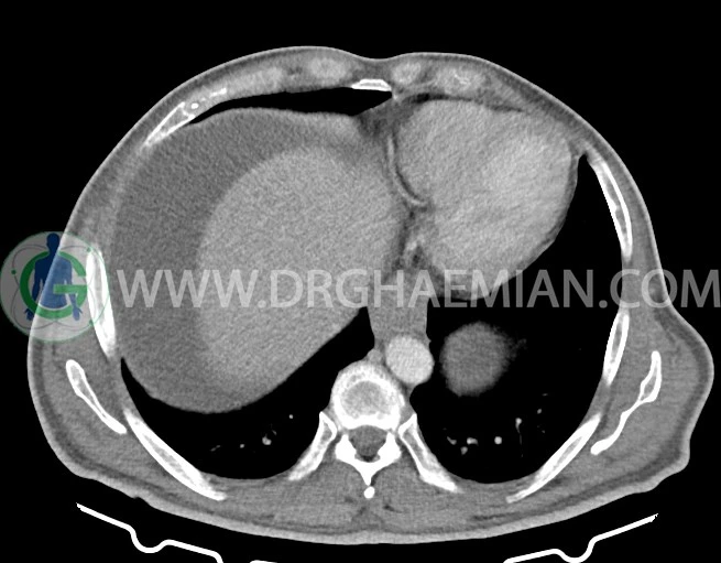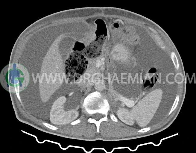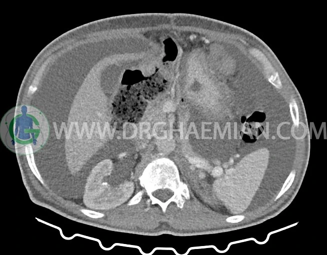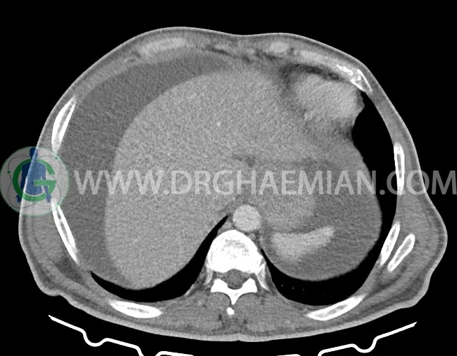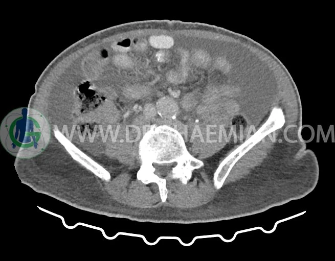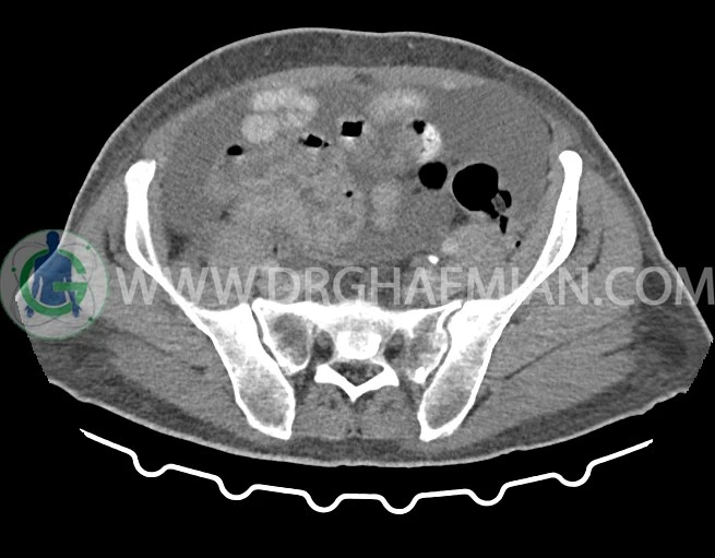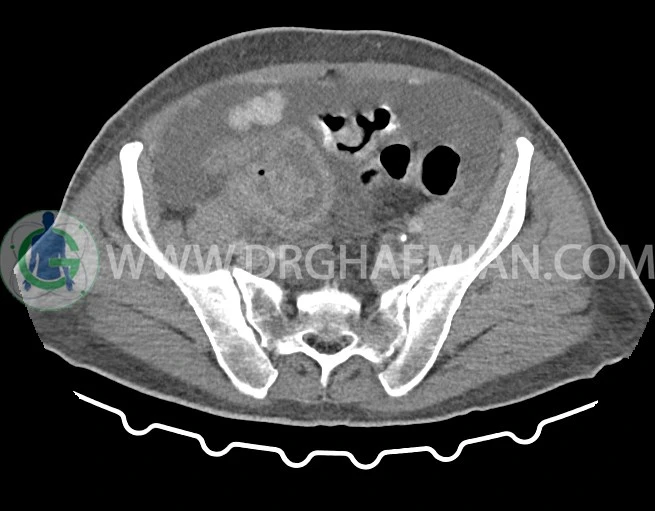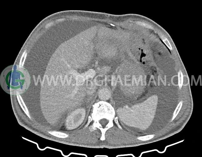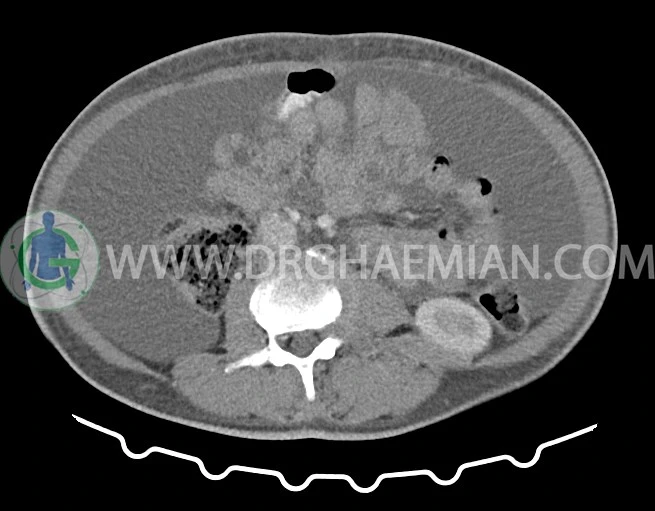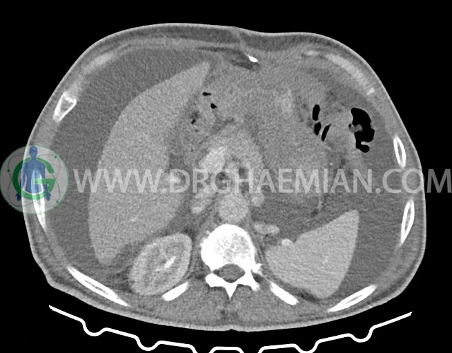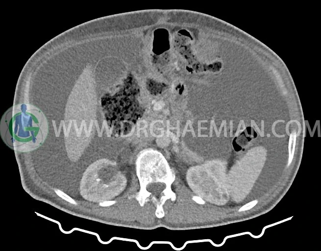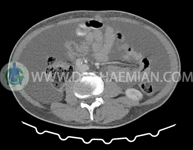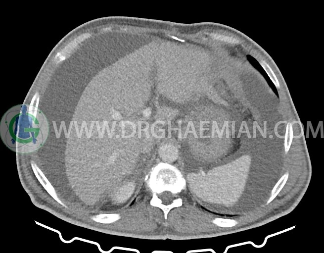 سی تی اسکن لگن از تششعات برای ایجاد تصاویر عرضی مقطعی از نایحه بین استخوان های لگن است. در این کیس آسیت شدید، ادم دیواره شکم، افزایش ضخامت دیواره کاردیا و تنه معده، کلسیفیکاسیون دیواره آئورت، اسکولیوز و بزرگی پروستات دیده می شود.