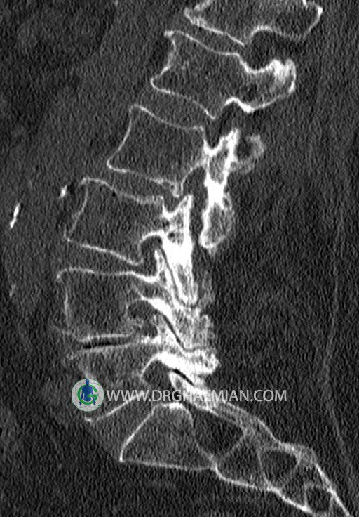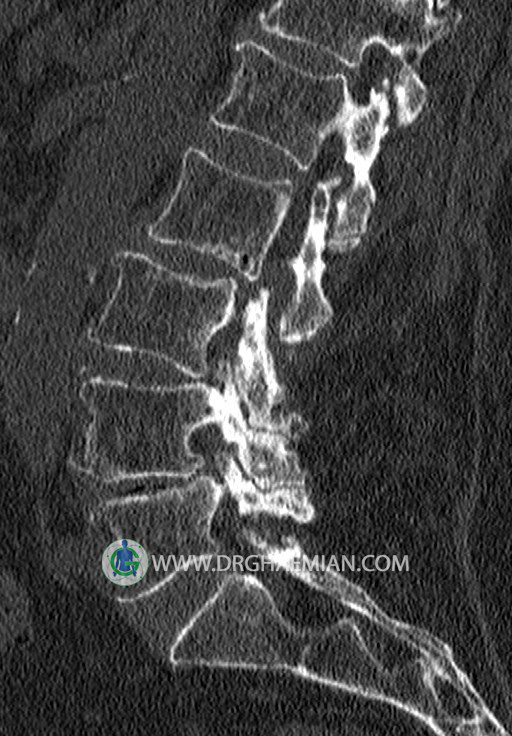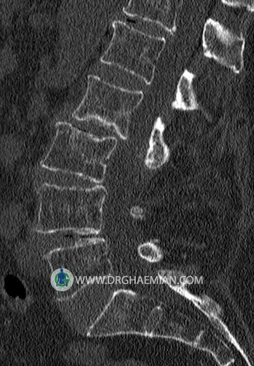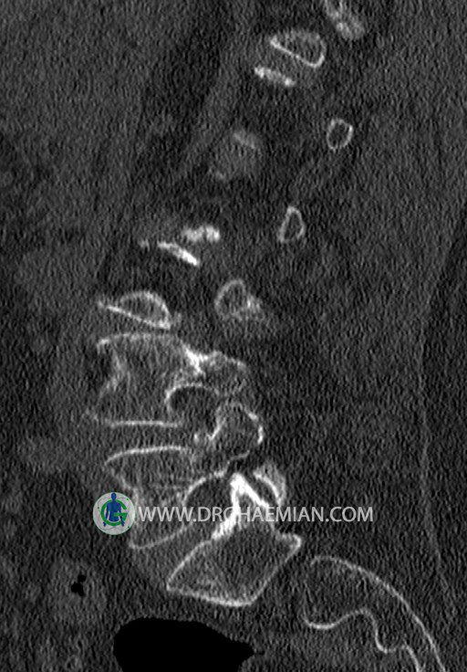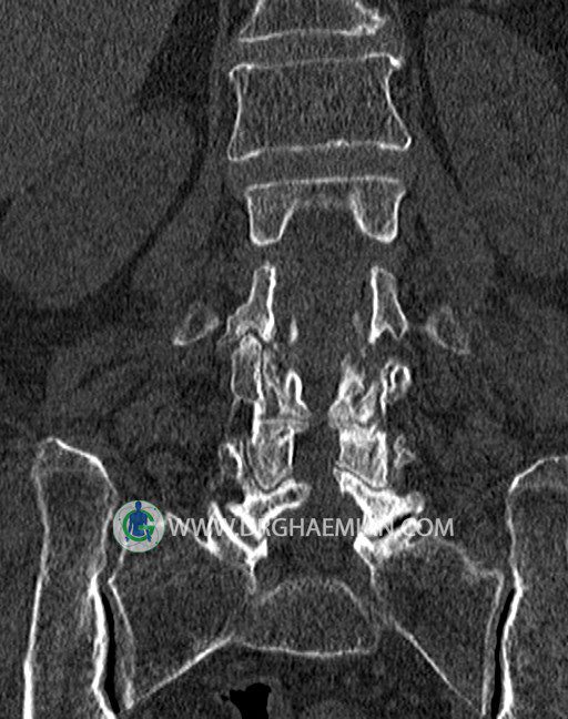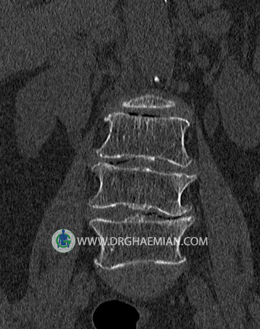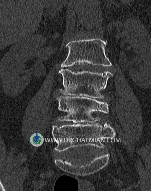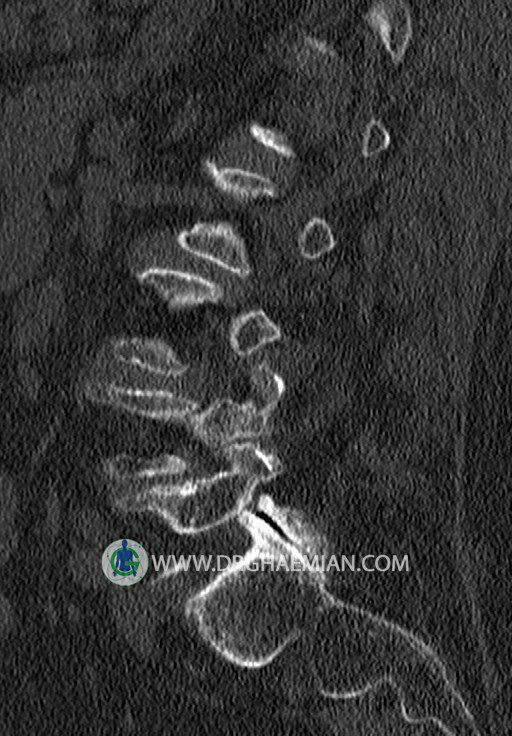 سی تی اسکن اسپيرال از قسمت تحتاني T12 تا انتهاي S3 (مولتي ديدکتور 16 بامقاطع ظريف و بازسازي هاي ساژيتال و کرونال و 3D):