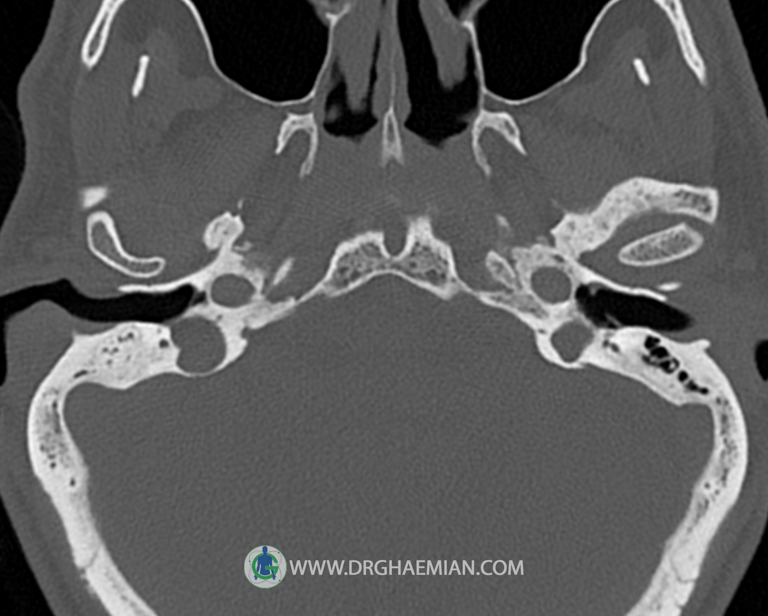 سی تی اسکن مغز با استفاده از اشعات ایکس تصاویری از سر که شامل جمجعه، مغز، حفره های چشمی و سینوس ها است ایجاد می کند. در این کیس اروژن گوش در استخوان های گوش میانی و دیواره لترال گوش راست، نشانه های ماستوئیدیت مزمن و افزایش ذخامت پرده تمپیان دیده می شود.