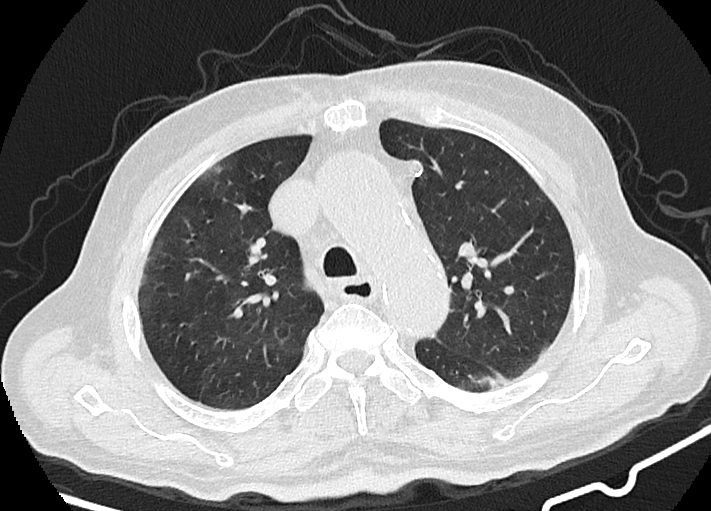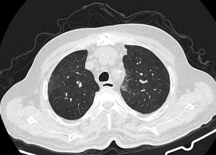 در HRCT از ريه ها(اسپيرال ، مولتي ديتکتور 16، مقاطع اگزيال با ضخامت 1mm بدون فاصله ) ، بدون كنتراست تزريقي :