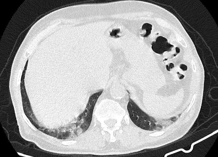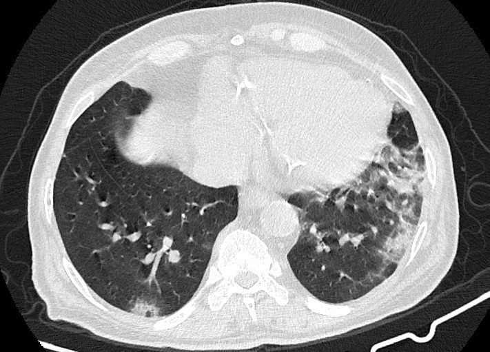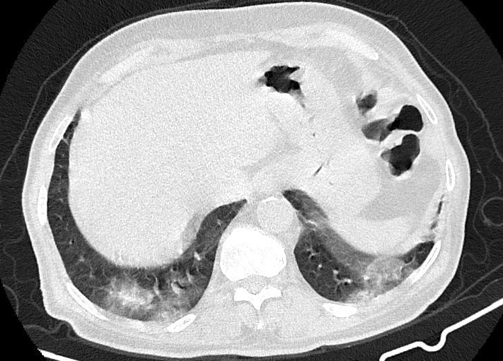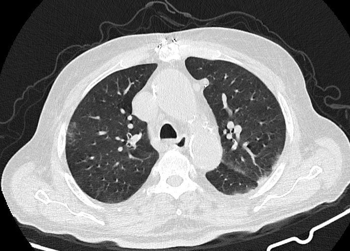 -Ground glass opacities Patchy پراکنده در ريه ها مشهود است که مطرح کننده Viral pneumonia مي باشد . ( با درگيري 20 درصد حجم ريه )