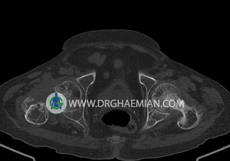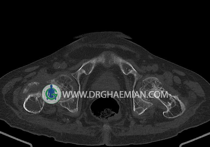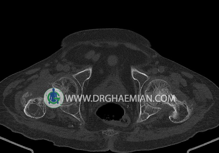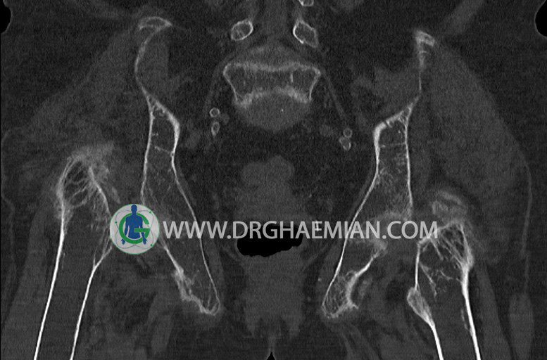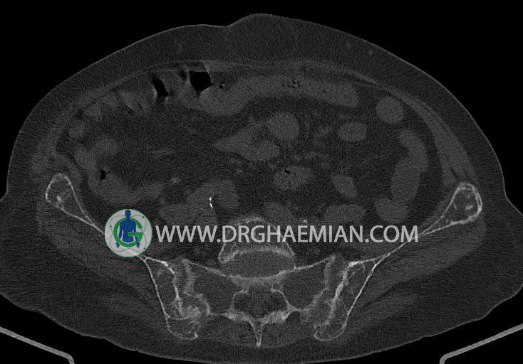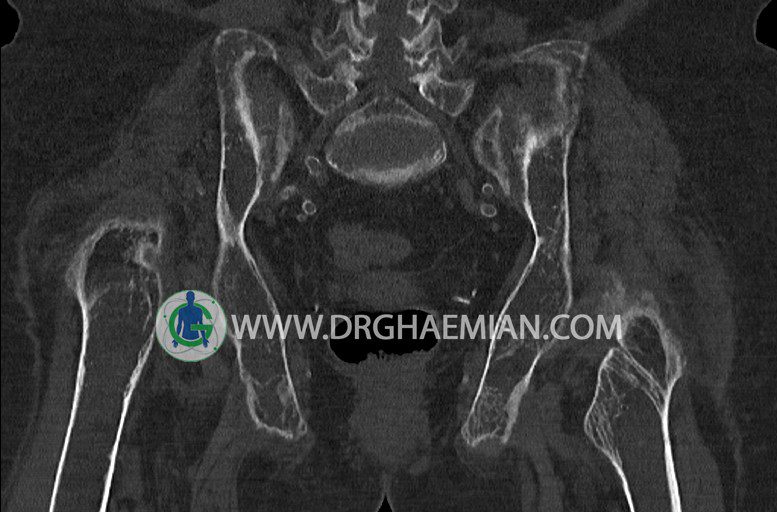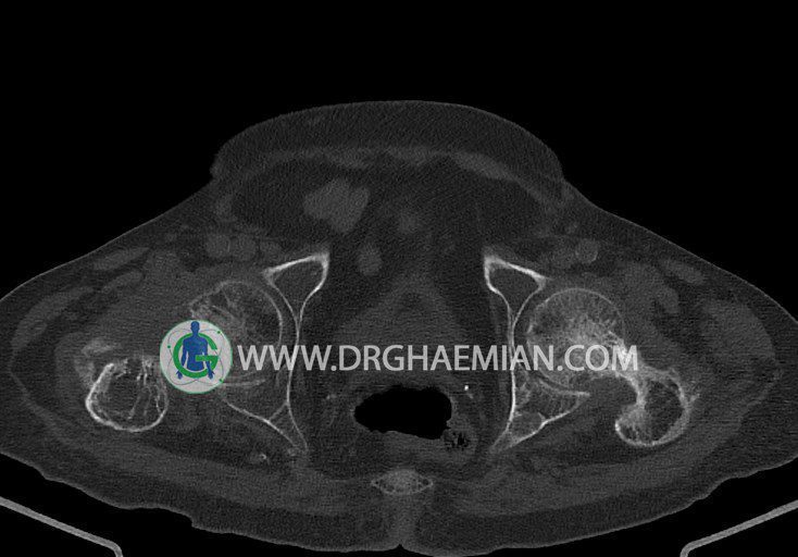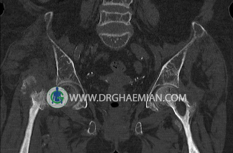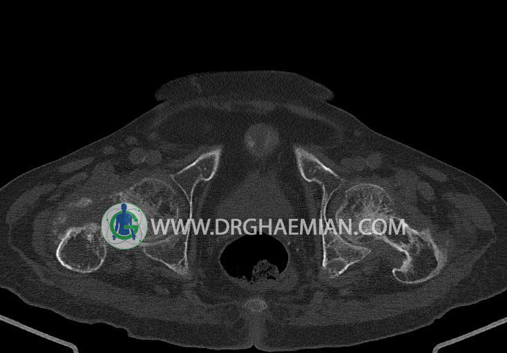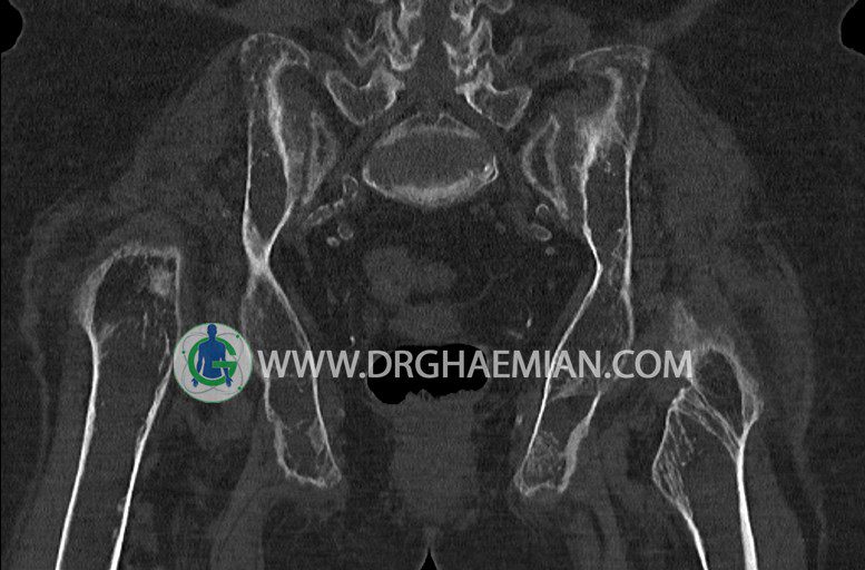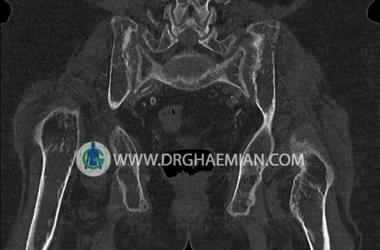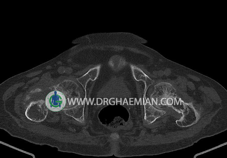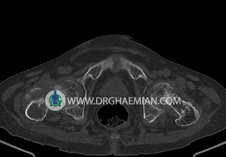 سی تی اسکن لگن یک روش تصویربرداری است که از تششعات برای ایجاد تصاویر عرضی مقطعی از نایحه بین استخوان های لگن است. در این کیس استئوپنی شدید و شکستگی و جابجایی فمور راست مشاهده می شود.