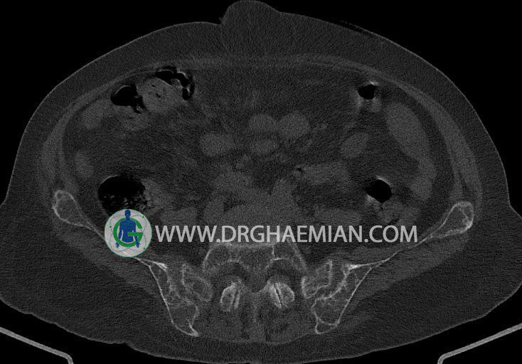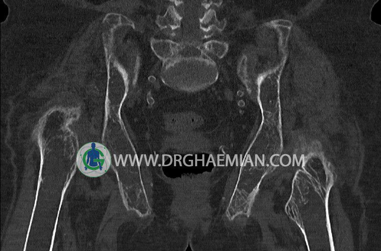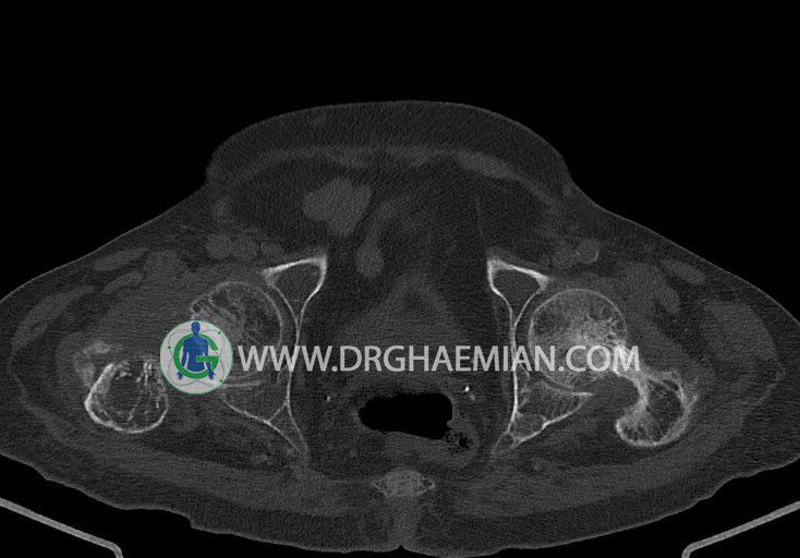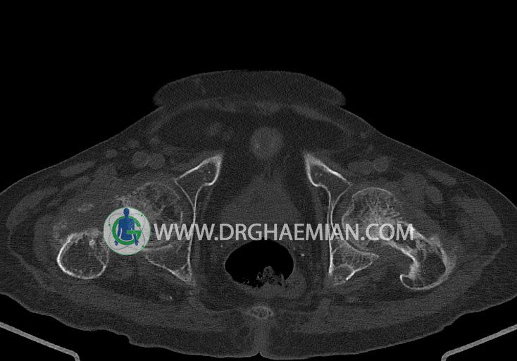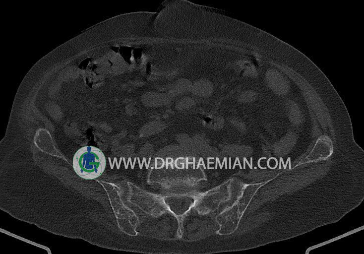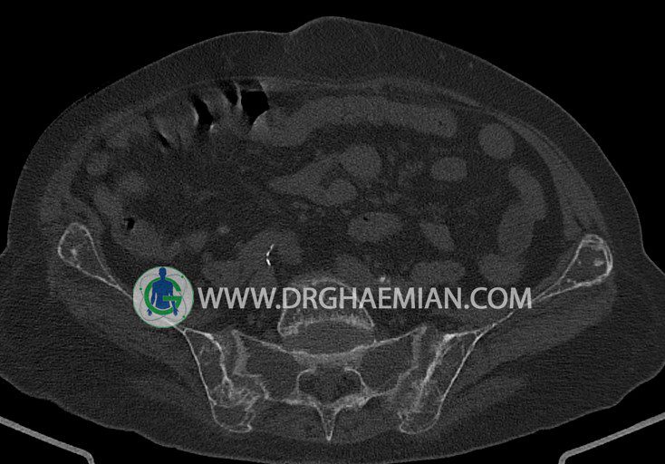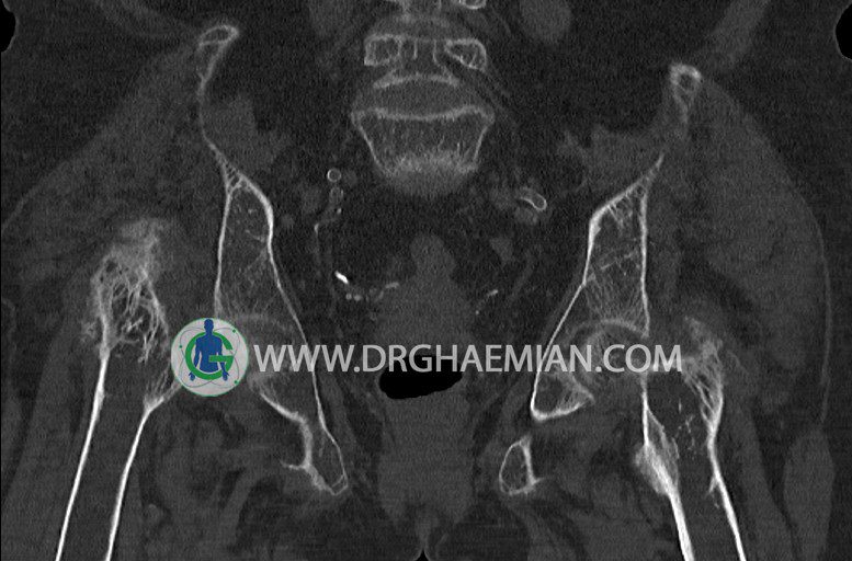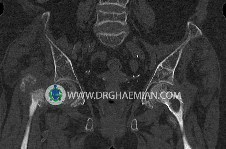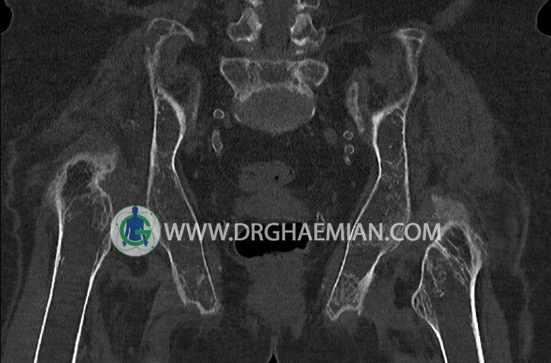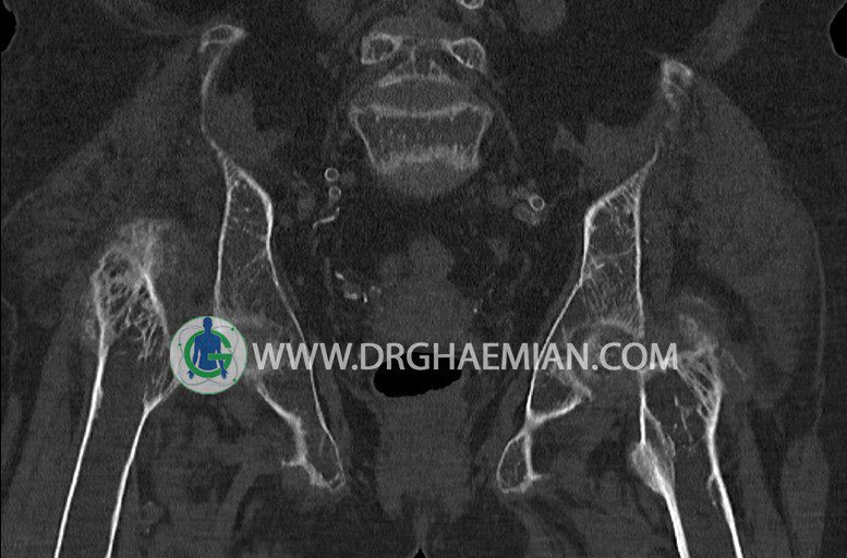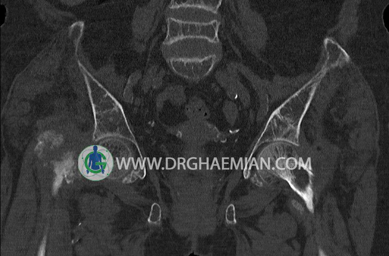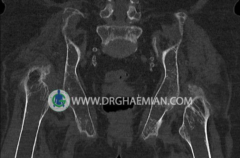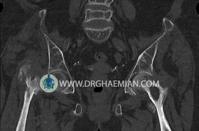 سی تی اسکن لگن یک روش تصویربرداری است که از تششعات برای ایجاد تصاویر عرضی مقطعی از نایحه بین استخوان های لگن است. در این کیس استئوپنی شدید و شکستگی و جابجایی فمور راست مشاهده می شود.
