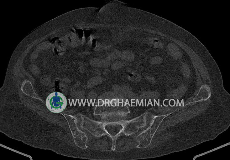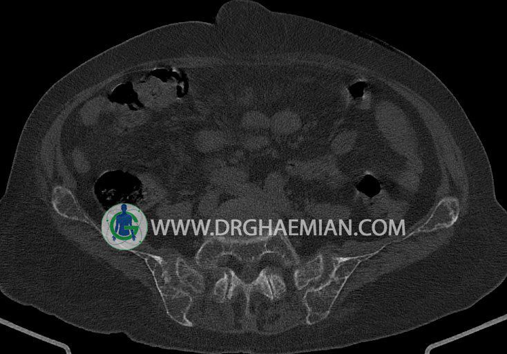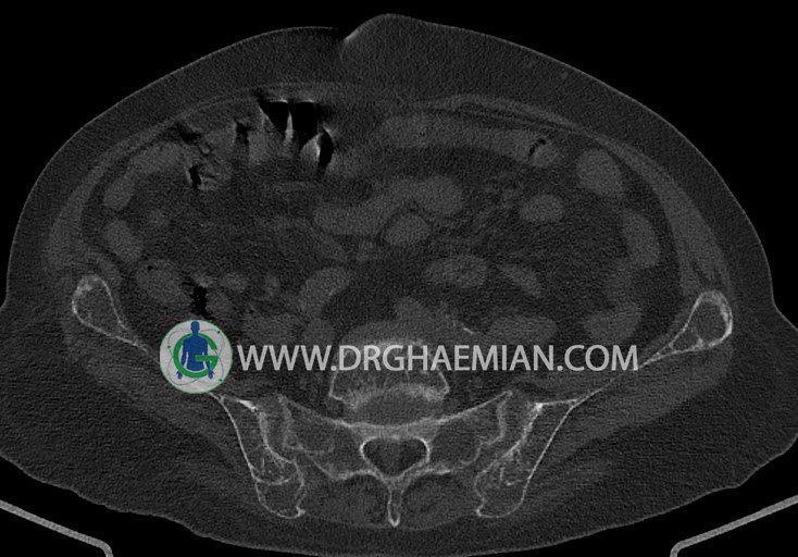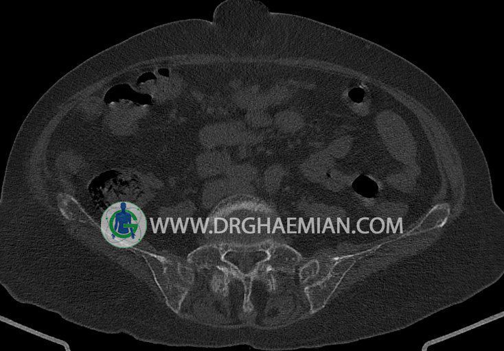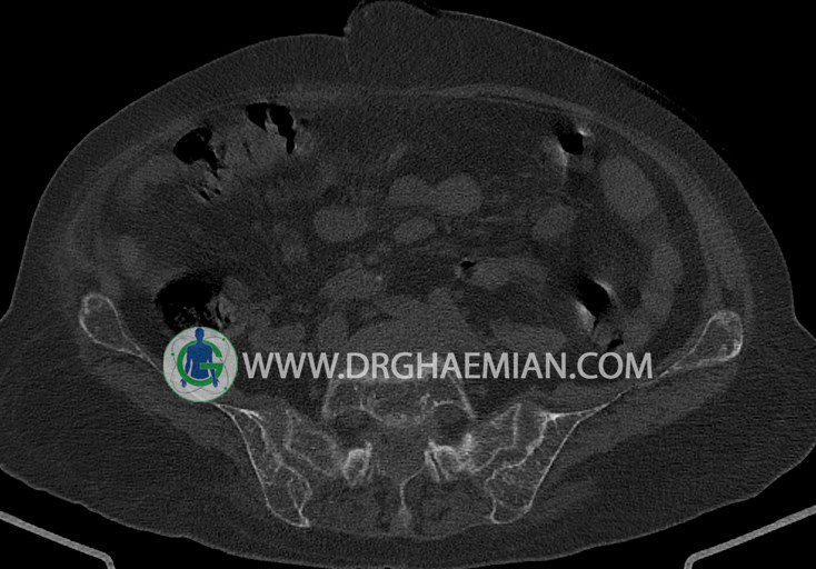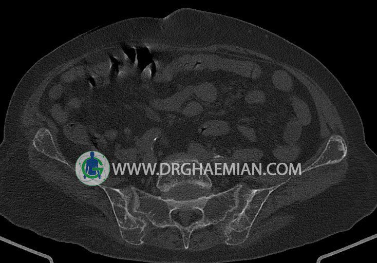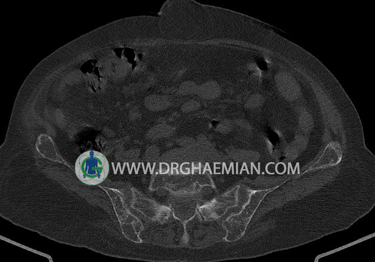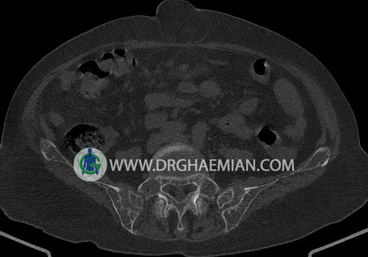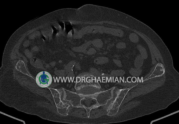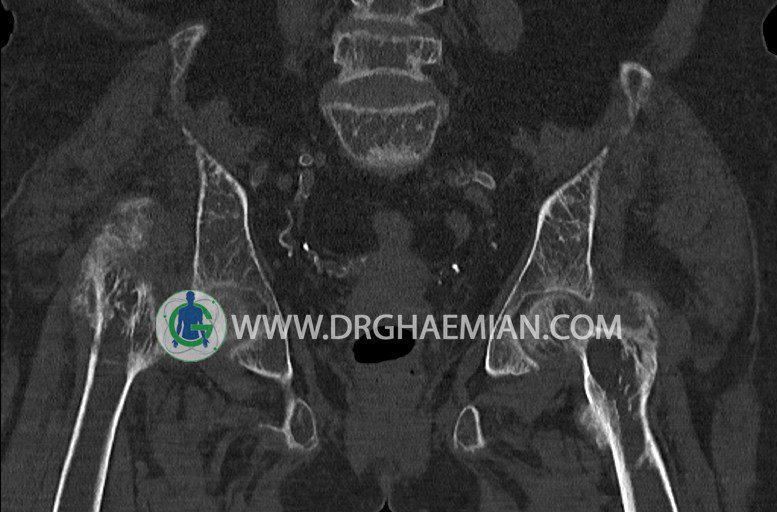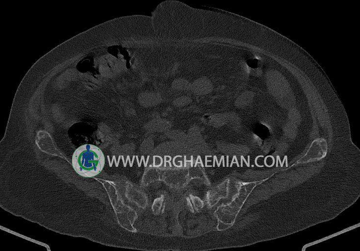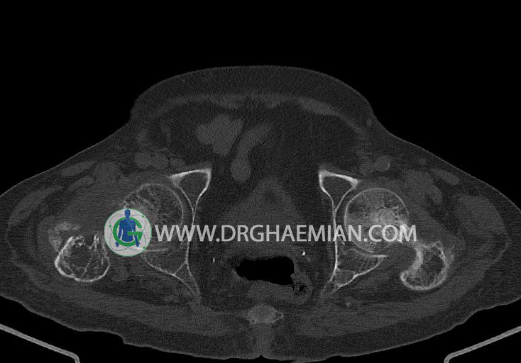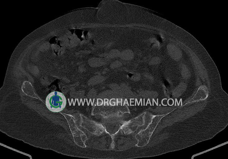 سی تی اسکن لگن یک روش تصویربرداری است که از تششعات برای ایجاد تصاویر عرضی مقطعی از نایحه بین استخوان های لگن است. در این کیس استئوپنی شدید و شکستگی و جابجایی فمور راست مشاهده می شود.