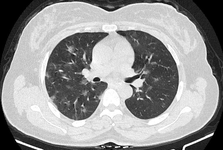 -Ground glass opacities Patchy پراکنده در ريه ها مشهود است که مطرح کننده Viral pneumonia مي باشد . ( با درگيري 20  درصد حجم ريه )