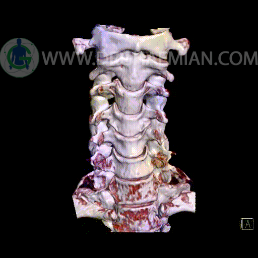 سی تی اسکن ناحیه بالایی ستون فقرات یک روش تصویربرداری است که با استفاده از تشعات ایکس تصاویری با جزییات از ناحیه خالی گردن ایجاد میکند. در این کیس اسکلیوز گردن، تغییرات دیژنراتیور، استئوفیت، و کیفوز خفیف مشاهده می شود.
