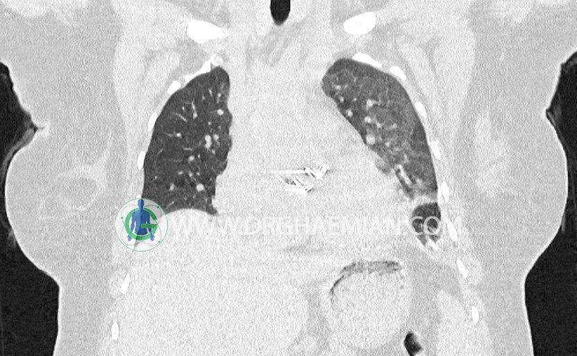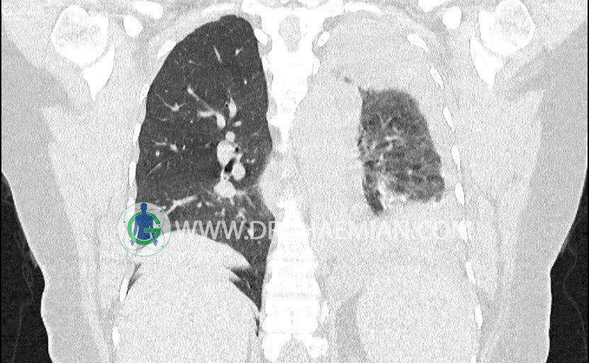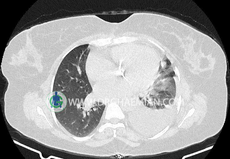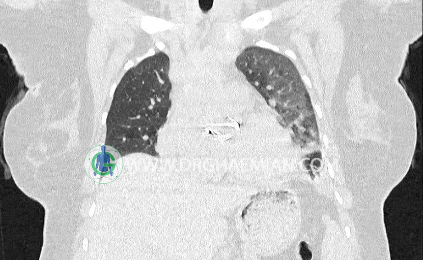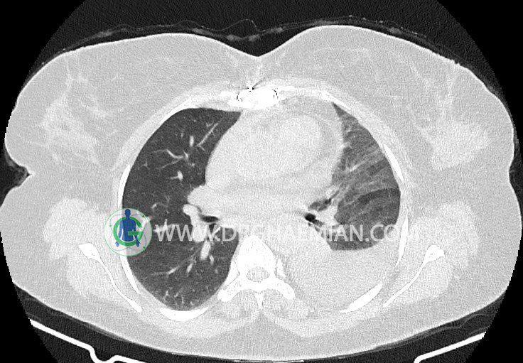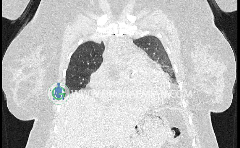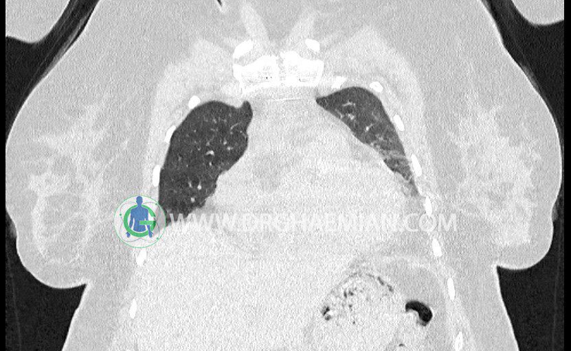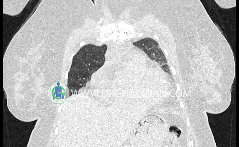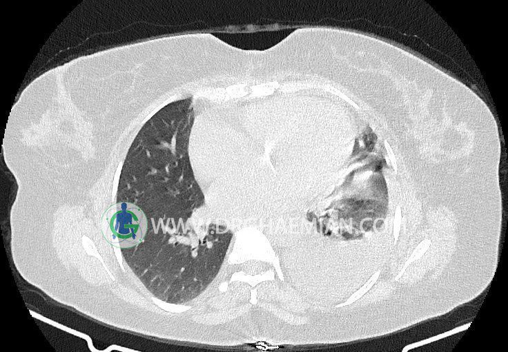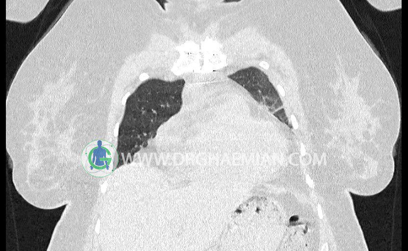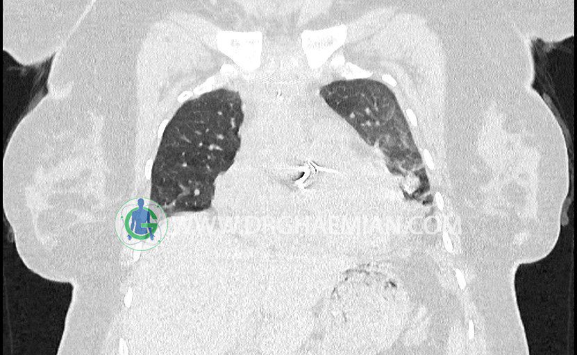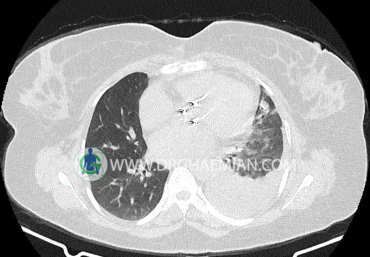 سی تی اسکن ریه یک روش تصویربرداری است که با استفاده از تششعات تصاویر عرضی مقطعی از ریه و بالا تنه ایجاد می کند. در این کیس نشانه های استرنوتومی مدیان و دریچه میترال و افیوژن پلور همراه با فروپاشی سمت چم مشاهده می شود.