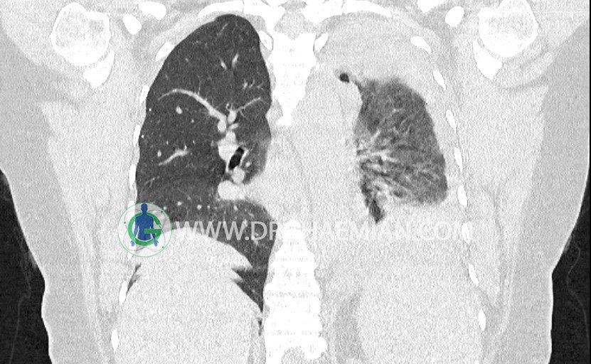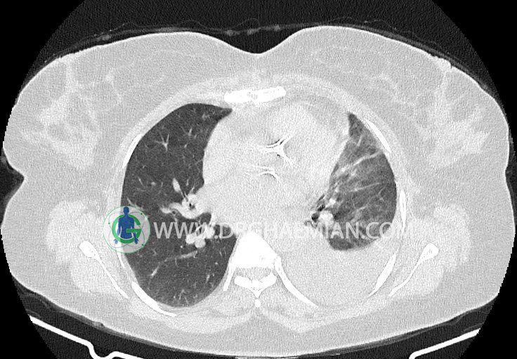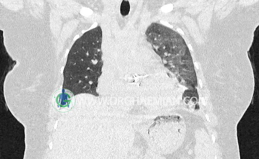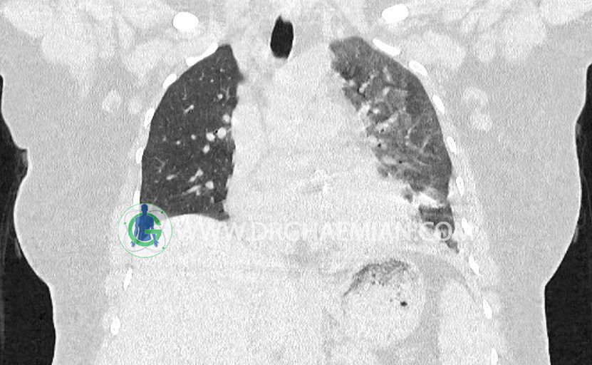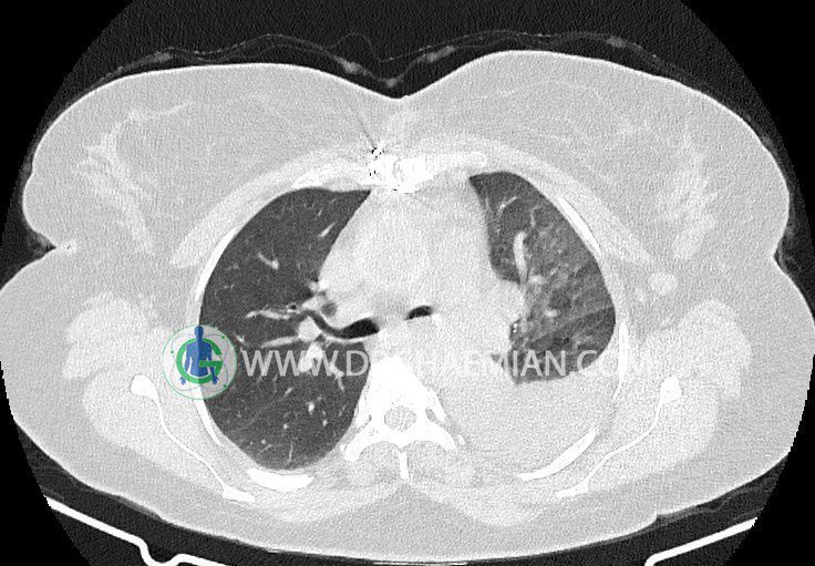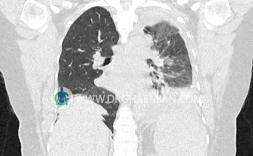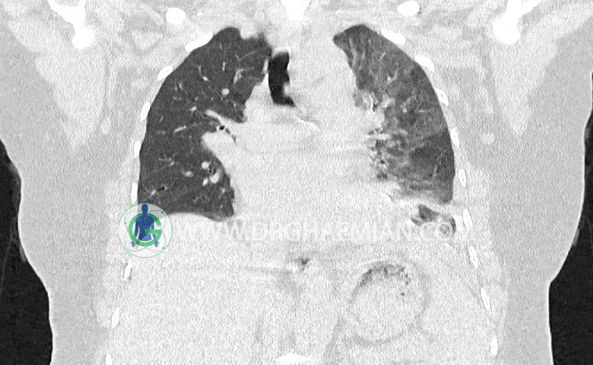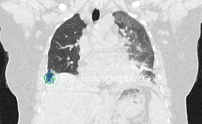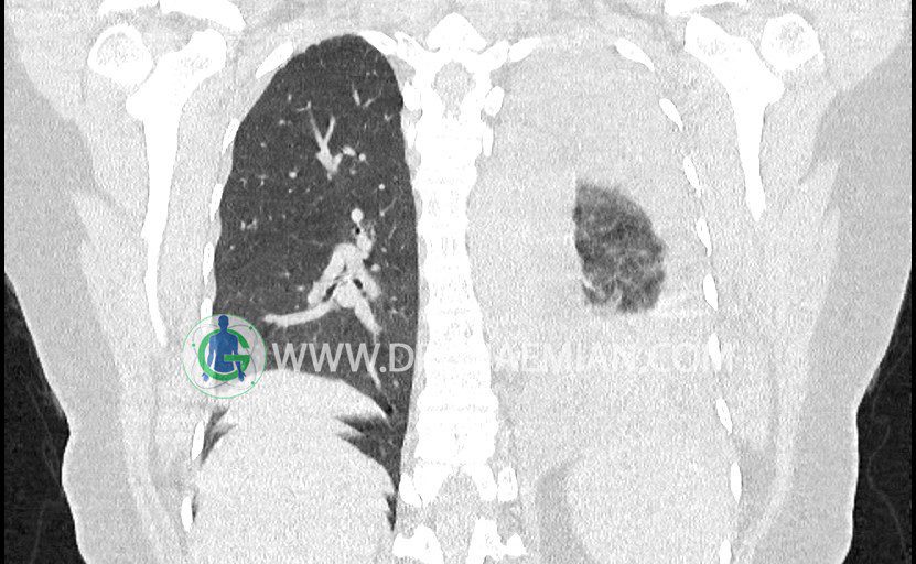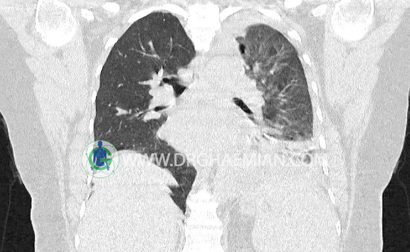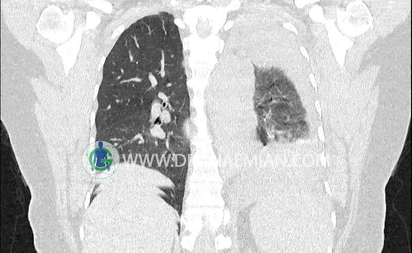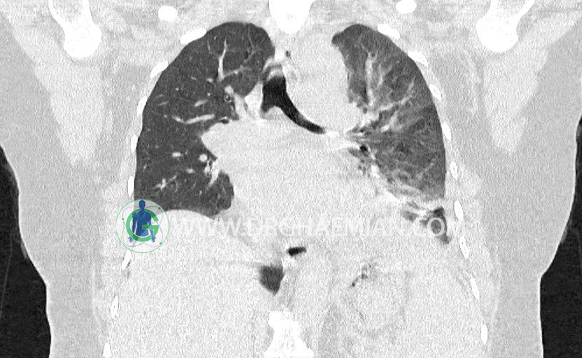 سی تی اسکن ریه یک روش تصویربرداری است که با استفاده از تششعات تصاویر عرضی مقطعی از ریه و بالا تنه ایجاد می کند. در این کیس نشانه های استرنوتومی مدیان و دریچه میترال و افیوژن پلور همراه با فروپاشی سمت چم مشاهده می شود.
