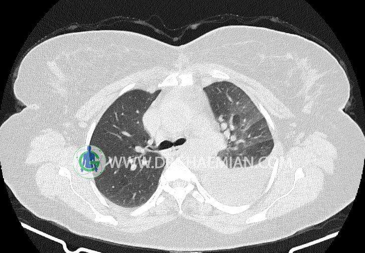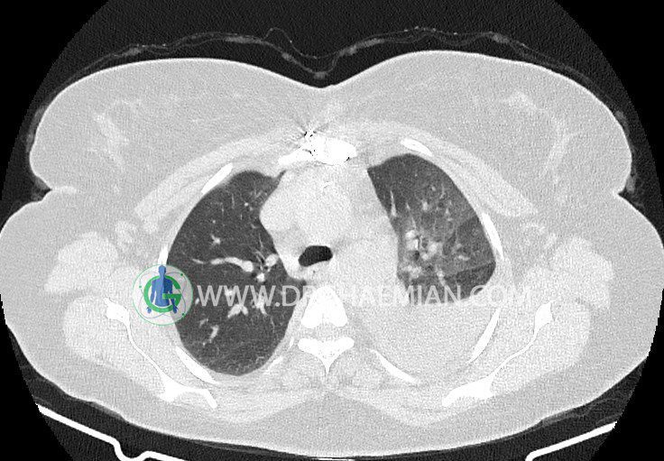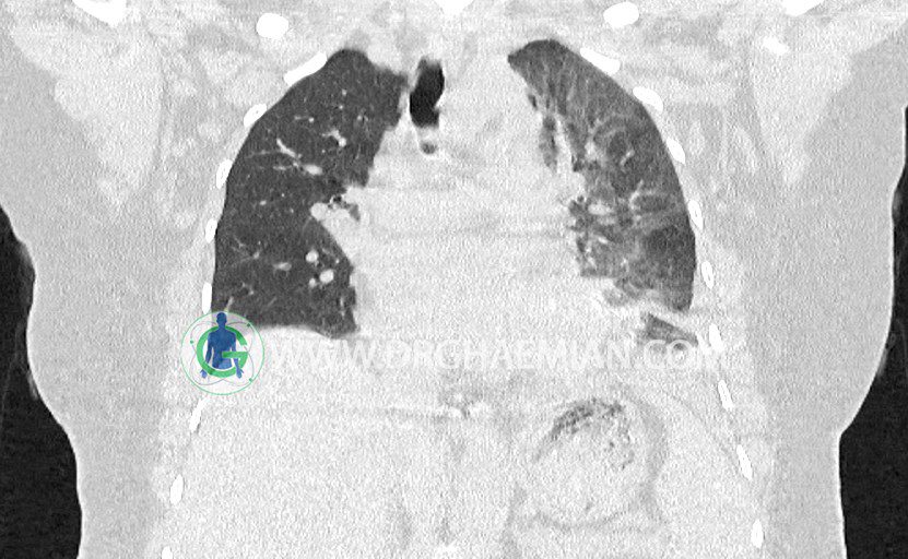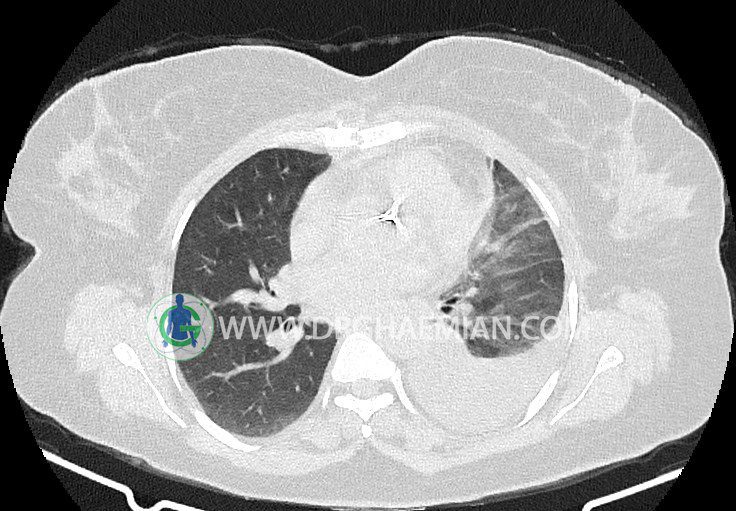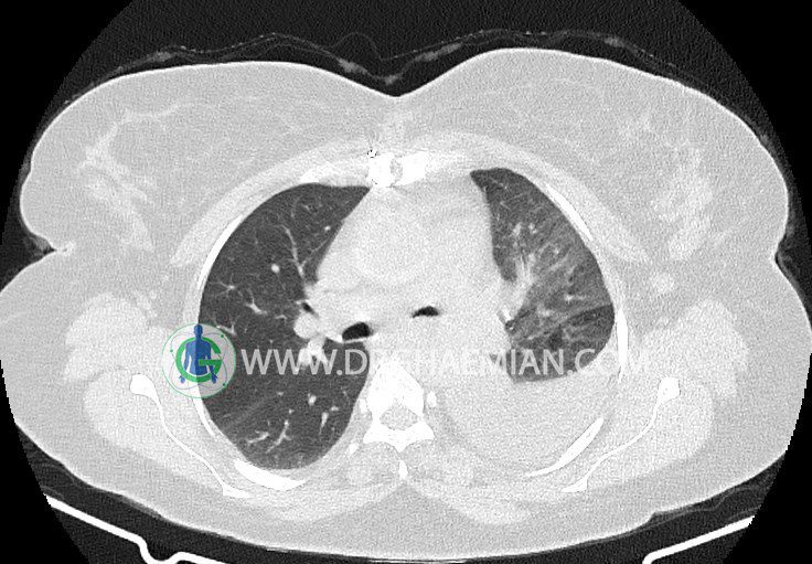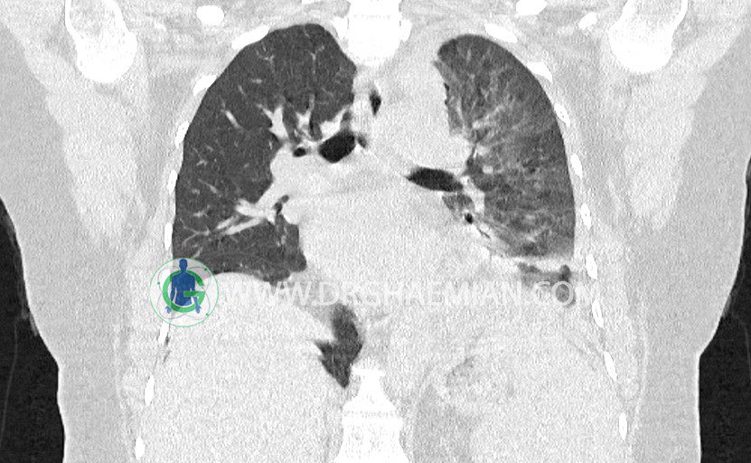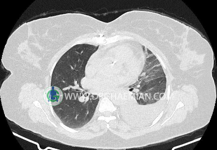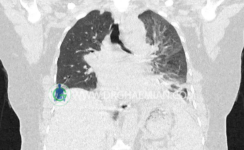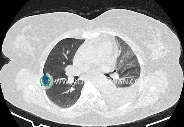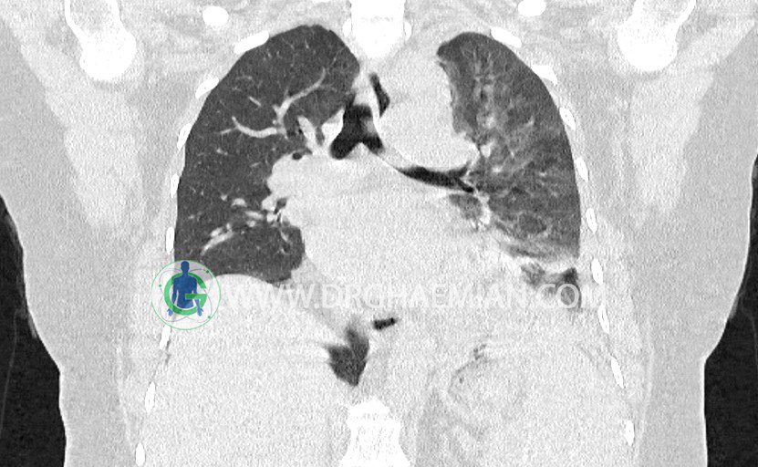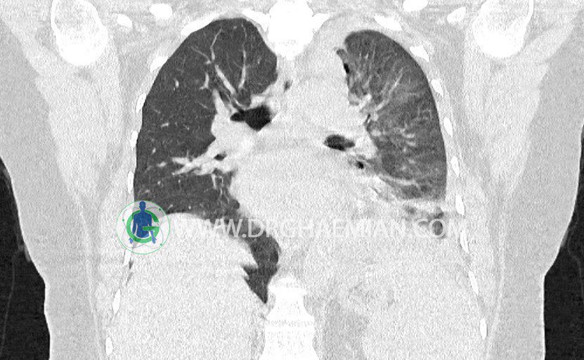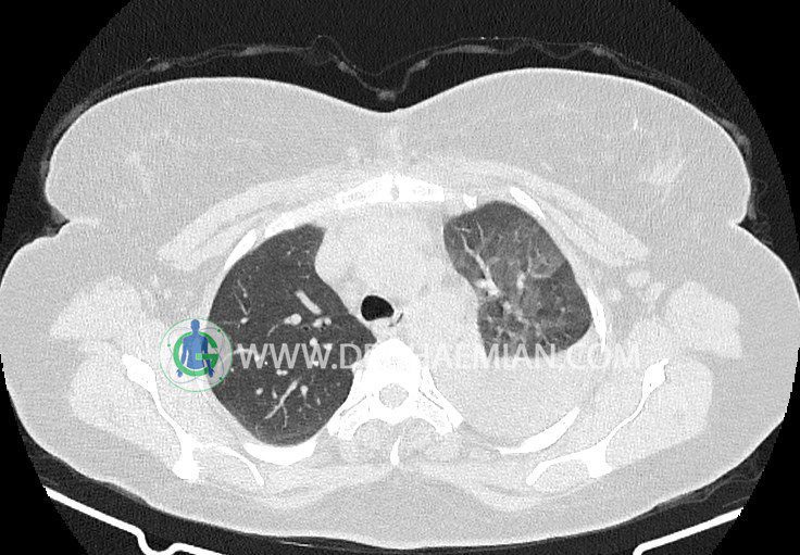 سی تی اسکن ریه یک روش تصویربرداری است که با استفاده از تششعات تصاویر عرضی مقطعی از ریه و بالا تنه ایجاد می کند. در این کیس نشانه های استرنوتومی مدیان و دریچه میترال و افیوژن پلور همراه با فروپاشی سمت چم مشاهده می شود.
