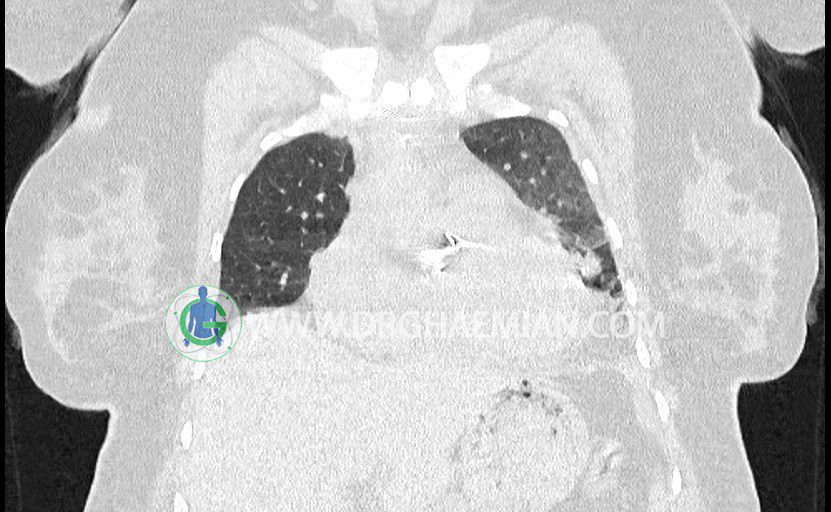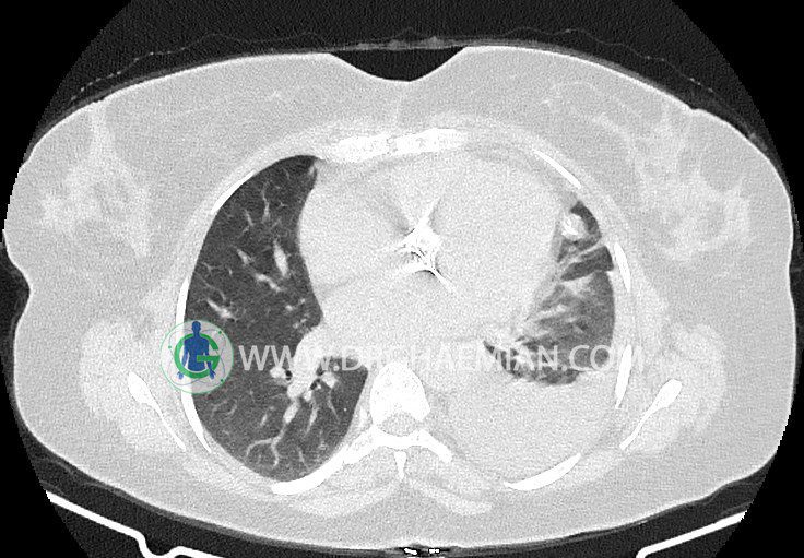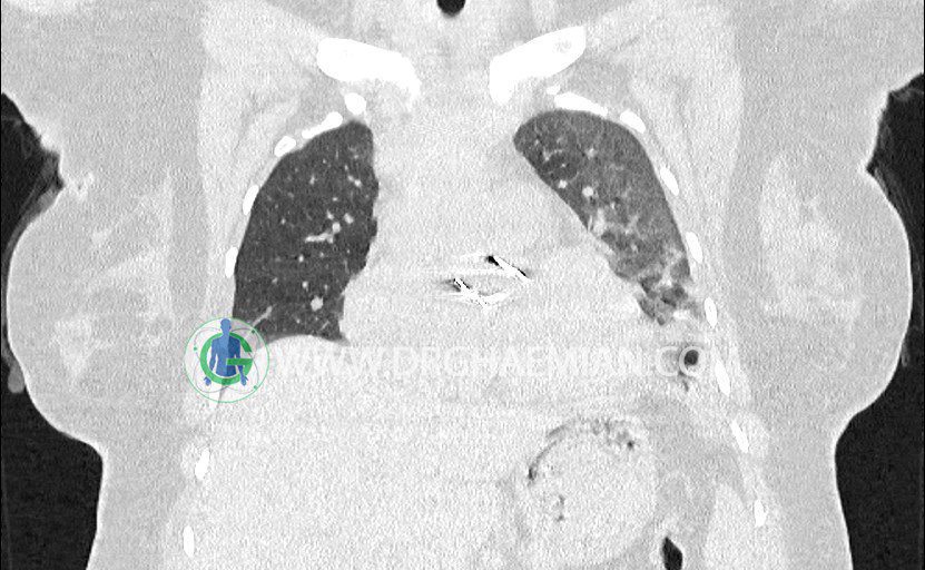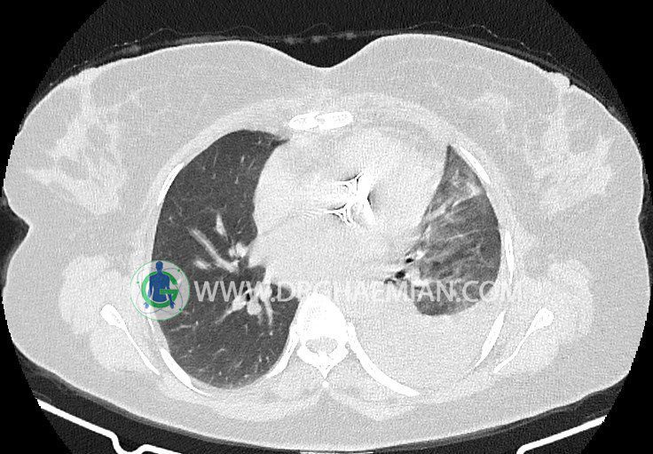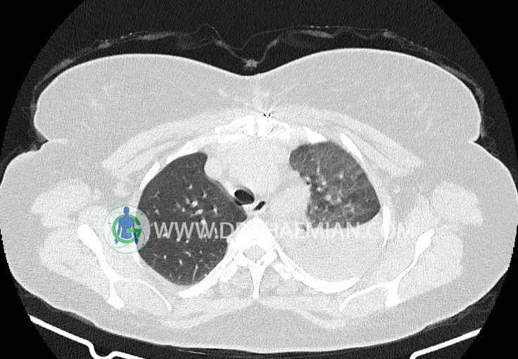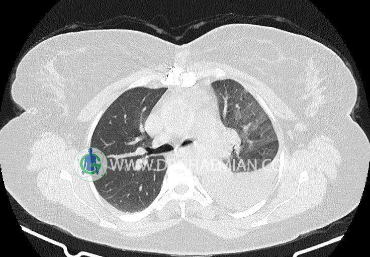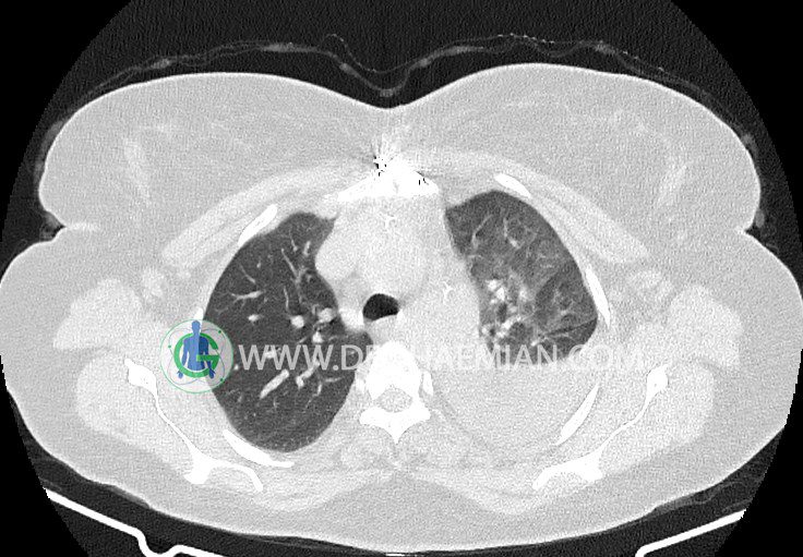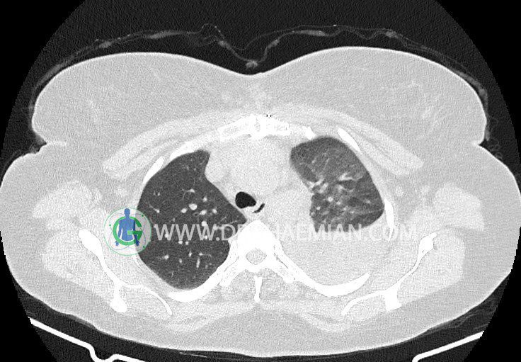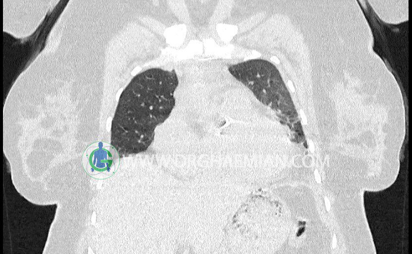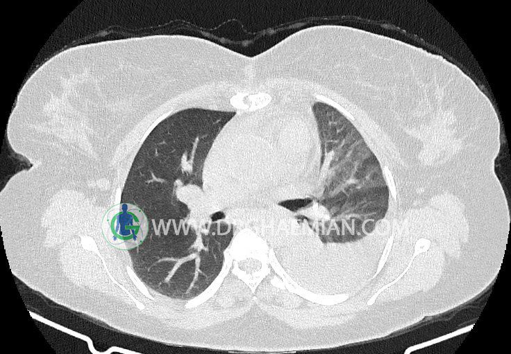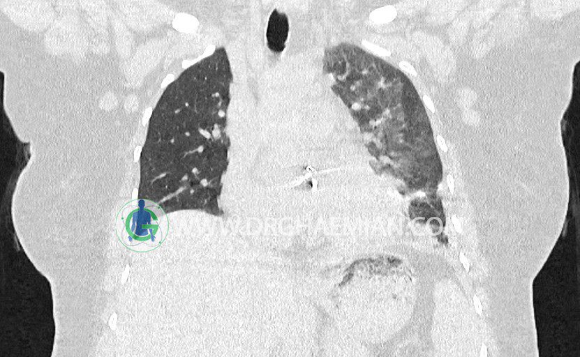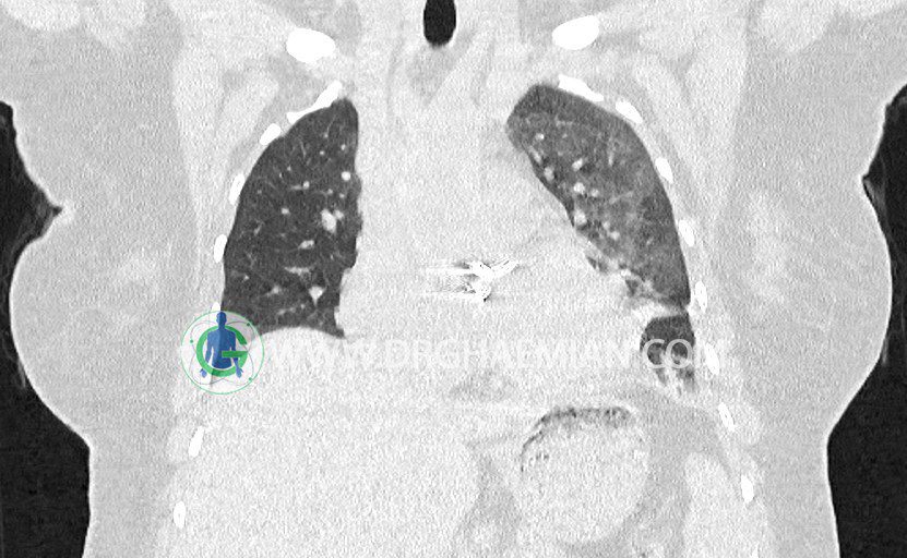 سی تی اسکن ریه یک روش تصویربرداری است که با استفاده از تششعات تصاویر عرضی مقطعی از ریه و بالا تنه ایجاد می کند. در این کیس نشانه های استرنوتومی مدیان و دریچه میترال و افیوژن پلور همراه با فروپاشی سمت چم مشاهده می شود.