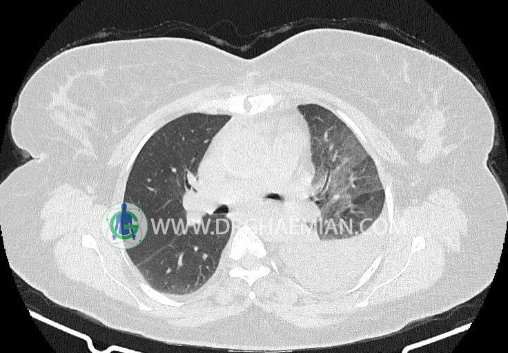 – pleural effusion چپ همراه با passive collapse لوب تحتاني چپ