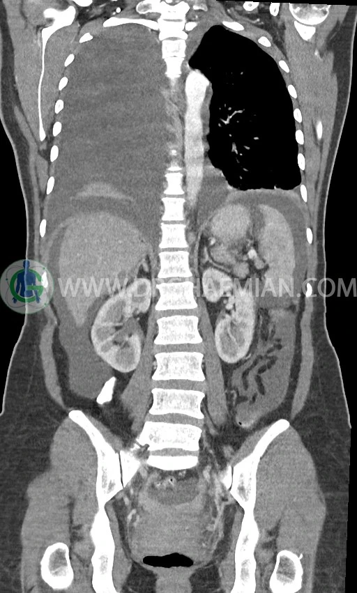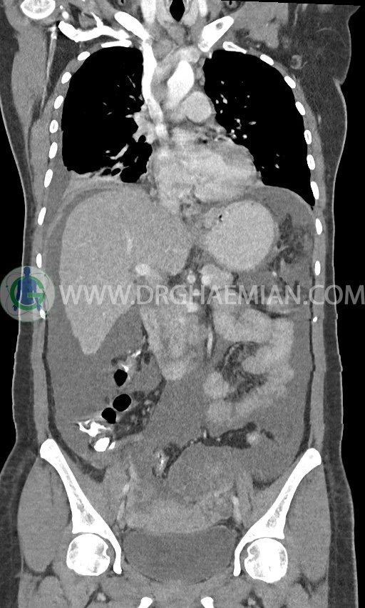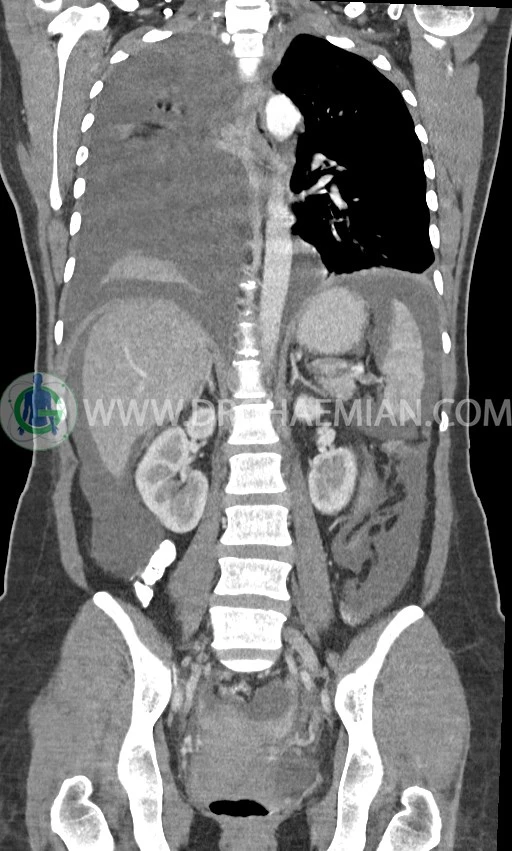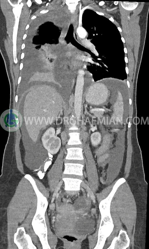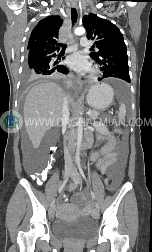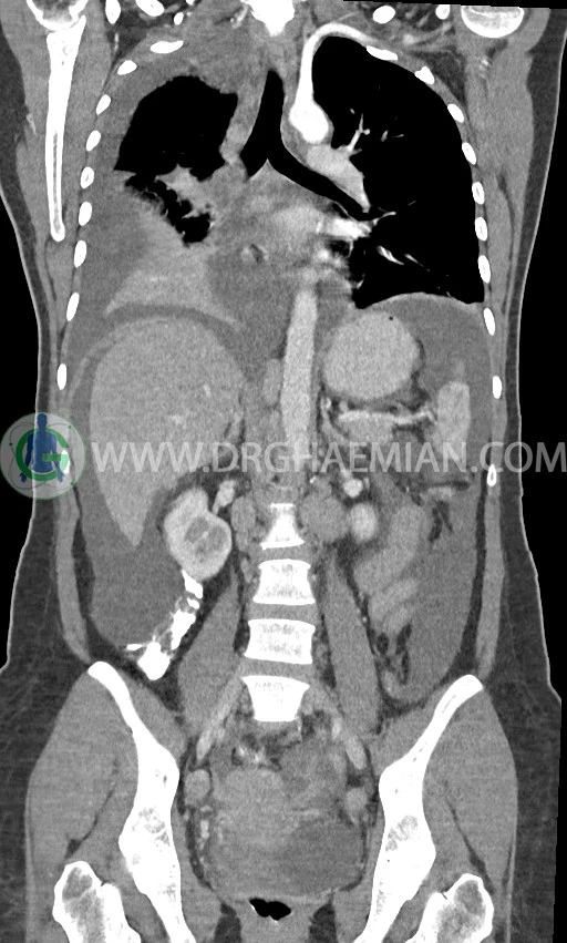 در سی تی اسکن اسپیرال ریه، مدیاستن و شکم و لگن با کنتراست خوراکی و وریدی (مولتی دیدکتور 16 با مقاطع ظریف و بازسازی های ساژیتال و کرونال) :