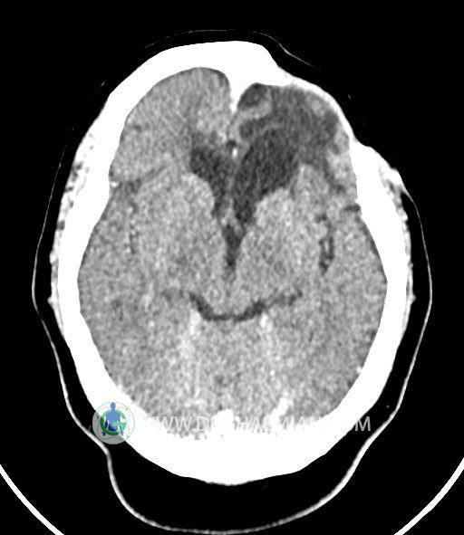 سی تی اسکن مغز با استفاده از اشعات ایکس تصاویری از سر که شامل جمجعه، مغز، حفره های چشمی و سینوس ها است ایجاد می کند. در این کیس کرانیوپلاستی و دیفیکت در استخوان فرونتال، انسفالومالاسی به همراه ونتریکولومگالی، هیدروسفالی اکس واکو، انفراکت لاکونار مزمن و فضای ویرشورابین، سلای خالی، دیفیکت در صفحه کریبریفورم و کدورت در سلول های ماستوئید مشاهده می شود.