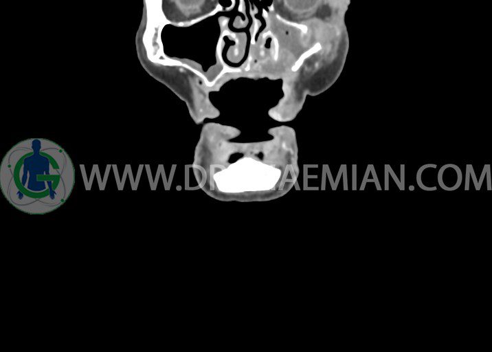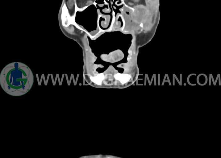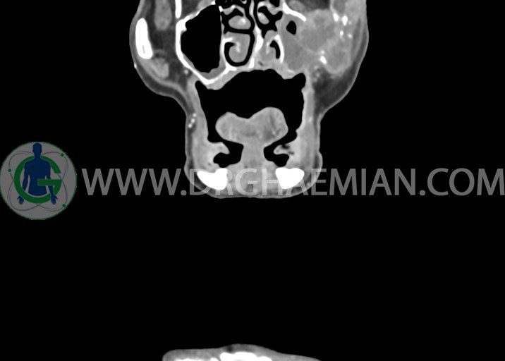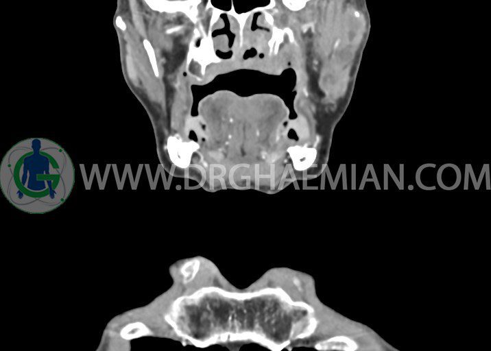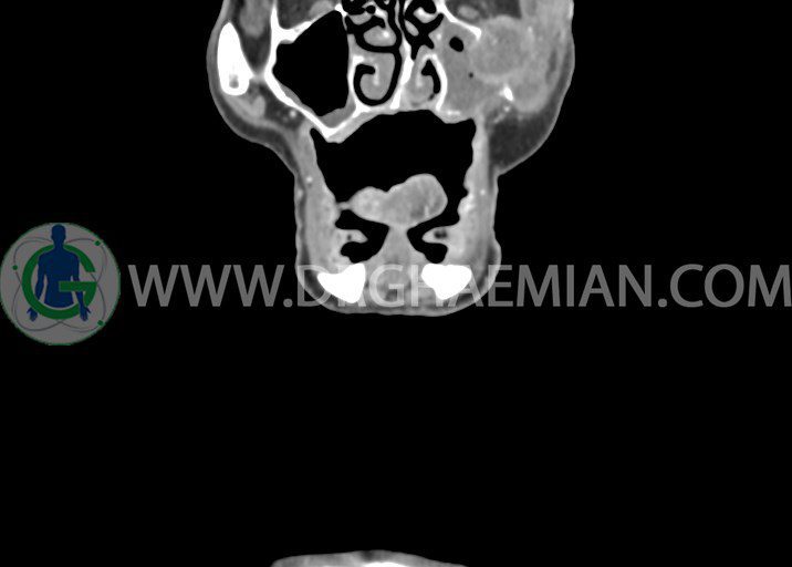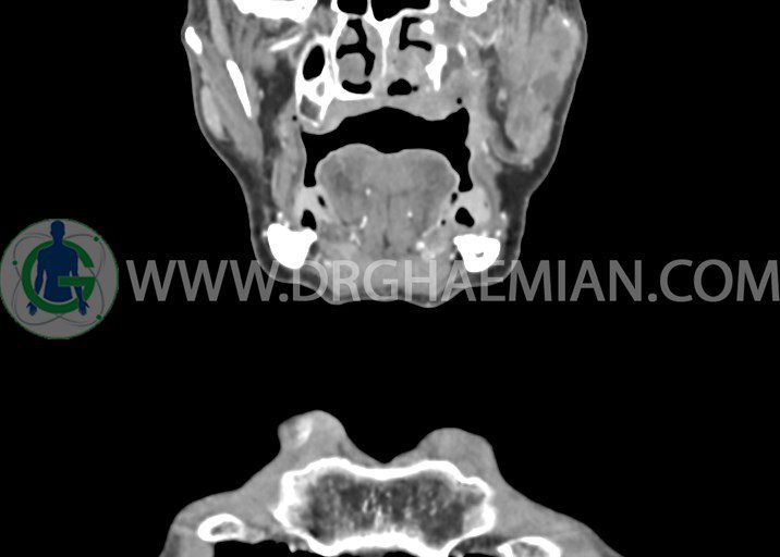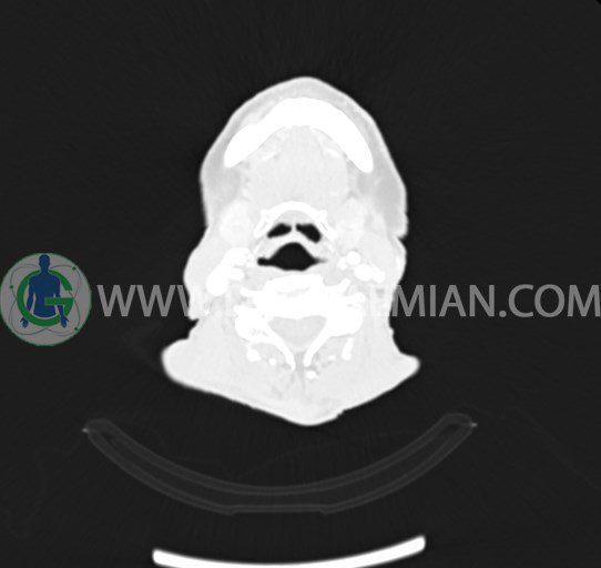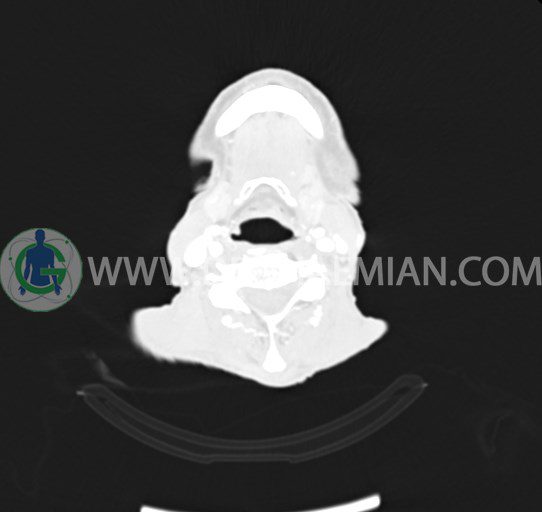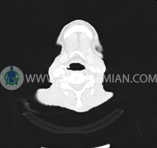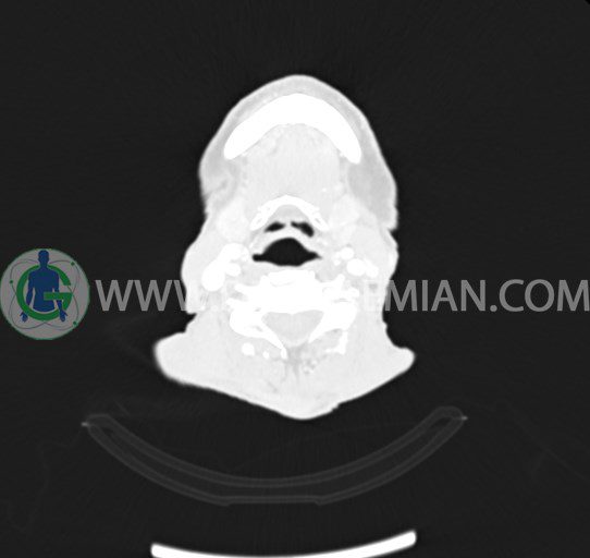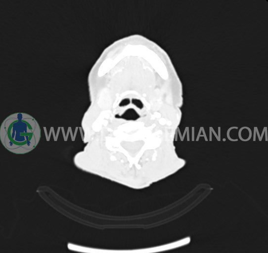 در سي تي اسکن اسپيرال از صورت و گردن با کنتراست درمقاطع آگزيال، کرونال و ساژيتال (16 اسلايس و مقاطع ظريف 1.5 mm بدون فاصله، با پنجره استخواني و نسج نرم) :