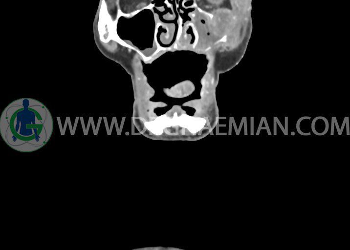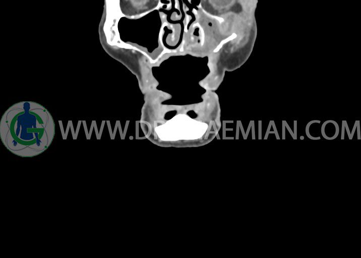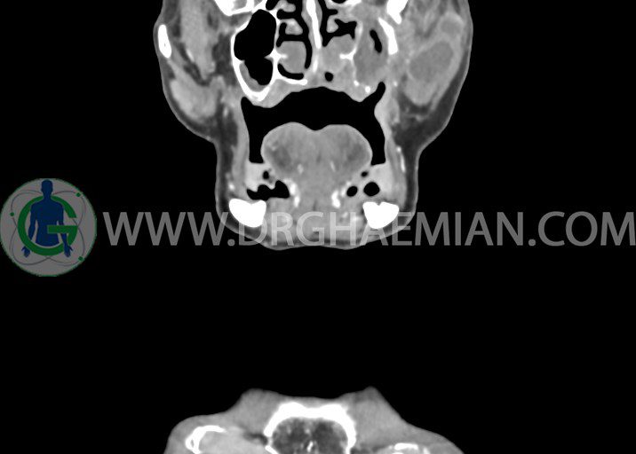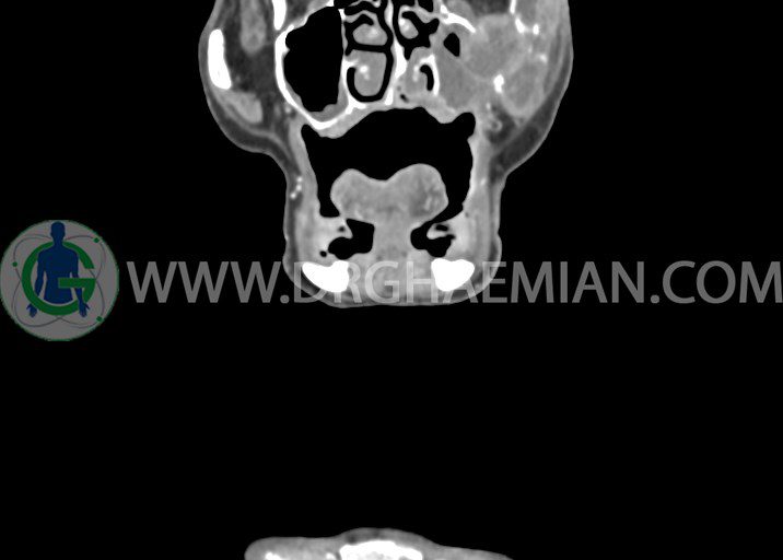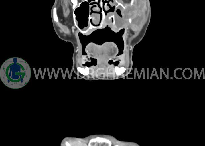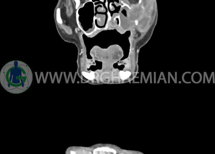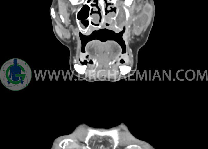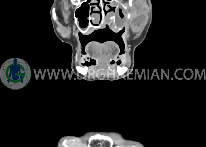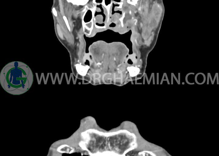 در سي تي اسکن اسپيرال از صورت و گردن با کنتراست درمقاطع آگزيال، کرونال و ساژيتال (16 اسلايس و مقاطع ظريف 1.5 mm بدون فاصله، با پنجره استخواني و نسج نرم) :